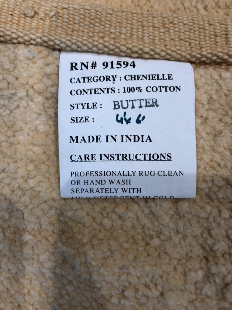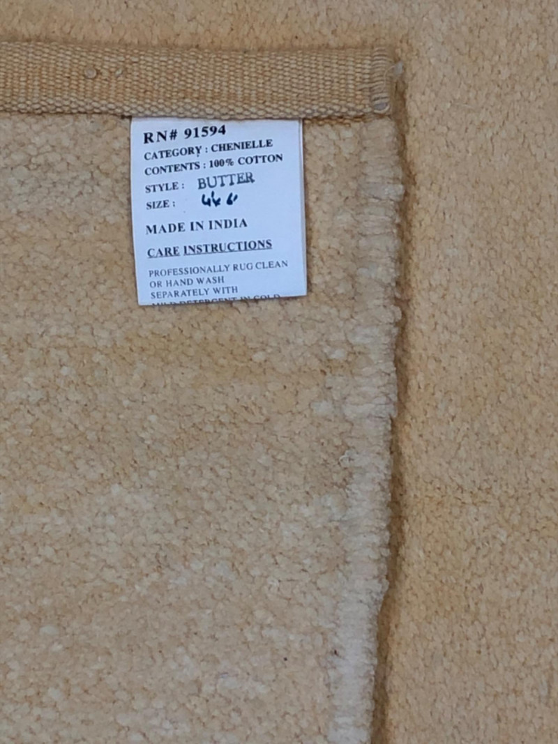 Soft and versatile 100% cotton area rug in a warm butter golden tone. Handwoven in India, this 4x6 rug features a clean flatwoven construction with a smooth matte finish—ideal for layering in Scandinavian, farmhouse, or minimalist interiors. Lightweight and flexible, it drapes easily and works beautifully in bedrooms, sunrooms, or transitional spaces. Labeled “Butter” for style and “Chenielle” for category, though the rug does not exhibit the plush, tufted texture typical of chenille weaves.