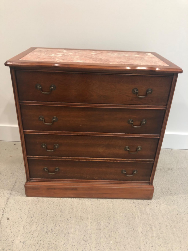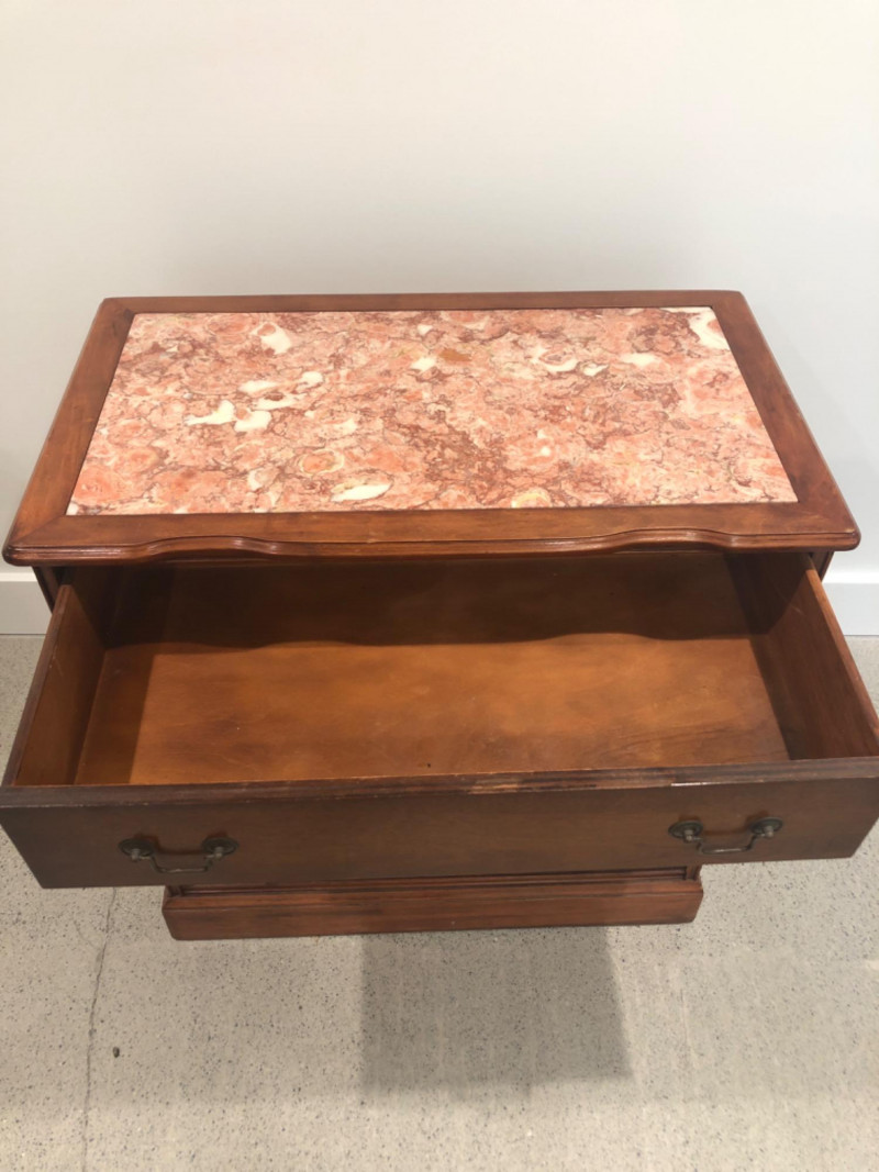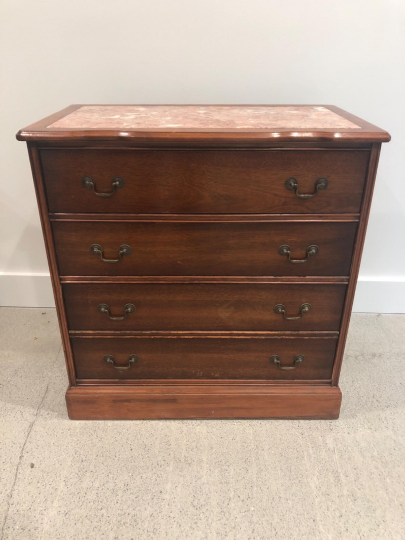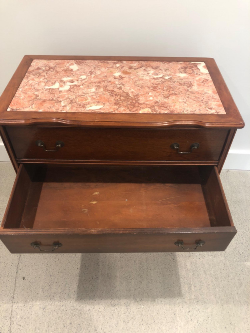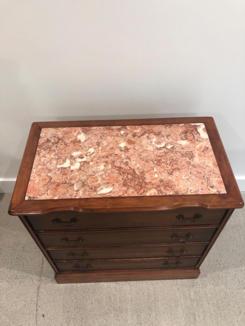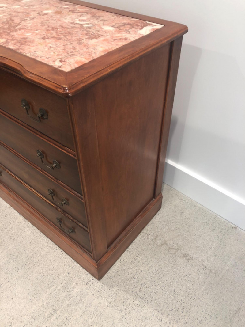 Federal style mahogany chest with three drawers and brass bail pulls. Topped with pink and white marble featuring natural veining. Solid wood construction with classic straight lines and molded edges. Two top drawers and one bottom drawer (appears to be two seperate drawers but is two-deep) offering generous storage. A versatile piece that works well in bedrooms, hallways, or living spaces. Due to Size/Fragility: This Item Is Not Eligible for Shipping. Available for Local Pickup Only.