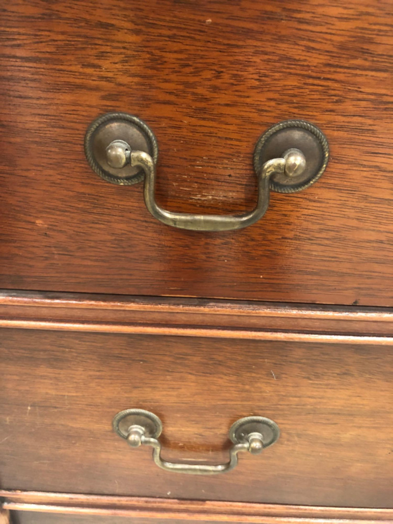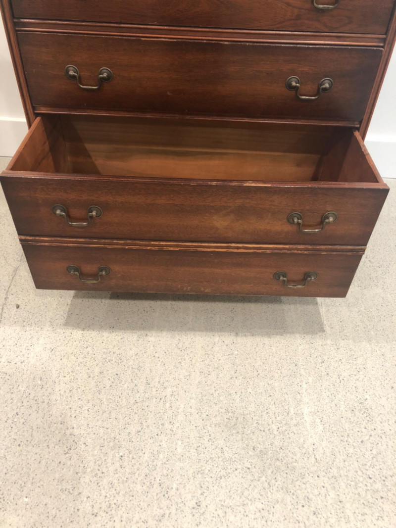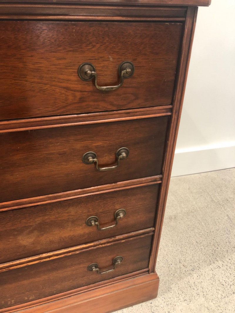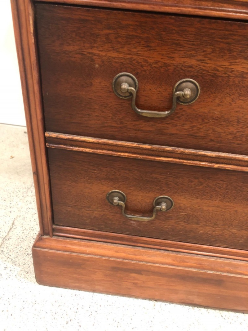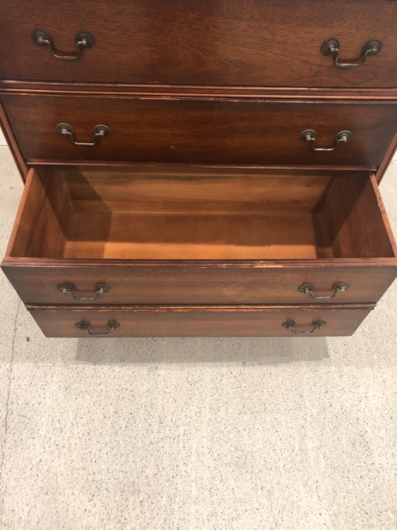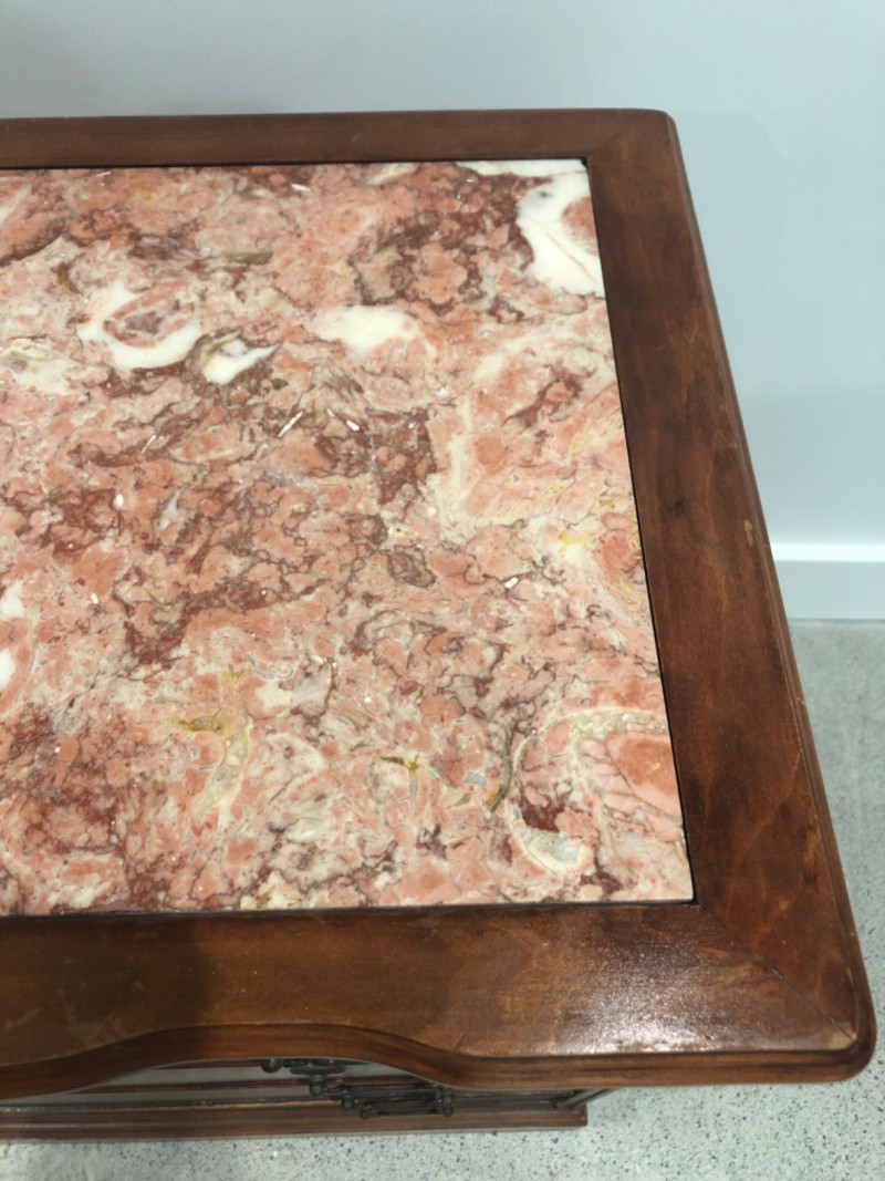 Federal style mahogany chest with three drawers and brass bail pulls. Topped with pink and white marble featuring natural veining. Solid wood construction with classic straight lines and molded edges. Two top drawers and one bottom drawer (appears to be two seperate drawers but is two-deep) offering generous storage. A versatile piece that works well in bedrooms, hallways, or living spaces. Due to Size/Fragility: This Item Is Not Eligible for Shipping. Available for Local Pickup Only.