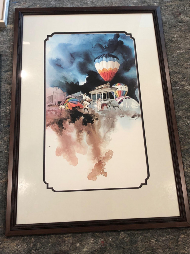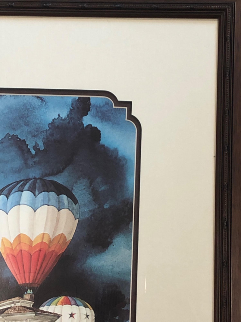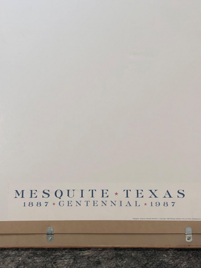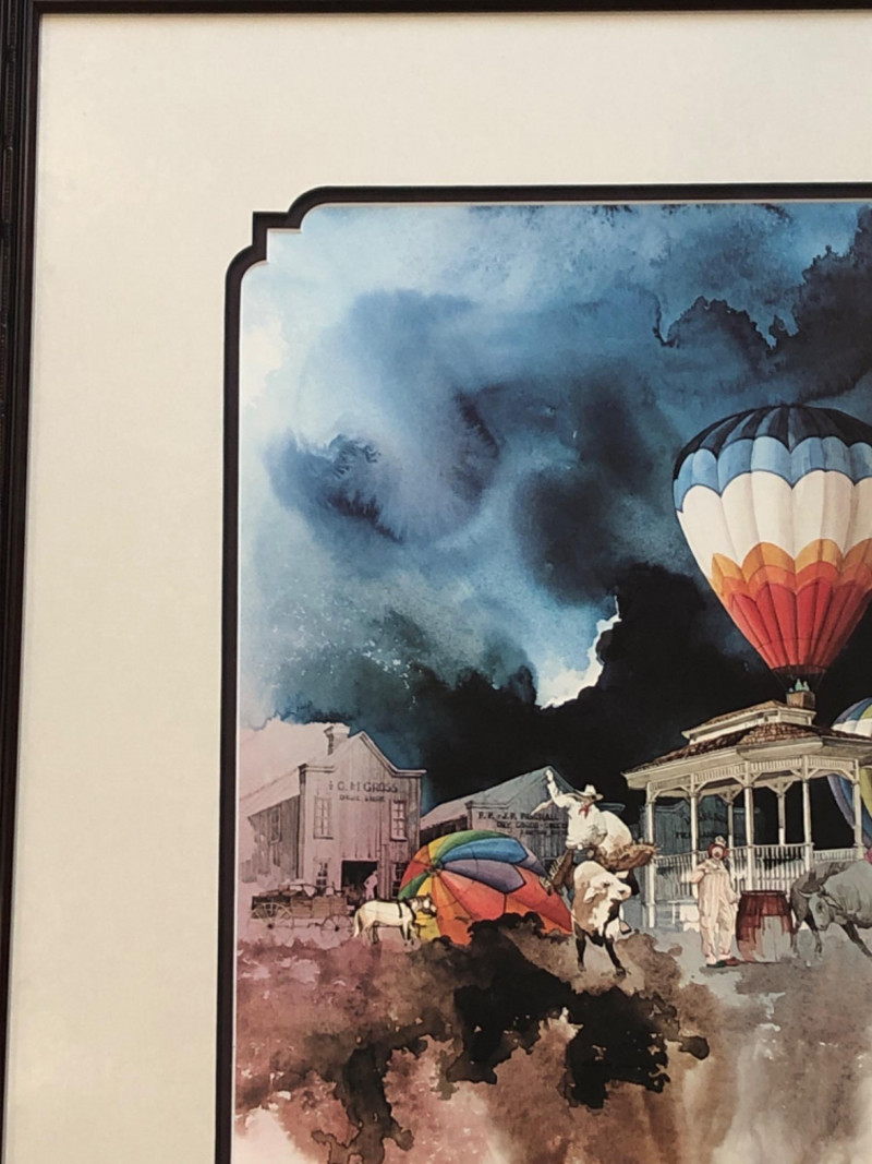 Framed lithograph western art print commemorating the 1987 centennial of Mesquite, Texas (1887–1987). Illustrated by Michael Atkinson, the scene blends historic western imagery with colorful hot air balloons in a vibrant watercolor style. Lithograph print, titled and copyrighted 1986 Artist: Michael Atkinson Marked: Mesquite, Texas 1887 Centennial 1987 Due to Size/Fragility: This Item Is Not Eligible for Shipping. Available for Local Pickup Only.