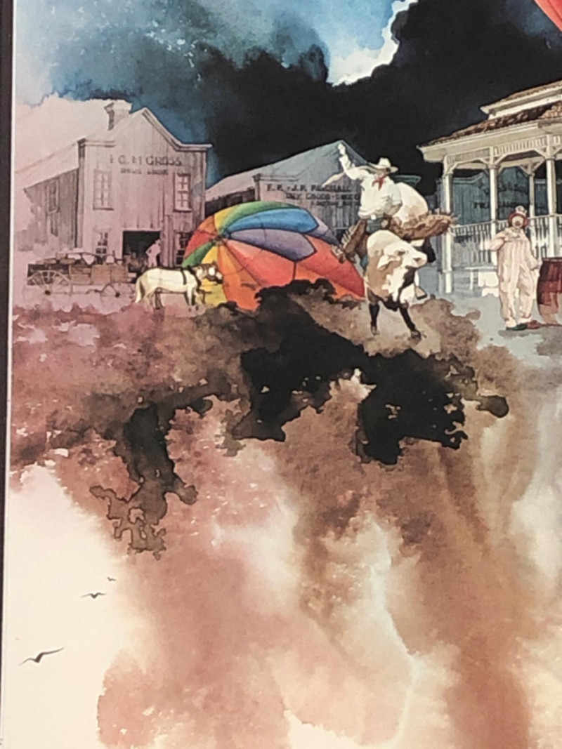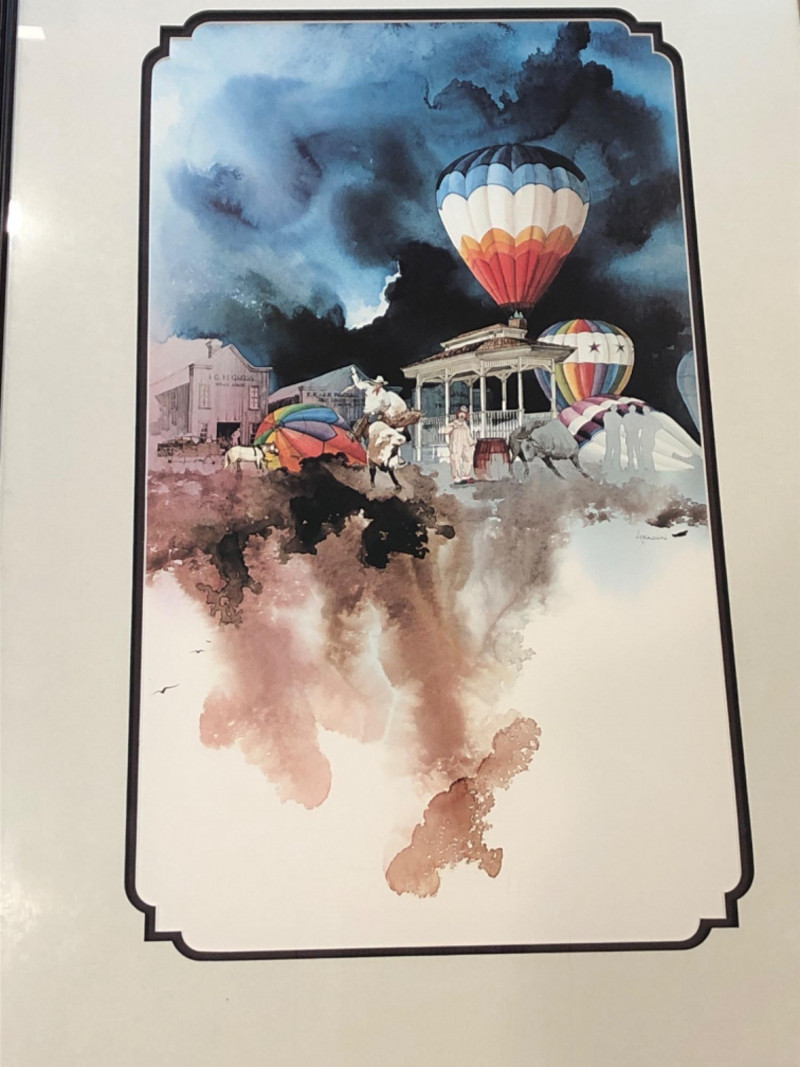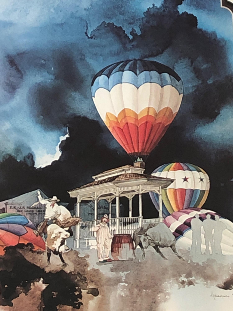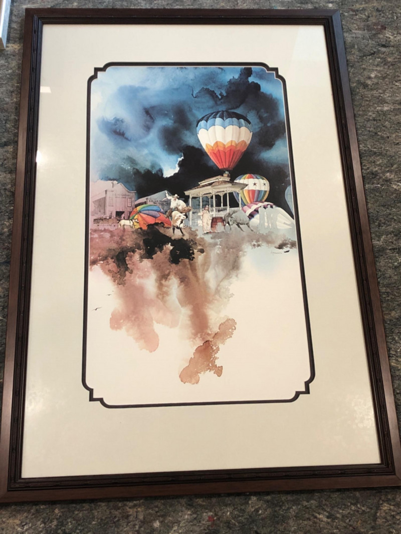 Framed lithograph western art print commemorating the 1987 centennial of Mesquite, Texas (1887–1987). Illustrated by Michael Atkinson, the scene blends historic western imagery with colorful hot air balloons in a vibrant watercolor style. Lithograph print, titled and copyrighted 1986 Artist: Michael Atkinson Marked: Mesquite, Texas 1887 Centennial 1987 Due to Size/Fragility: This Item Is Not Eligible for Shipping. Available for Local Pickup Only.