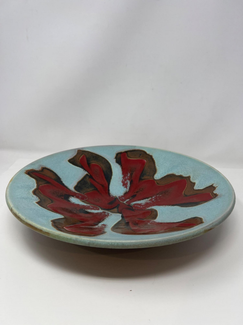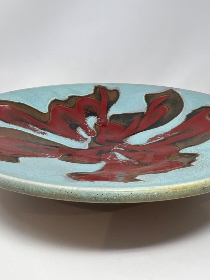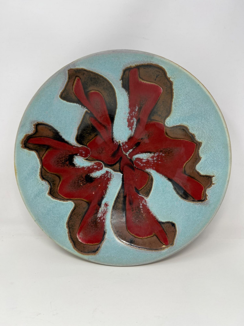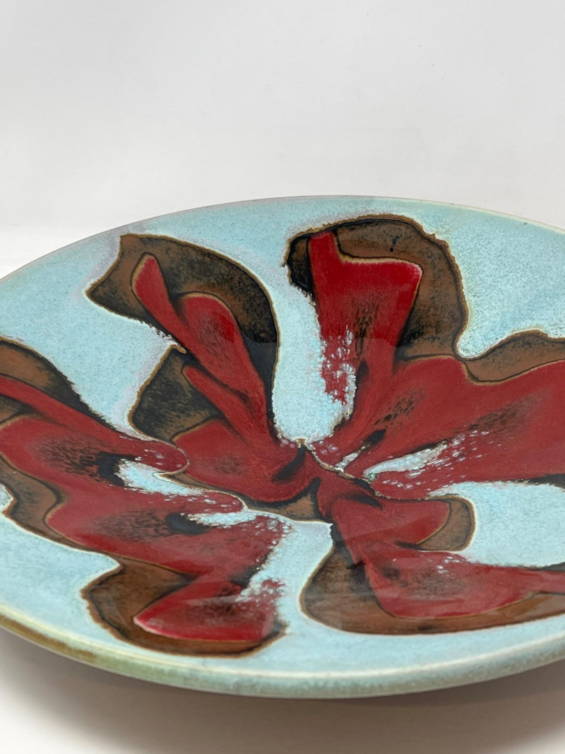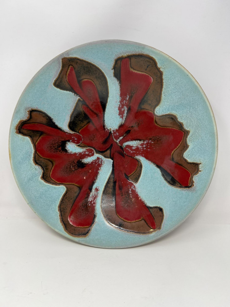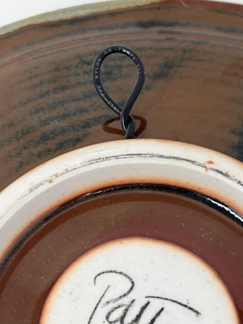 Wall-hung studio pottery art bowl signed Patten on the base. Features red and brown abstract glaze over a blue background. Includes hanging loop on back. Glossy glazed finish with expressive painterly style Signed on base Wire hanger attached for wall display Due to Size/Fragility: This Item Is Not Eligible for Shipping. Available for Local Pickup Only.