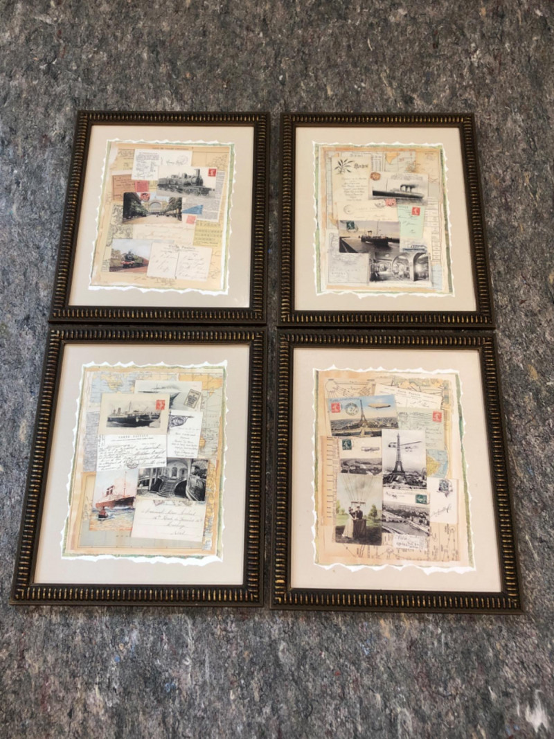 Set of four framed mixed-media collages by artist Susana England, each combining postcards, maps, and vintage imagery in a travel theme. Includes: