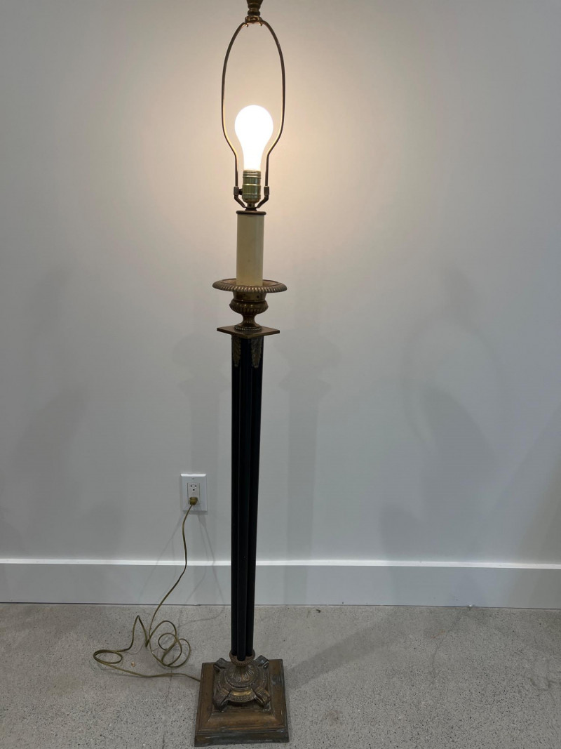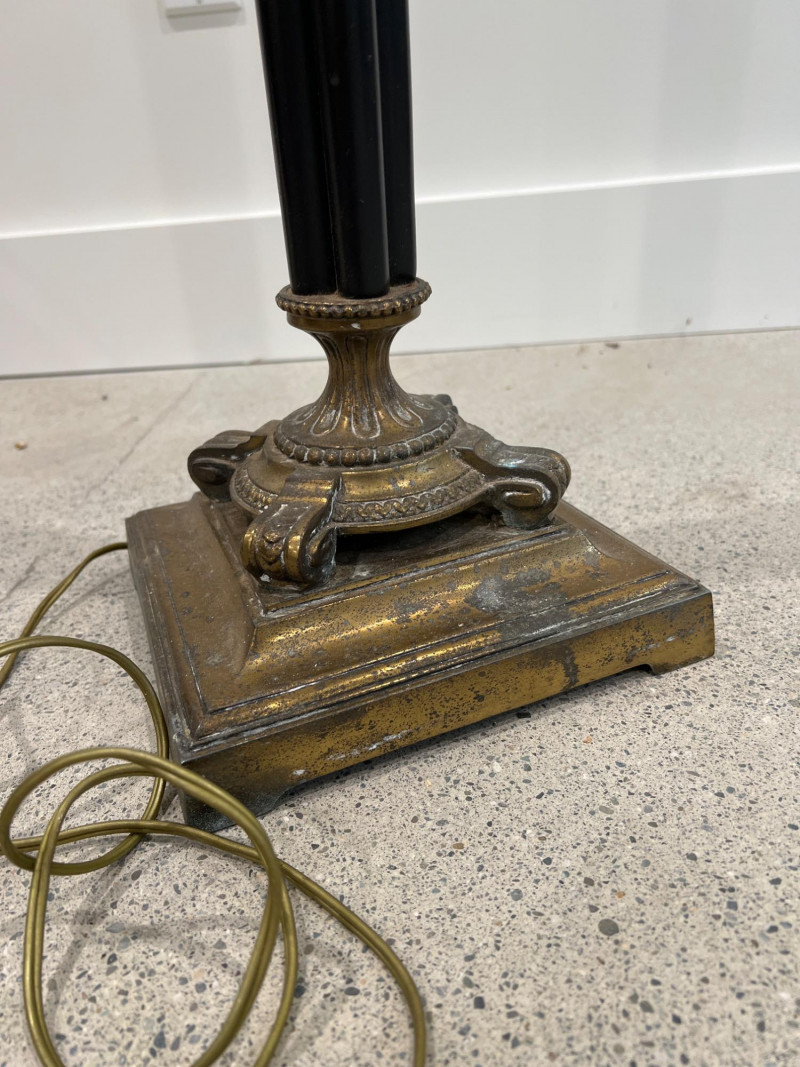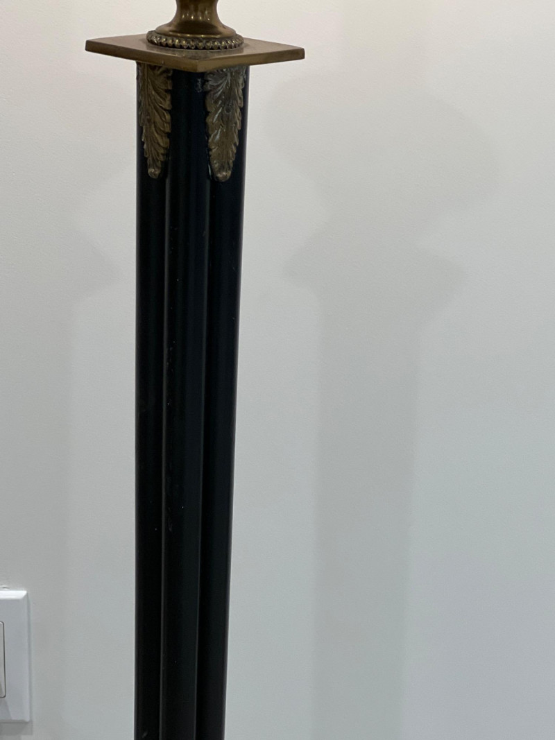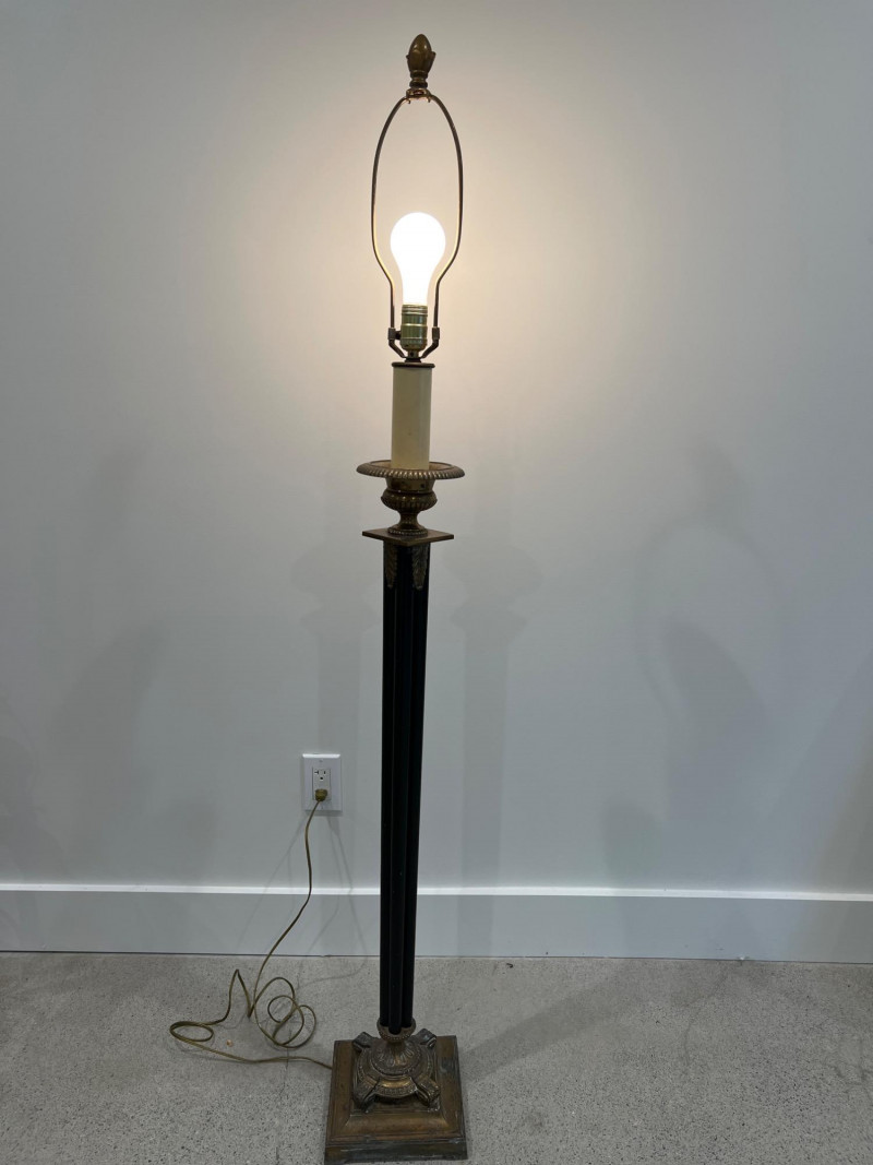 Evoking the opulence of the post-war Hollywood Regency era, this 59 inch tall floor lamp features a commanding black columned stem accented by ornate brass appliqués and a square footed base. With echoes of Louis XVI design—seen in its scrolled feet, beaded trim, and classical symmetry—this piece channels the decorative exuberance of the 1950s–60s, when glamour met grandeur in modern American interiors. Crafted with a weighty presence and finished in a bold brass-and-black contrast, it's an ideal statement piece for formal living rooms, Art Deco interiors, or Regency-inspired spaces seeking warmth, polish, and architectural drama. Base: 8.5" x 8.5" square with scrolled feet and acanthus accents. Brass with evident oxidation (see pictures). Wiring: Standard socket and plug, tested and working, but without shade. Due to Size/Fragility: This Item Is Not Eligible for Shipping. Available for Local Pickup Only.