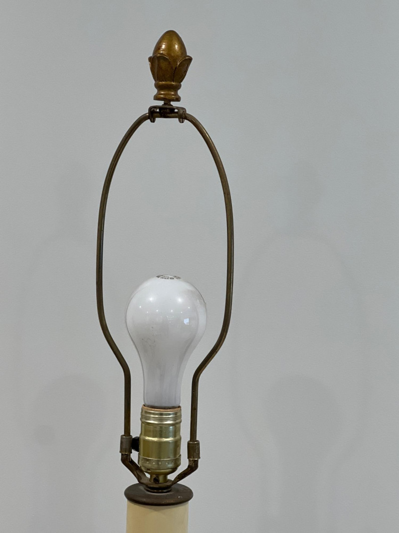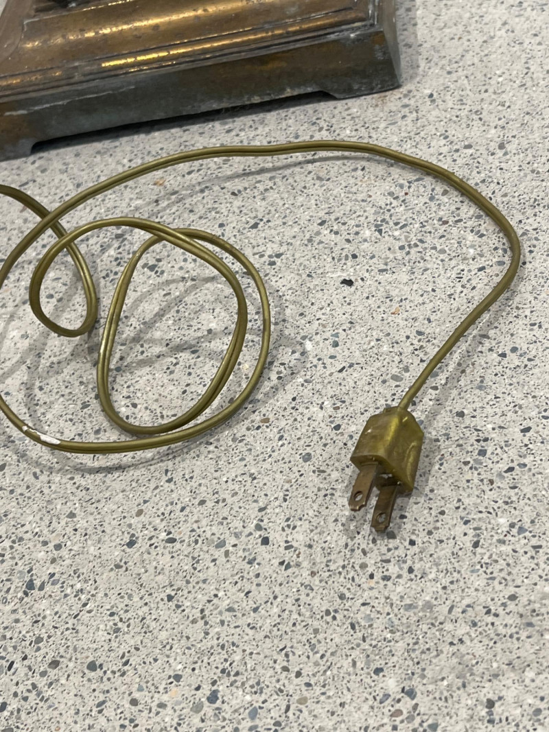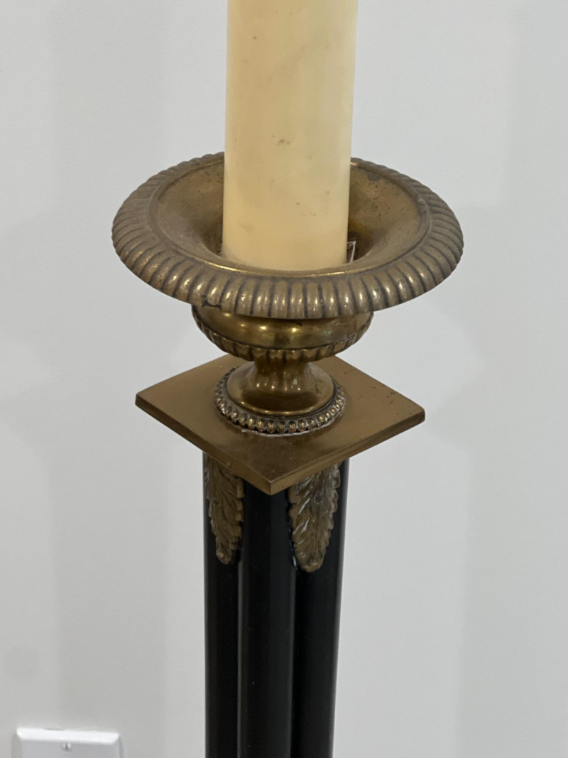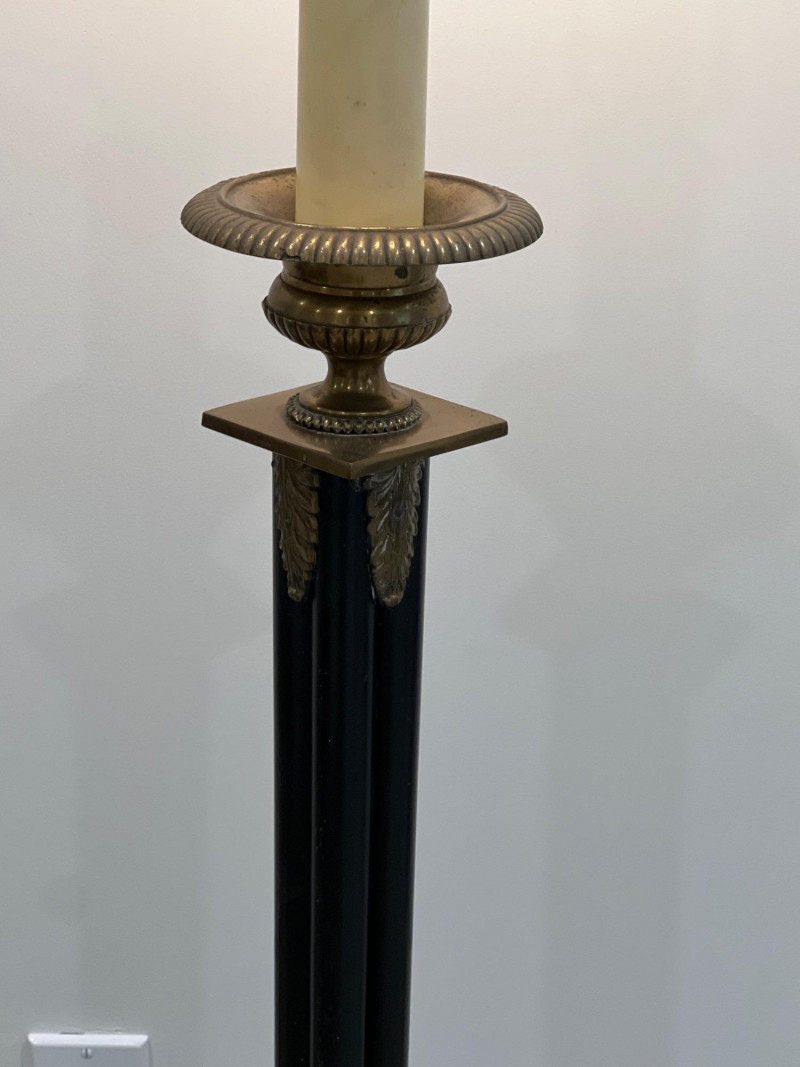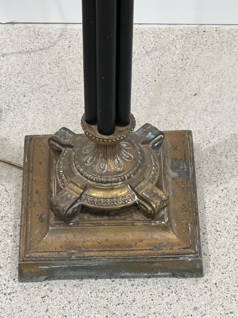 Evoking the opulence of the post-war Hollywood Regency era, this 59 inch tall floor lamp features a commanding black columned stem accented by ornate brass appliqués and a square footed base. With echoes of Louis XVI design—seen in its scrolled feet, beaded trim, and classical symmetry—this piece channels the decorative exuberance of the 1950s–60s, when glamour met grandeur in modern American interiors. Crafted with a weighty presence and finished in a bold brass-and-black contrast, it's an ideal statement piece for formal living rooms, Art Deco interiors, or Regency-inspired spaces seeking warmth, polish, and architectural drama. Base: 8.5" x 8.5" square with scrolled feet and acanthus accents. Brass with evident oxidation (see pictures). Wiring: Standard socket and plug, tested and working, but without shade. Due to Size/Fragility: This Item Is Not Eligible for Shipping. Available for Local Pickup Only.
