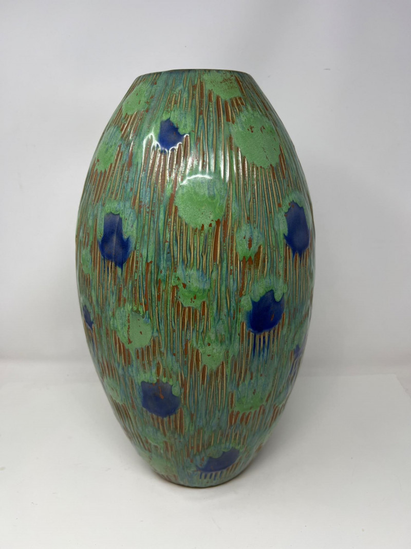 With rich hues and organic patterning, this tall vintage pottery vase features a dramatic “peacock feather” glaze—an admired style within 20th-century American and European art pottery traditions. The surface displays vertical textural ridges accented by cascading drips in deep cobalt blue and mottled green over a warm reddish-brown ground, evoking the iridescence and layering of peacock plumage. While unsigned aside from a hand-marked number on the opening edge of the vase, the artistry suggests a mid-century studio piece possibly influenced by makers such as Van Briggle or regional ceramic studios working in oxidation-fired glazes and nature-inspired motifs. The glaze work and form offer a strong visual impact, especially as a sculptural centerpiece or part of a curated pottery collection. Felt covering applied to underside of vase for purpose of protecting furniture surfaces. Due to Fragility: This Item Is Not Eligible for Shipping. Available for Local Pickup Only.