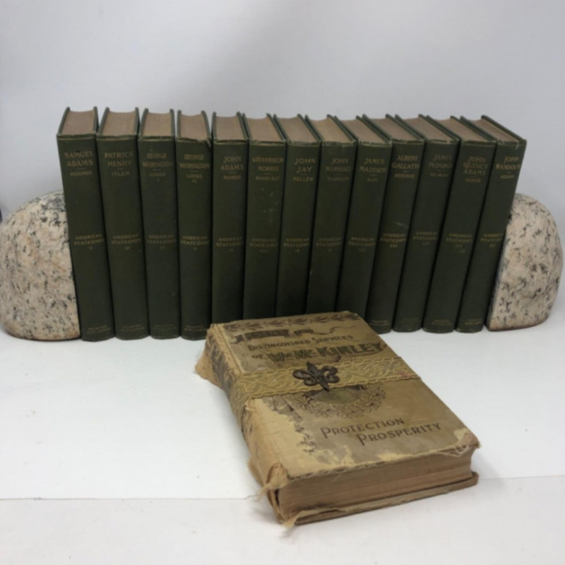 Partial set of antique American Statesmen books published by Houghton Mifflin, each bound in green cloth with gilt-stamped titles. This lot includes 13 volumes from the original 32-volume series issued beginning in 1898, highlighting key figures in early U.S. history such as George Washington, John Adams, and James Madison. Also included is a vintage volume titled Protection and Prosperity—a worn but compelling biography of William McKinley. The set is paired with heavy speckled granite marble bookends for a classically styled presentation. This collection blends historical significance with handsome shelf appeal—ideal for decorators, history buffs, or collectors of early Americana.