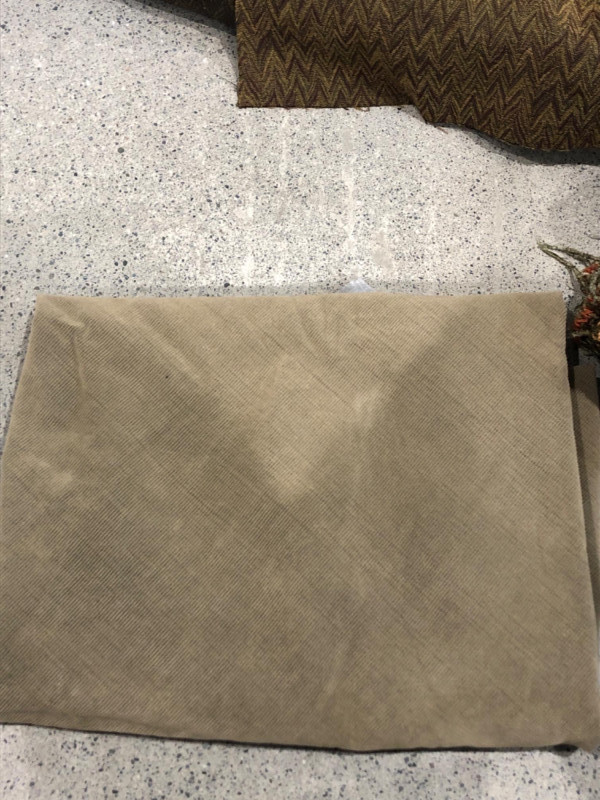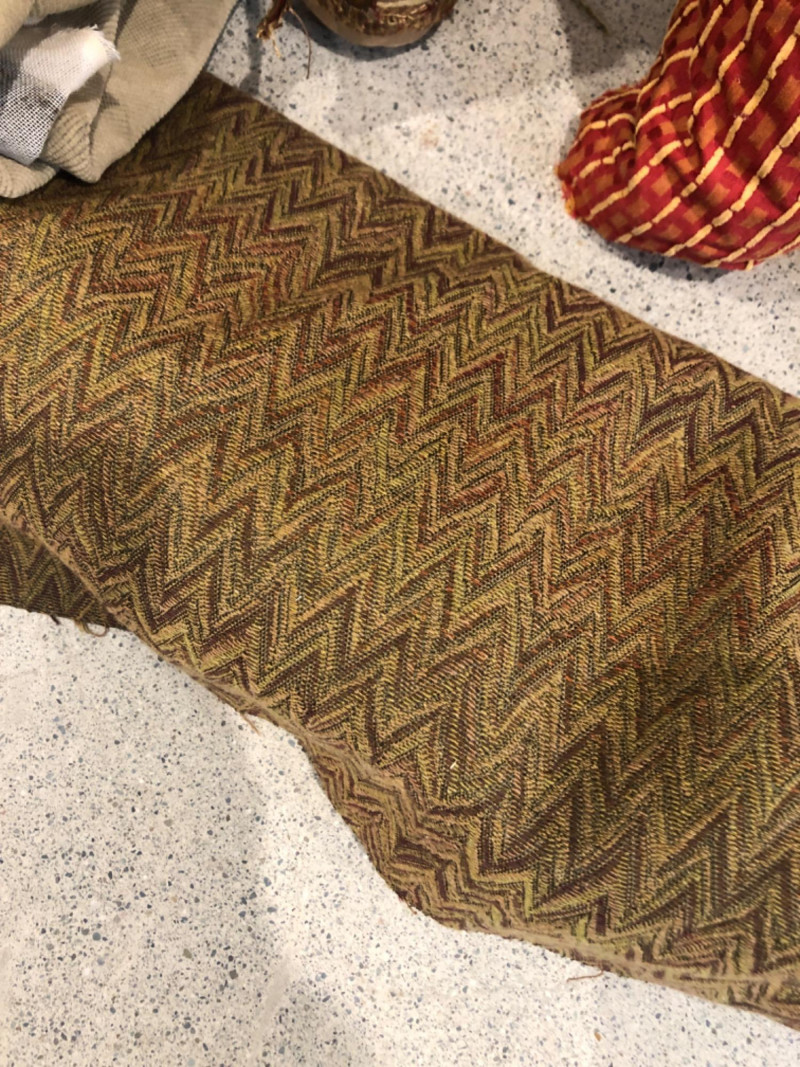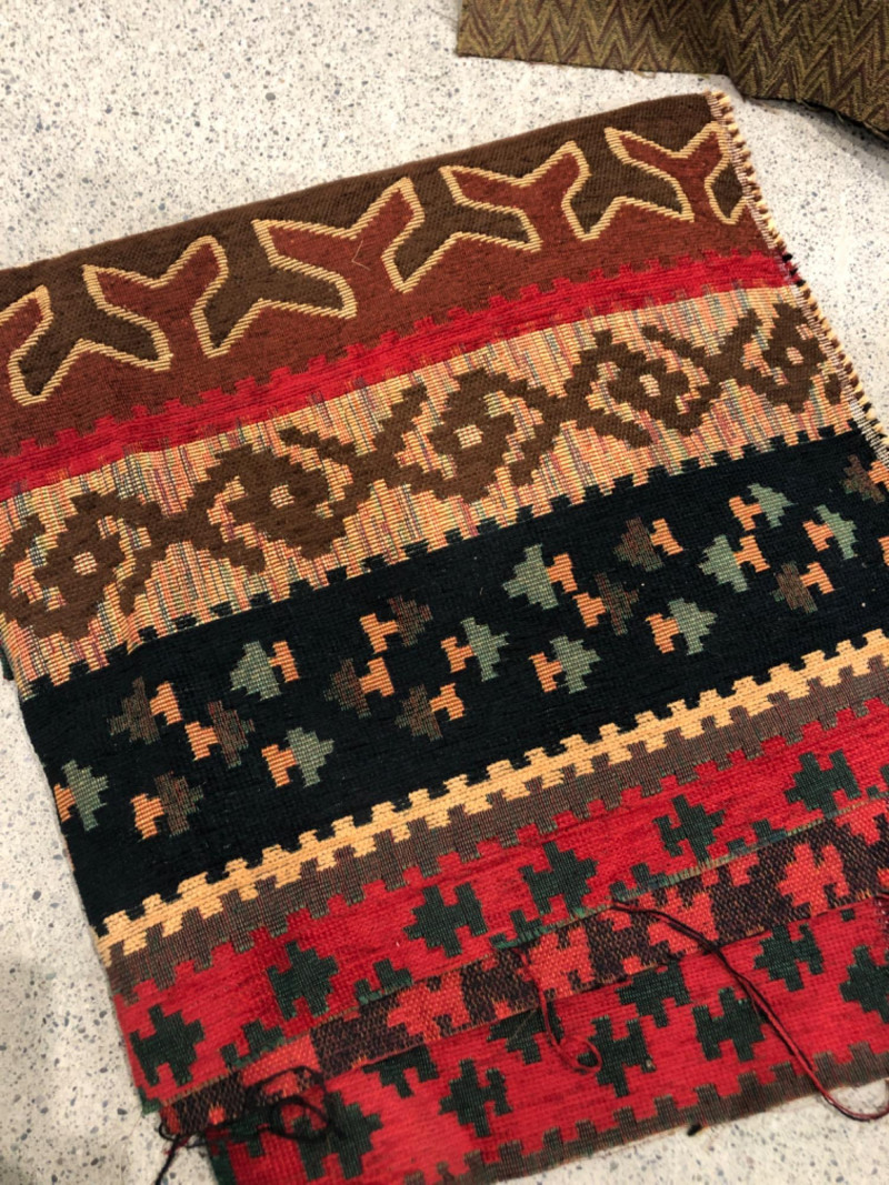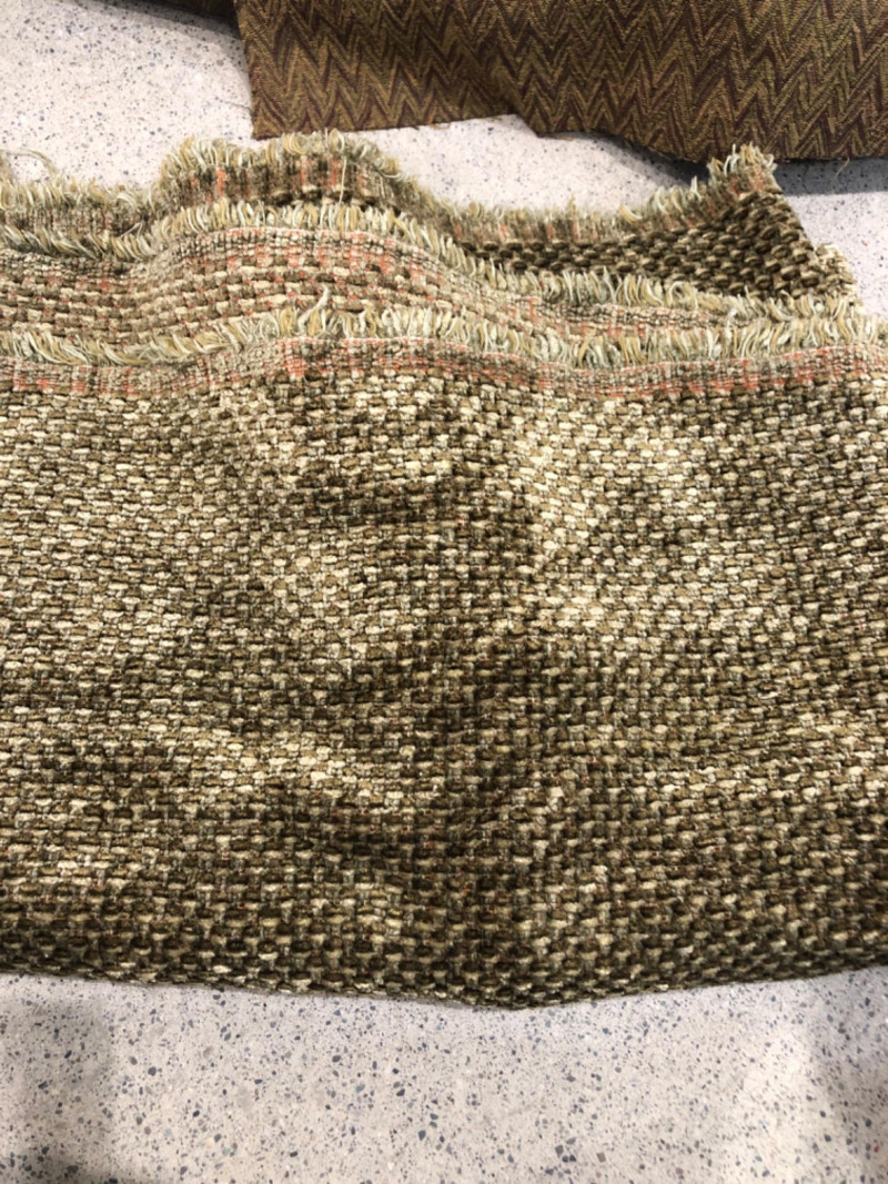Assorted lot of upholstery fabric including skeined and cut remnants. Patterns include florals, chevron, stripes, and jacquard in earthy tones like red, tan, green, and brown. Some labeled Ethan Allen. Suitable for furniture projects, cushions, or decorative sewing. Due to Size: This Item Is Not Eligible for Shipping. Available for Local Pickup Only.