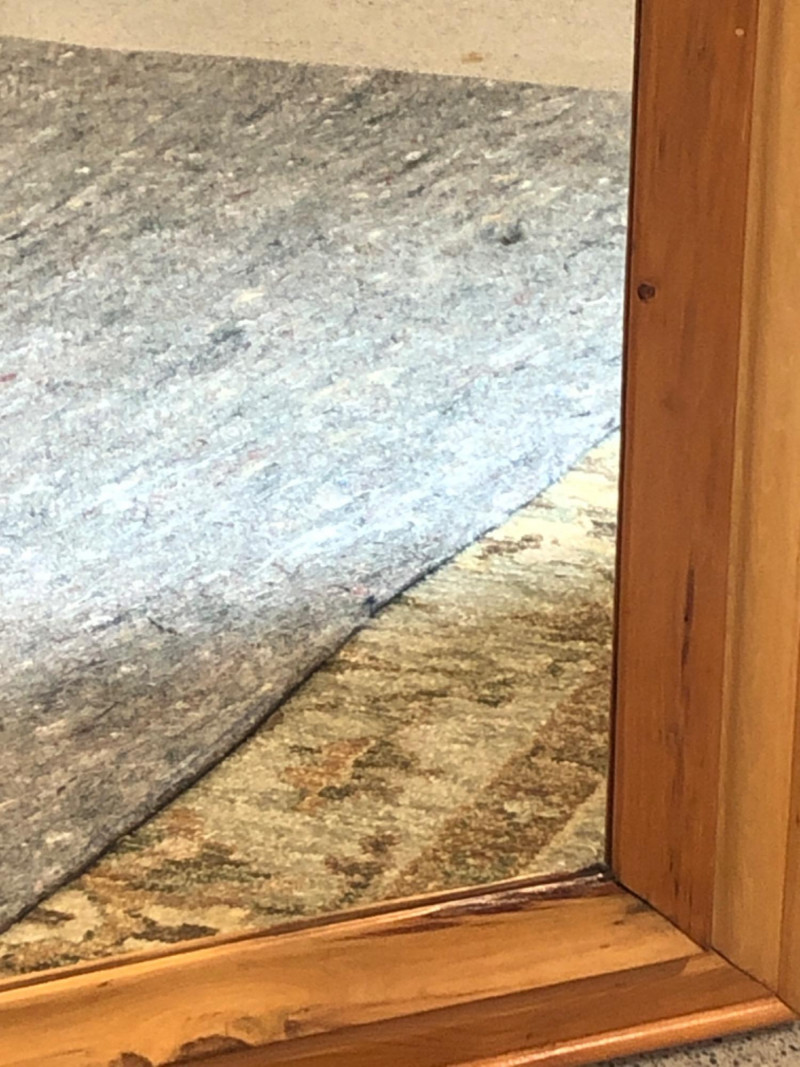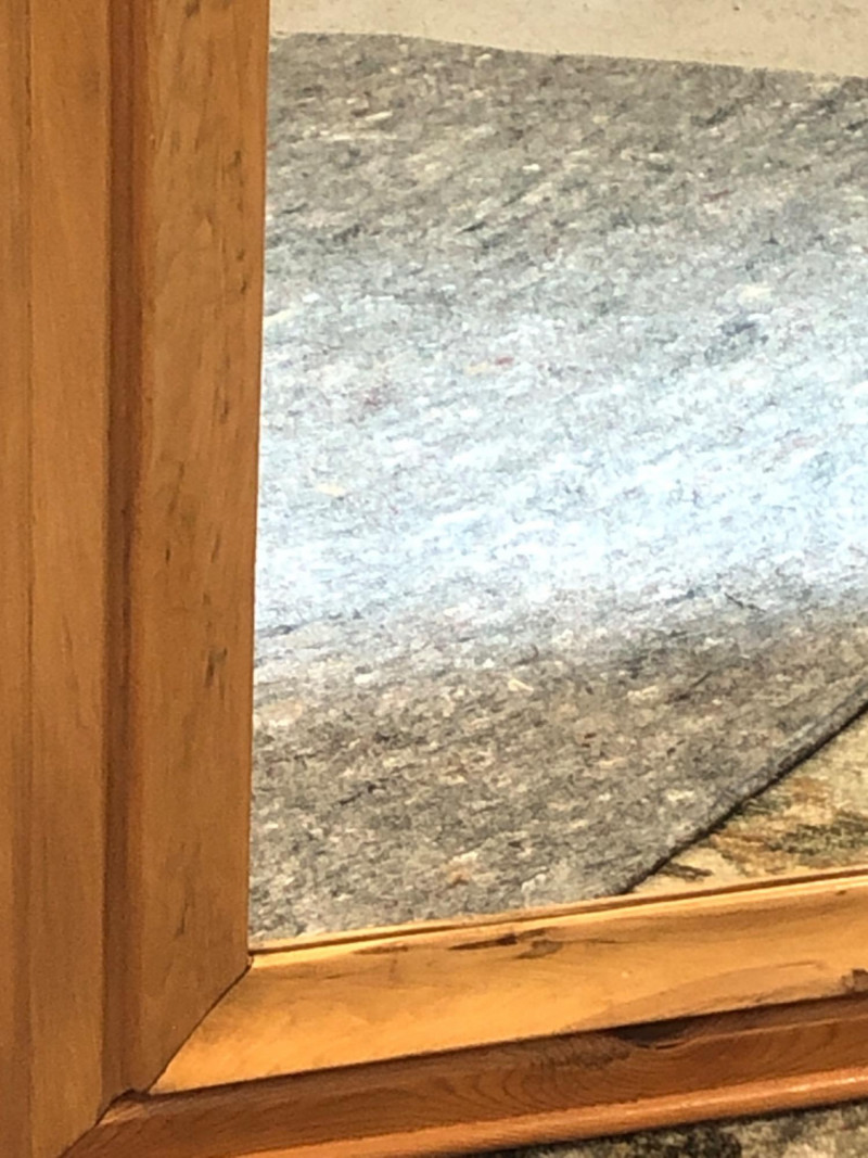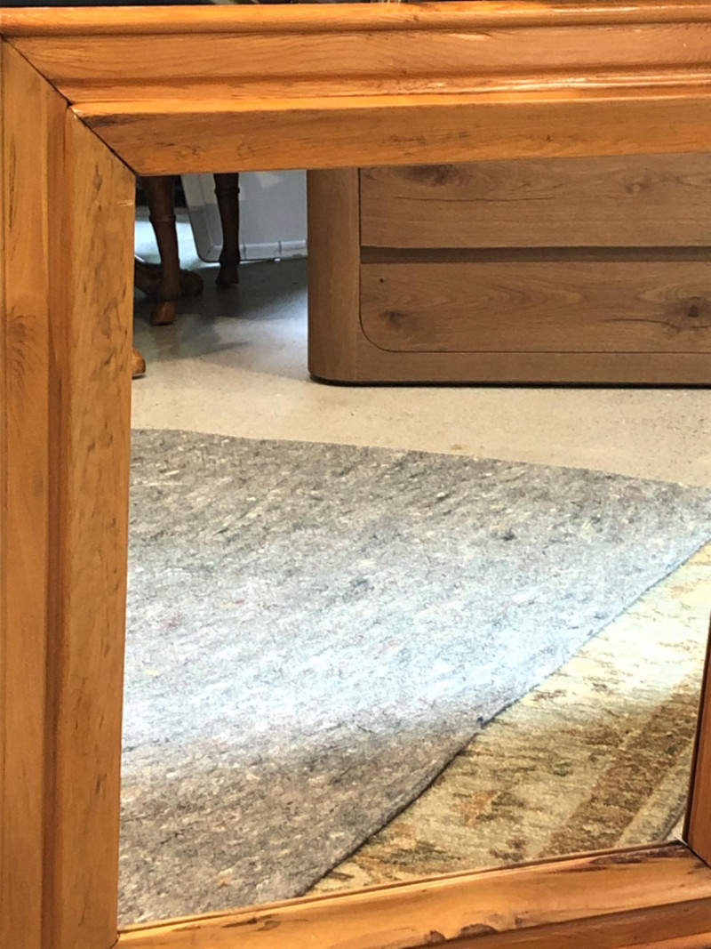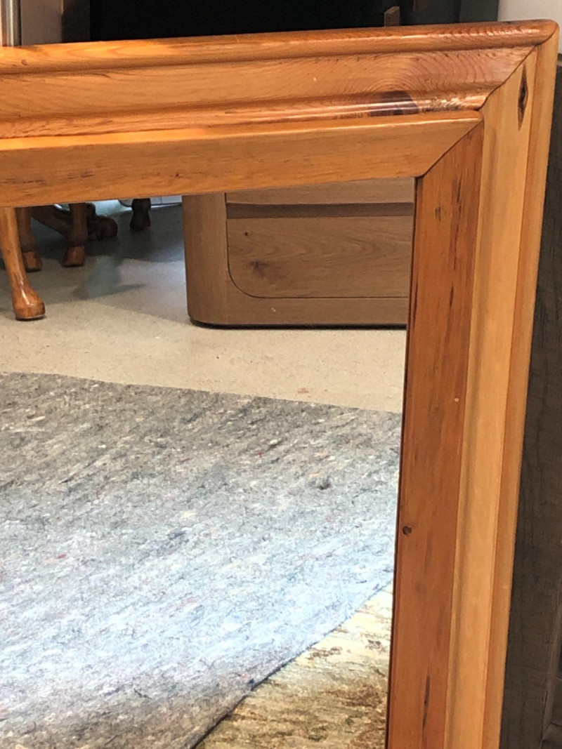 Wide wood-framed wall mirror in a natural finish, showcasing visible knots and warm grain reminiscent of knotty pine. The smooth surface and clean-angled silhouette offer versatile styling for transitional, modern farmhouse, or minimalist interiors. Due to Size/Fragility: This Item Is Not Eligible for Shipping. Available for Local Pickup Only.