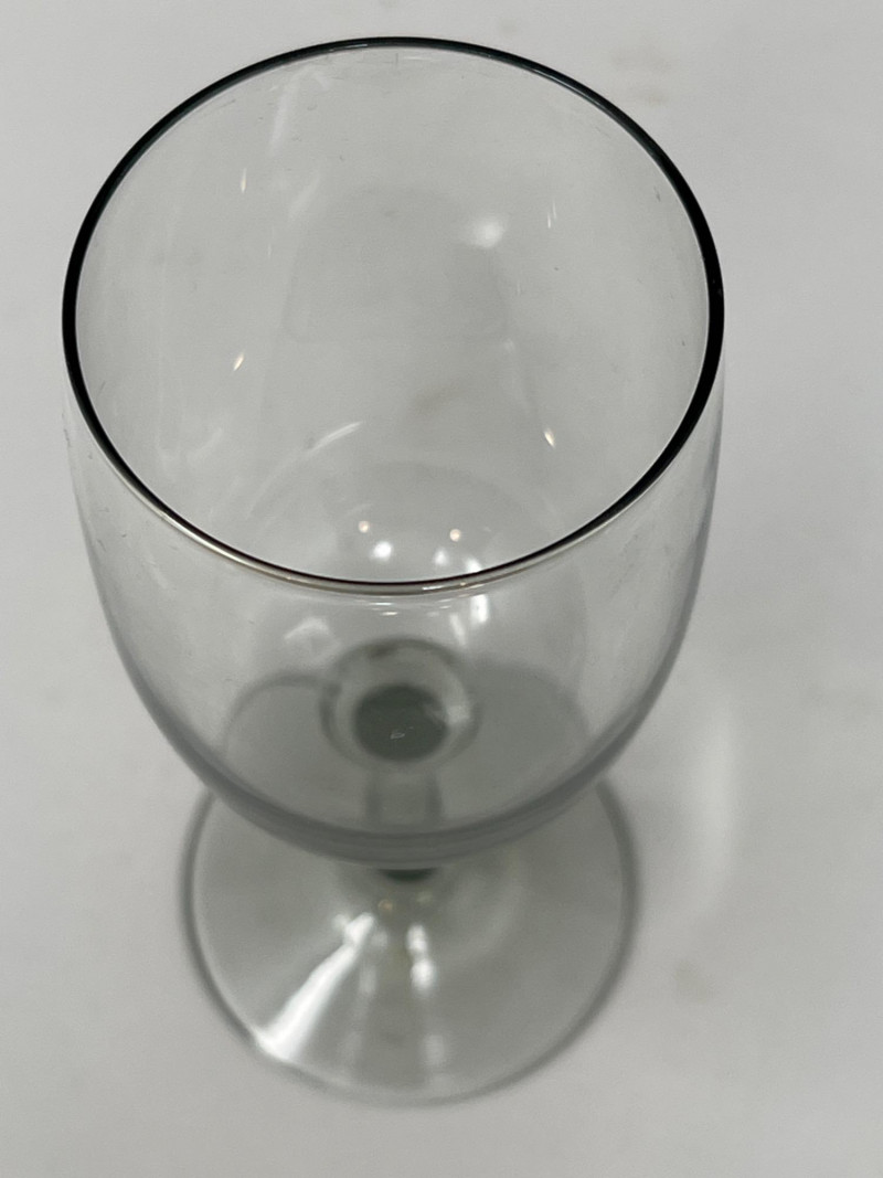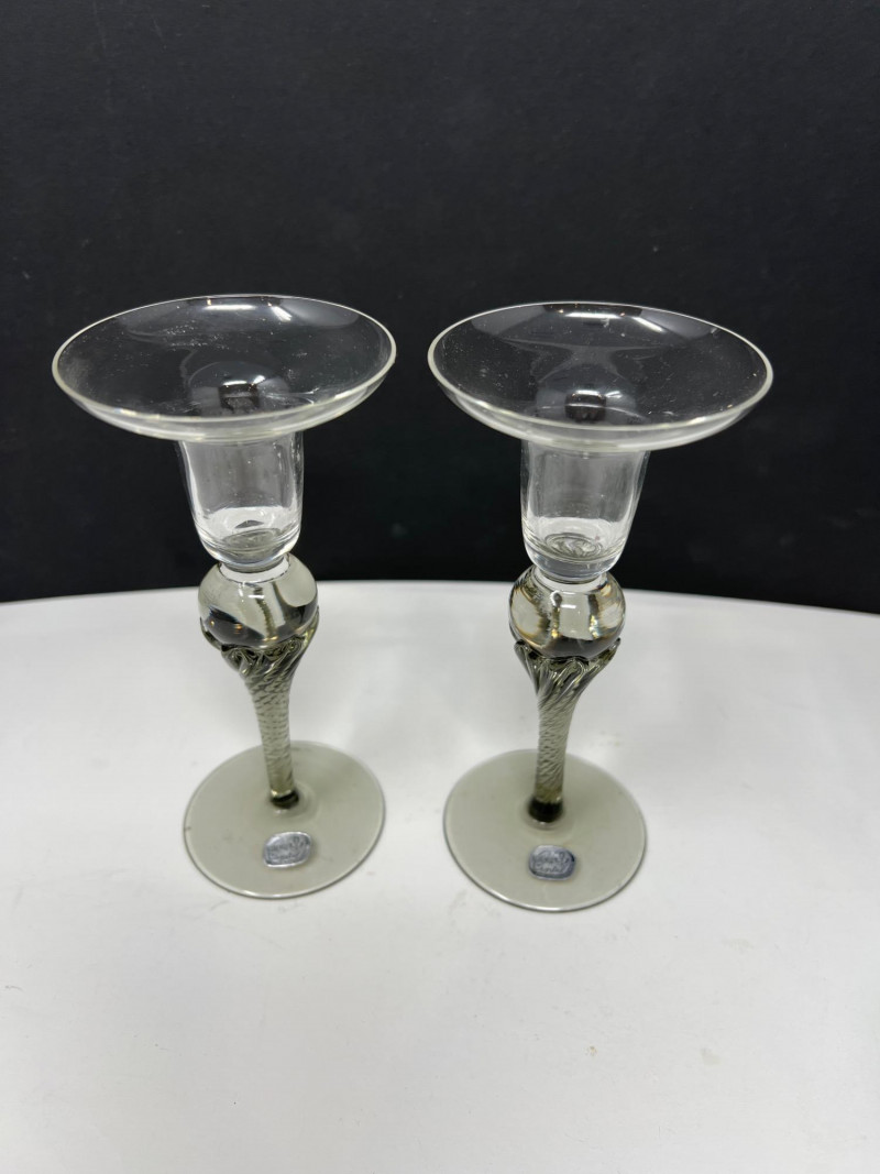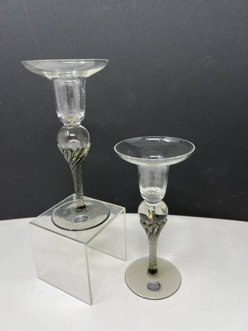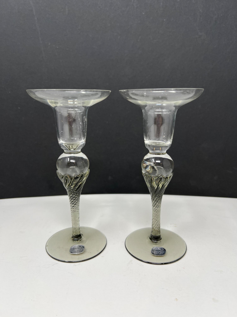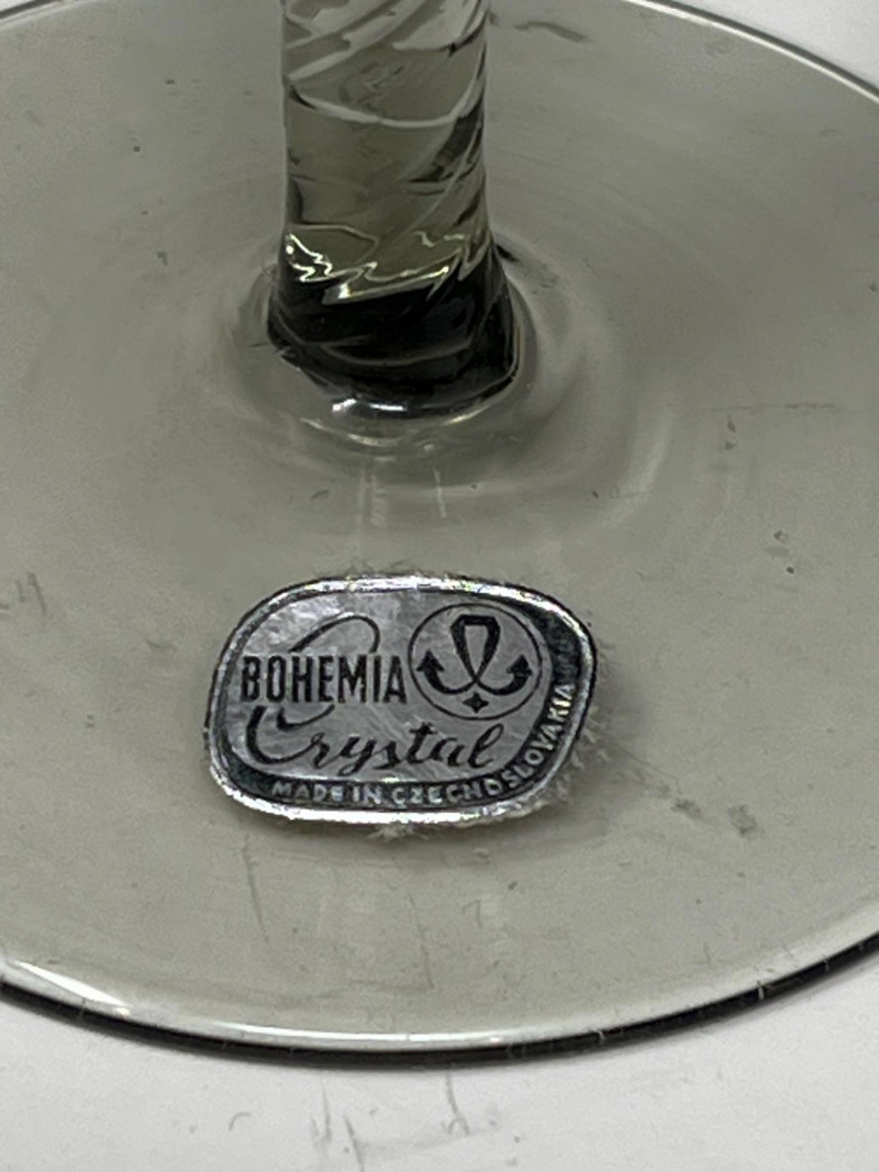 Set includes two Bohemia Crystal candlesticks (6.5" tall x 3" wide) and seven smoky gray cordial glasses (4.5" tall x 2" wide). Candlesticks feature twisted stems and clear tops with original Czech labels. Cordials have short stems and matching smoky hue. Elegant set for display or use. Due to Fragility: This Item Is Not Eligible for Shipping. Available for Local Pickup Only.