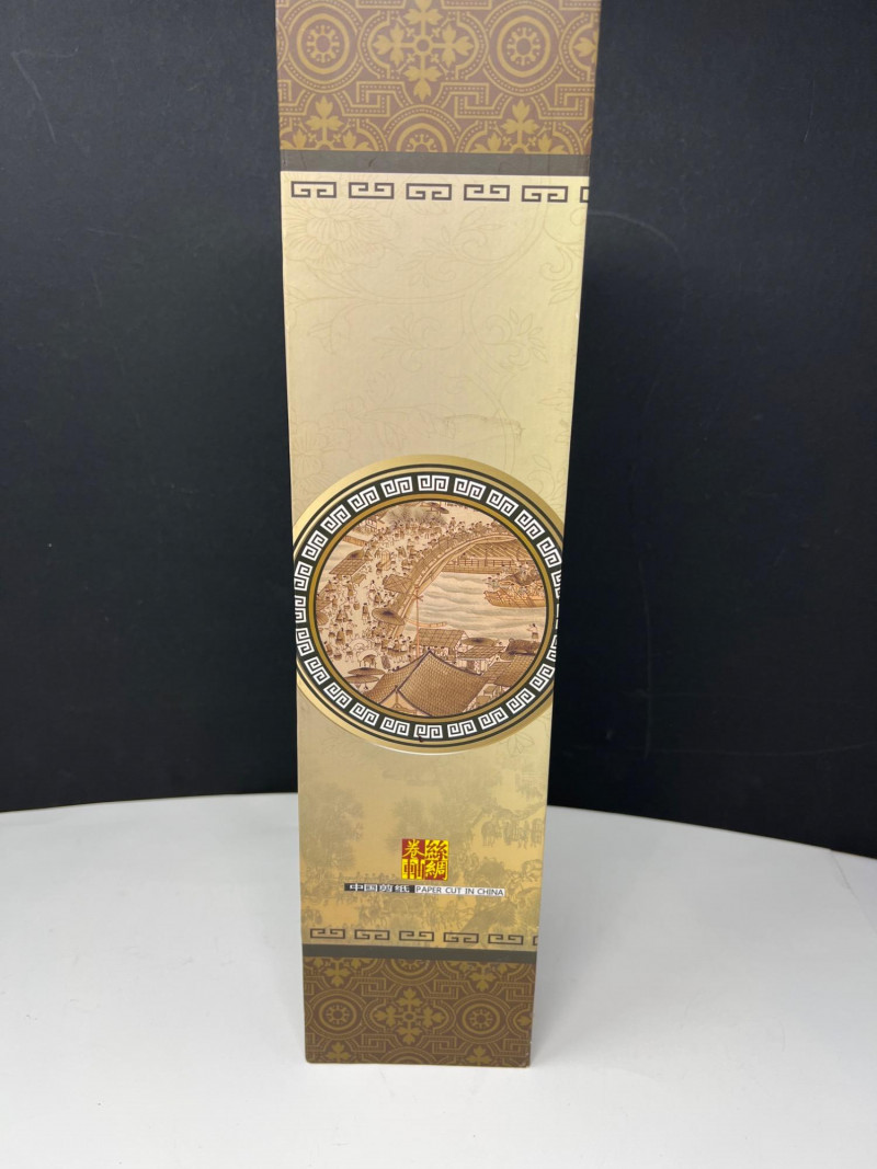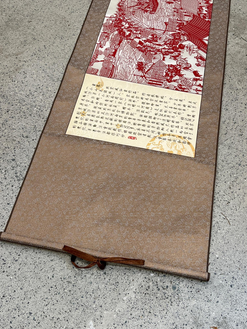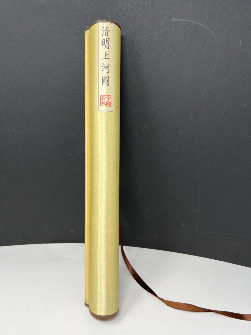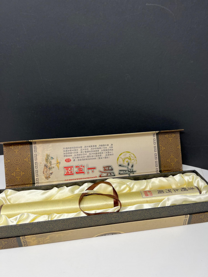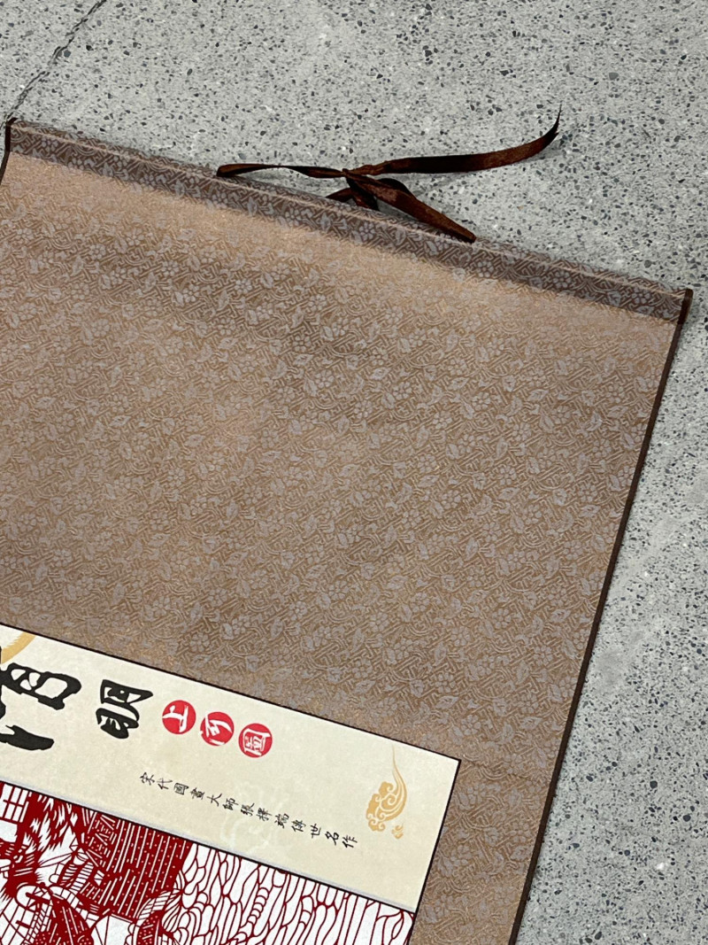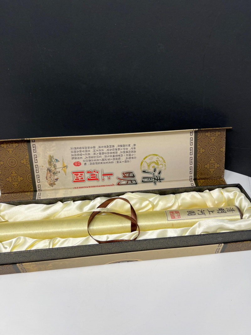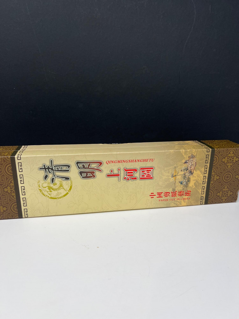 Reproduction of the famous Chinese silk scroll painting, "Along the River During the Qingming Festival" (清明上河圖). This scroll is a reproduction printed on Chinese Xu paper and the paper intricately cut out to create the scene. This is then mounted on a silk lining and bordered in a varied colored satin/silk fabric. It also includes calligraphy texts describing the scenes and artist. Horizontal display that rolls up and can be stored in its own original box lined with silk. Notes about the Original Painting: The original handscroll painting was created by the Song dynasty painter Zhang Zeduan (1085–1145). It depicts the daily life of people and the landscape of Bianjing (present-day Kaifeng), the capital during the Northern Song dynasty, particularly around the Qingming Festival. The painting is considered one of the best-known Chinese traditional paintings and a Class I National Treasure, currently housed in the Forbidden City Museum in Beijing.