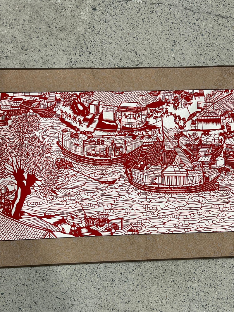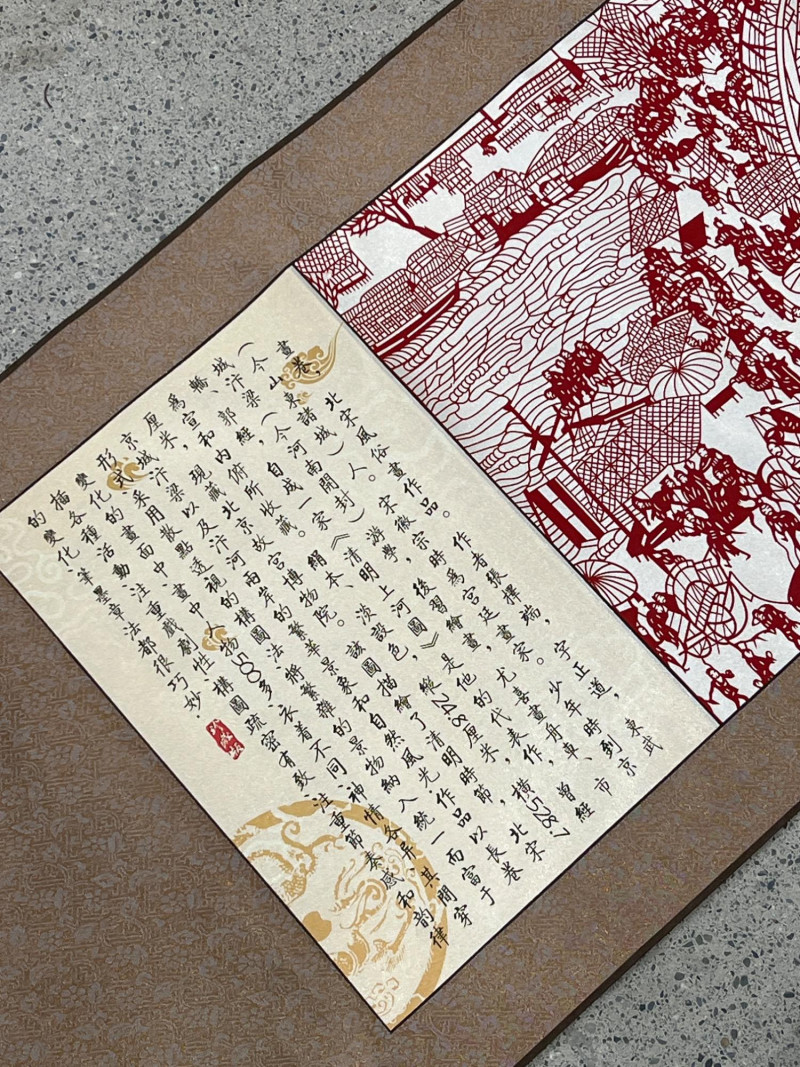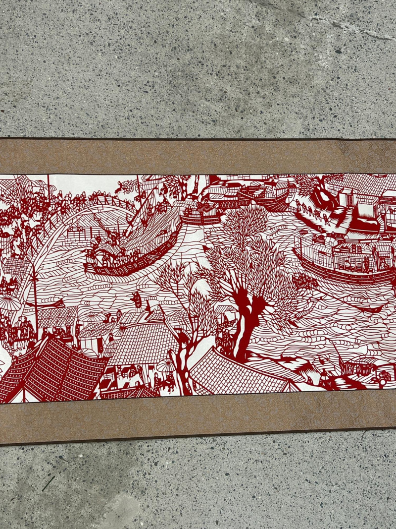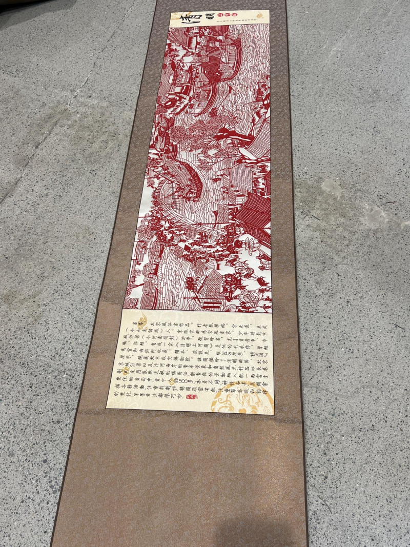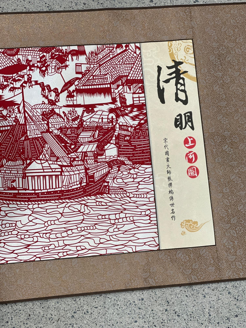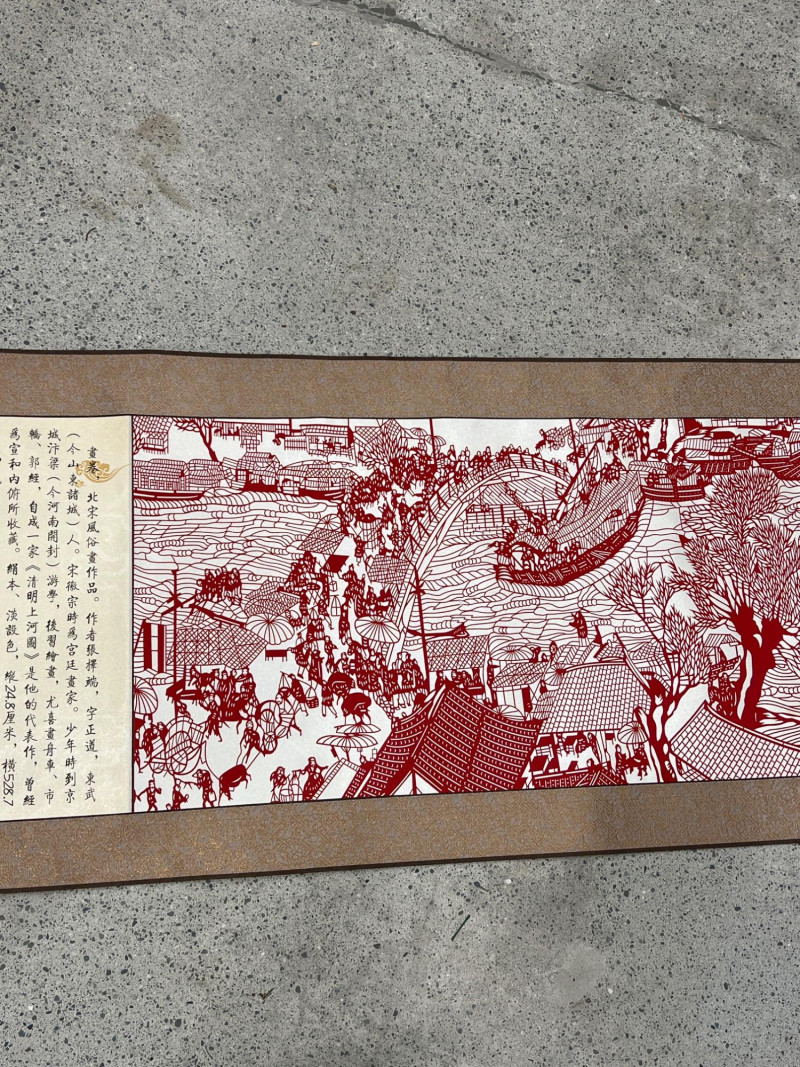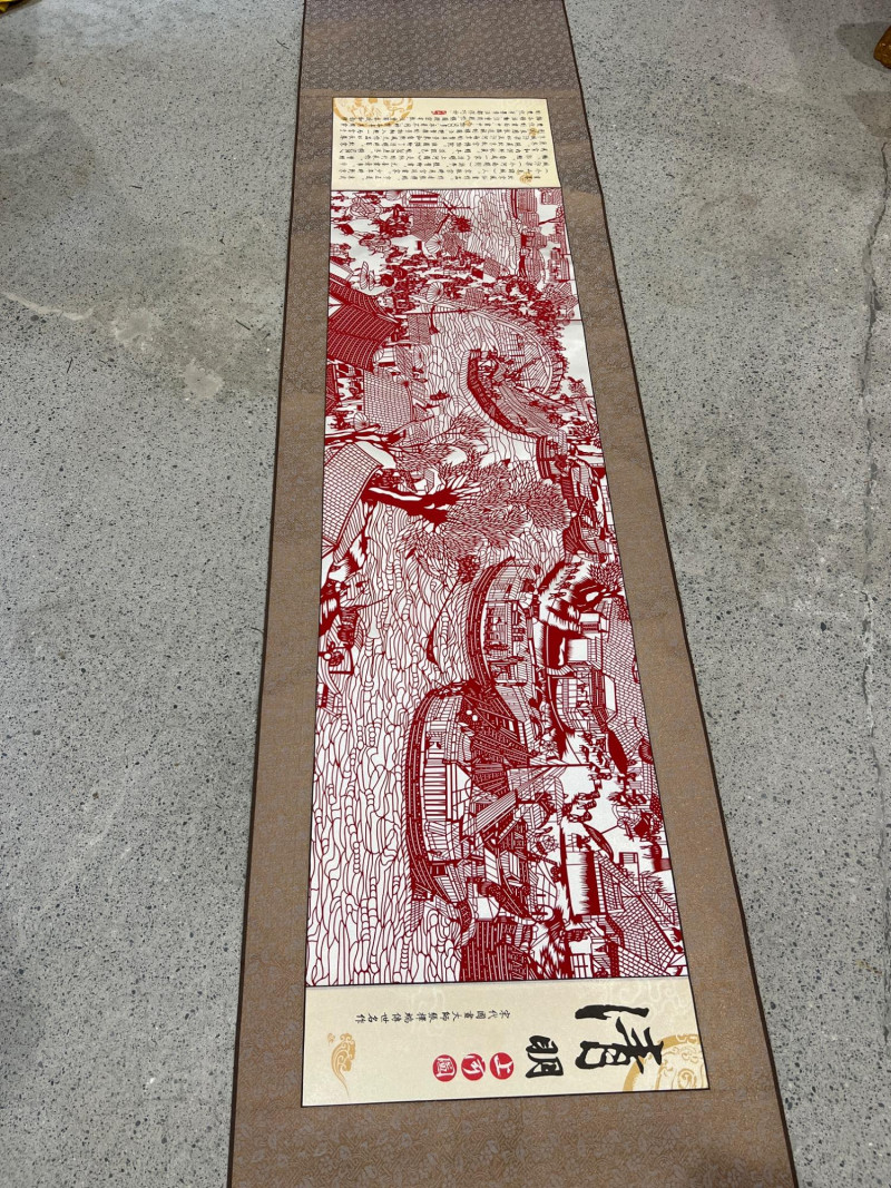 Reproduction of the famous Chinese silk scroll painting, "Along the River During the Qingming Festival" (清明上河圖). This scroll is a reproduction printed on Chinese Xu paper and the paper intricately cut out to create the scene. This is then mounted on a silk lining and bordered in a varied colored satin/silk fabric. It also includes calligraphy texts describing the scenes and artist. Horizontal display that rolls up and can be stored in its own original box lined with silk. Notes about the Original Painting: The original handscroll painting was created by the Song dynasty painter Zhang Zeduan (1085–1145). It depicts the daily life of people and the landscape of Bianjing (present-day Kaifeng), the capital during the Northern Song dynasty, particularly around the Qingming Festival. The painting is considered one of the best-known Chinese traditional paintings and a Class I National Treasure, currently housed in the Forbidden City Museum in Beijing.