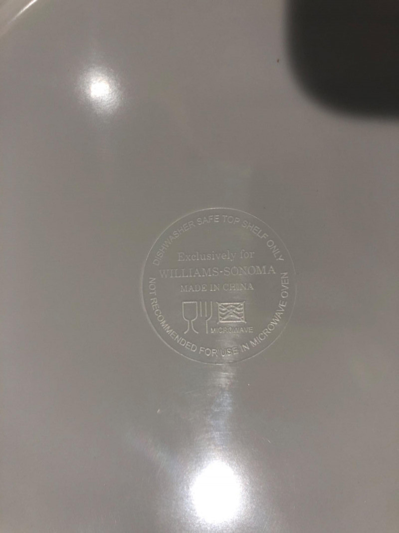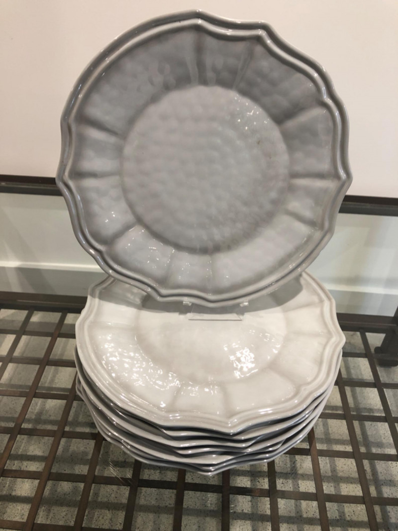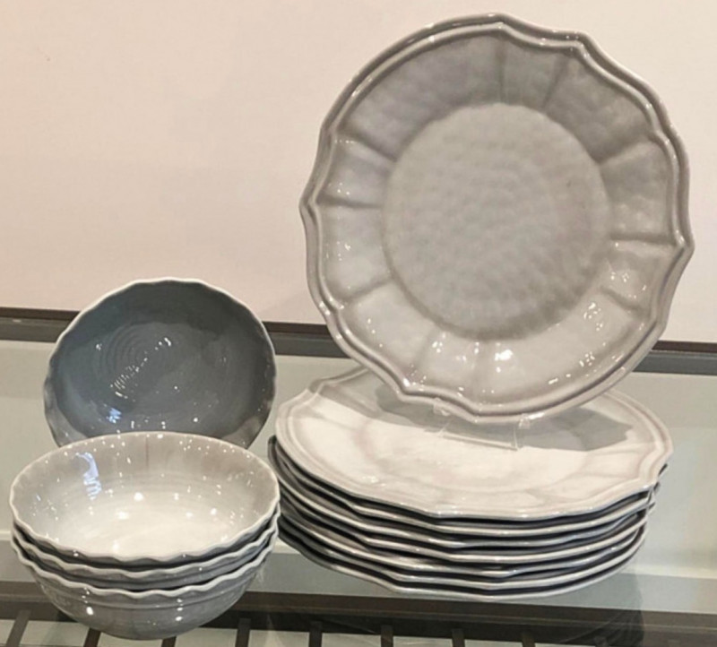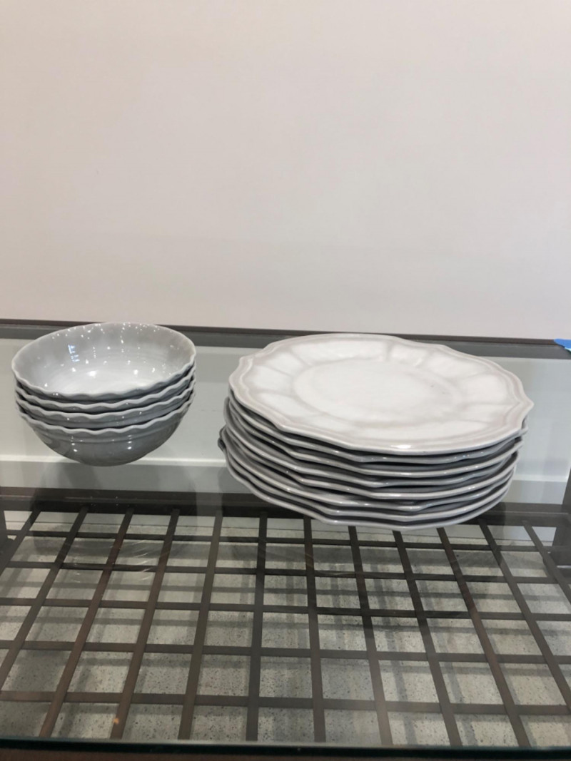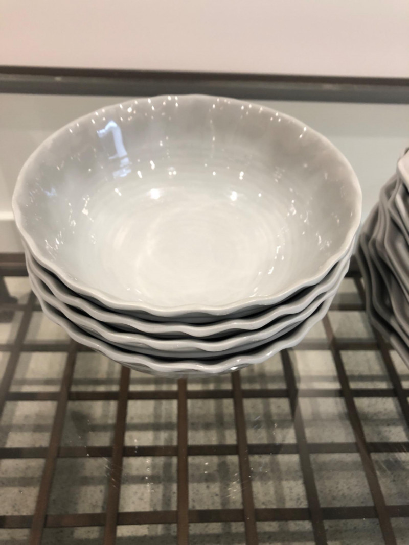 Williams Sonoma melamine dinnerware set in dusty grey. Includes 8 scalloped-edge plates (10") and 4 matching bowls (6.5"). Durable and lightweight—designed for casual dining, picnics, or outdoor use. Dishwasher safe, top rack only. Not recommended for microwave use.