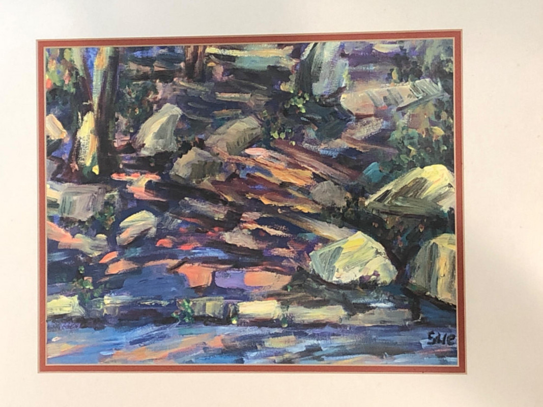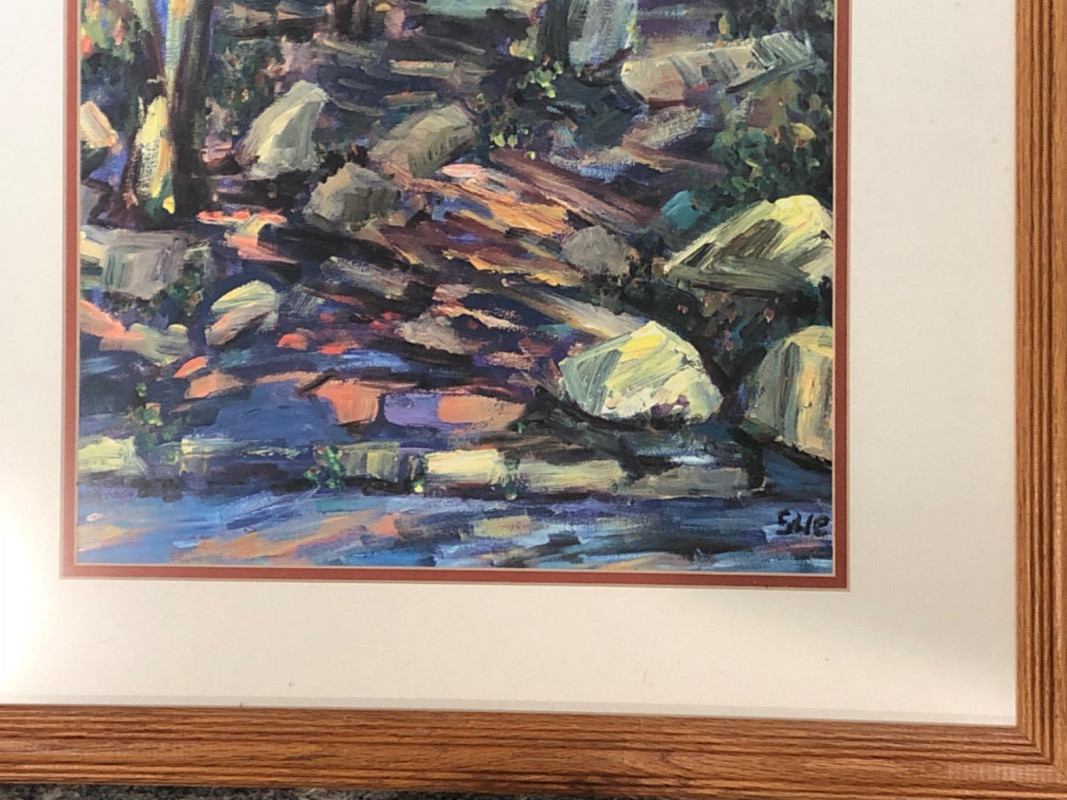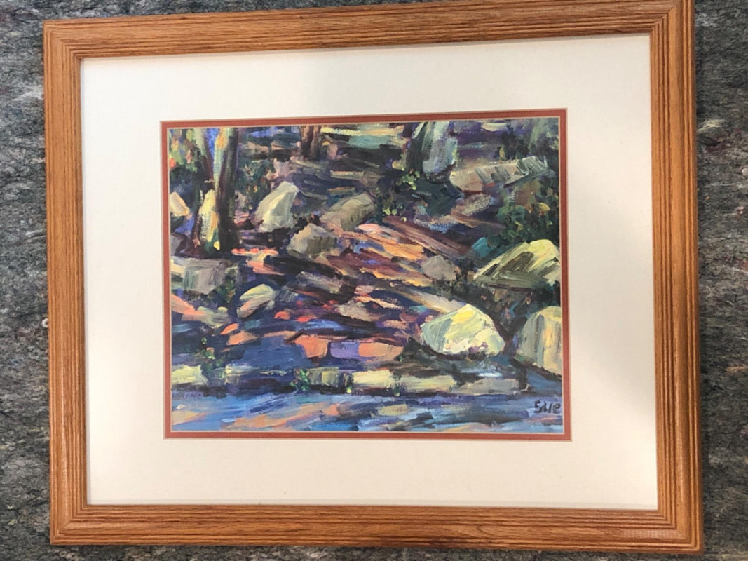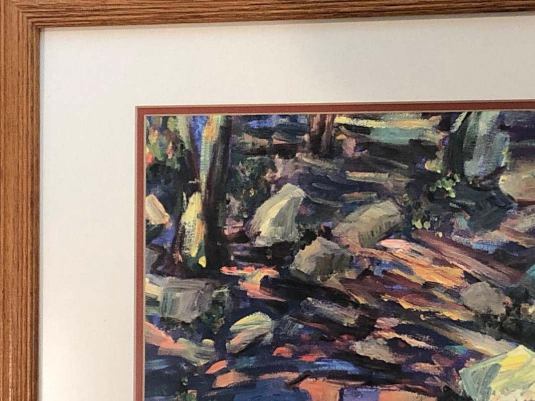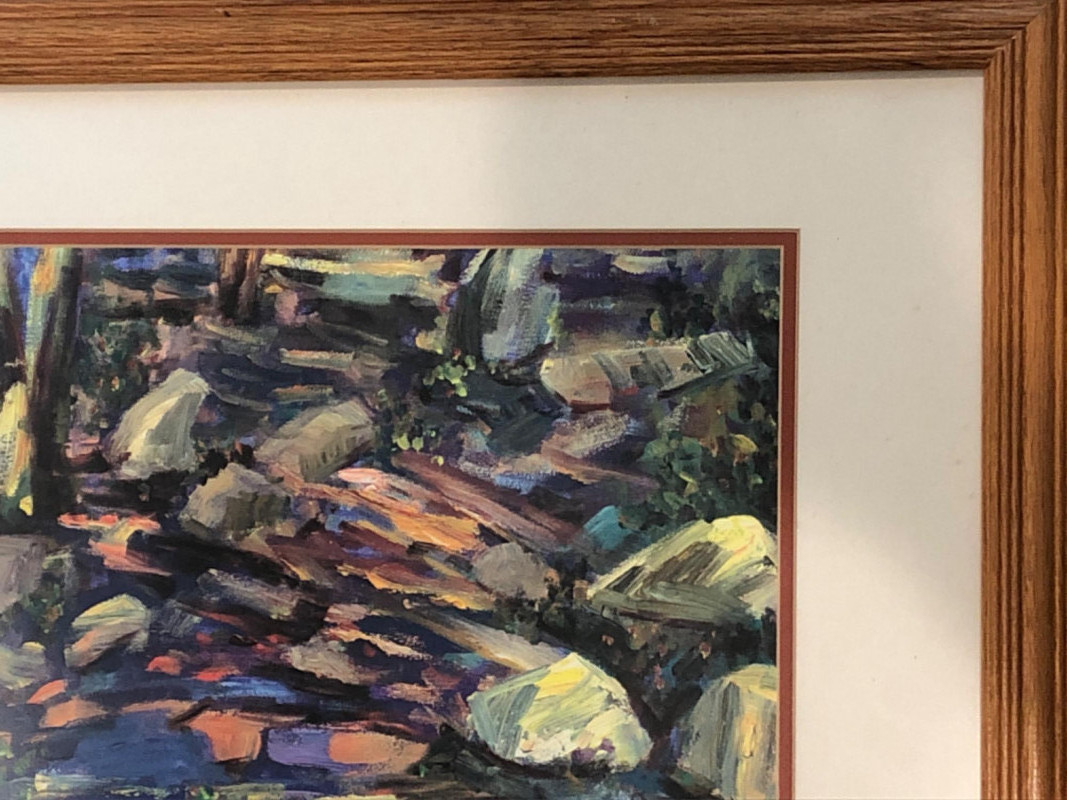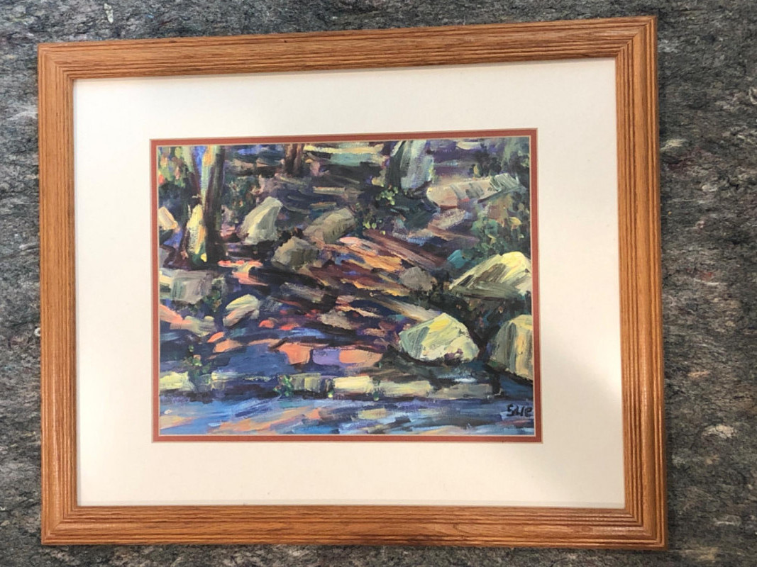 Expressive abstract landscape print with layered, textured brushwork in tones of forest green, slate blue, ochre, and warm neutrals. Depicts a wooded or rocky natural setting with gestural strokes and atmospheric depth. Signed “Sue” in the lower right corner. Artist unknown, but the composition and color harmony evoke a tranquil, organic rhythm. Set under glass in a natural wood frame with double matting. Ready to hang.