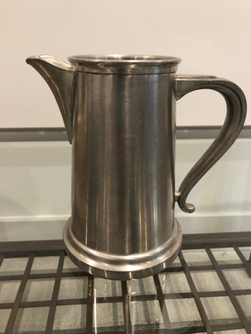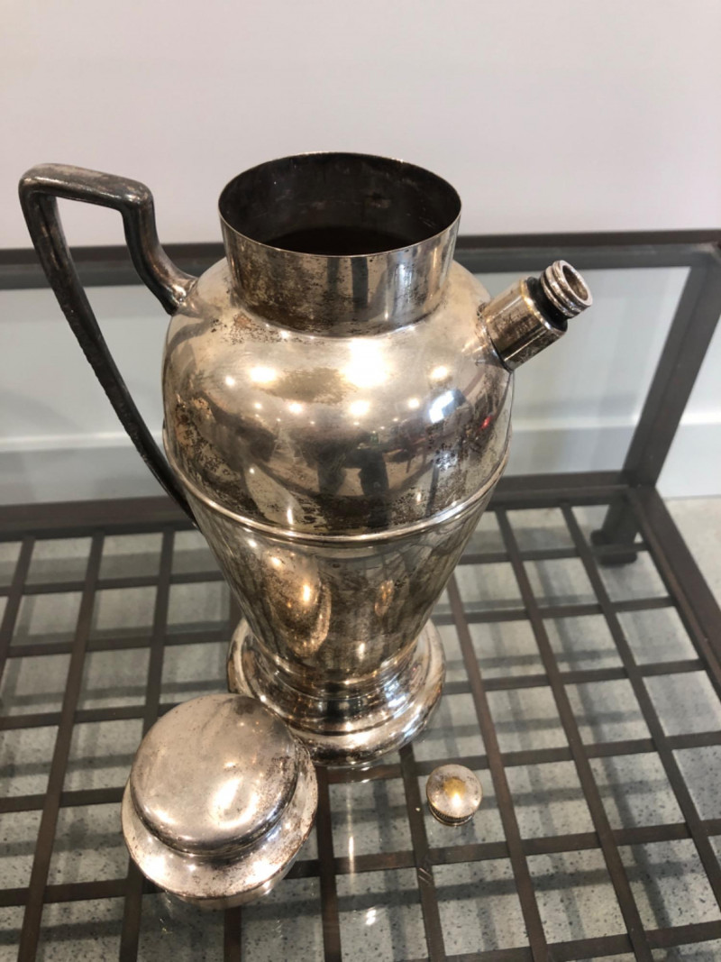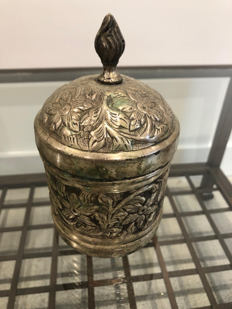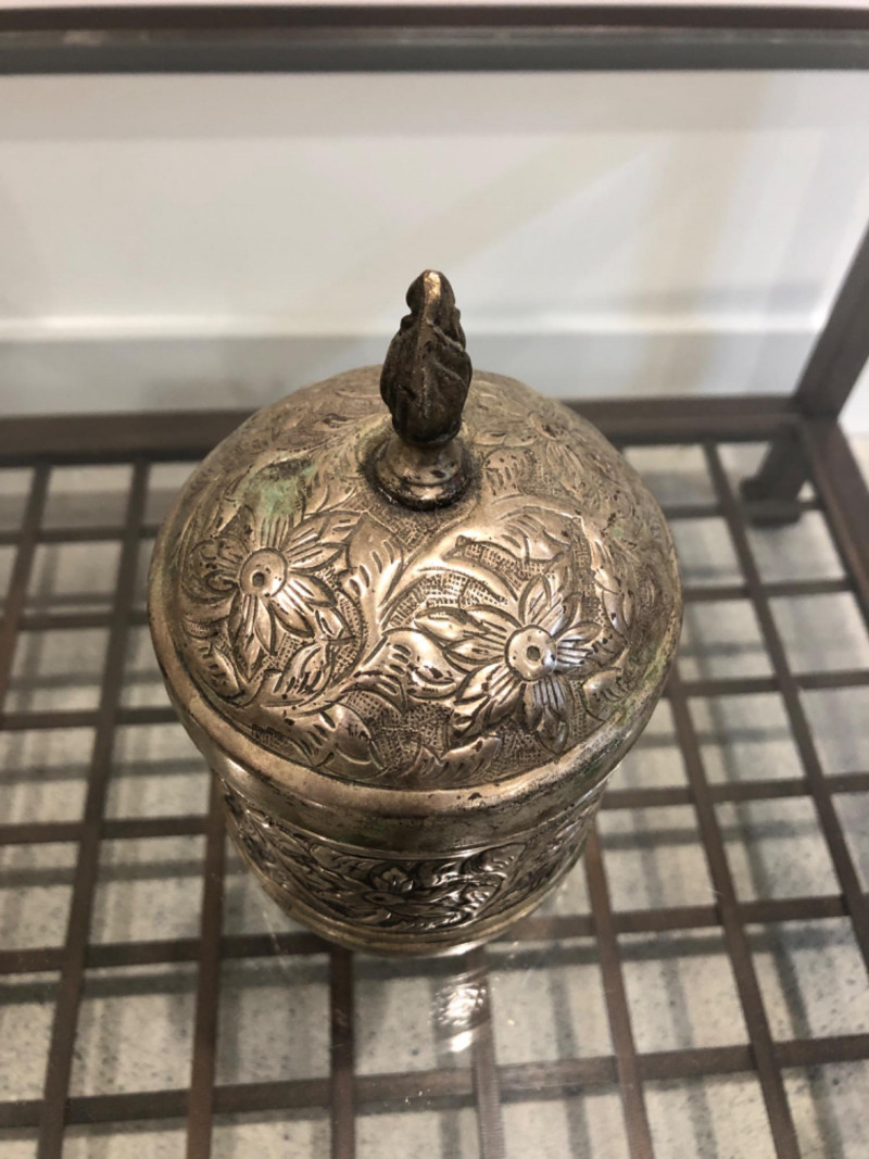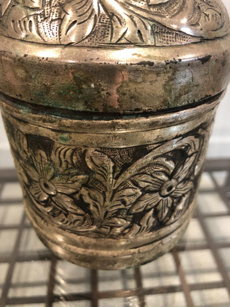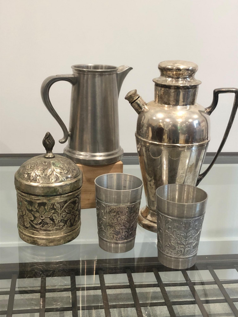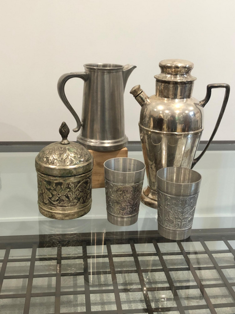 Collected grouping of five mixed-metal pieces including a tall cylindrical 1950's drink shaker (marked EPNS 301), a vintage pewter-style spouted jug with side handle, two etched metal cups, and an ornate lidded container marked “India” with raised floral motifs. Finishes range from bright polish to softly aged patina, giving the group textural variety and visual interest. A handsome shelf display or prop set for global, traditional, or industrial-inspired spaces. Dimensions: Drink Shaker - 11” H x 4” W Pewter Spouted & Handled Jug - 7” x 4.5 “ India Lidded Container - 6.5" H x 4" W Ornate Cups - 4” H x 3” W