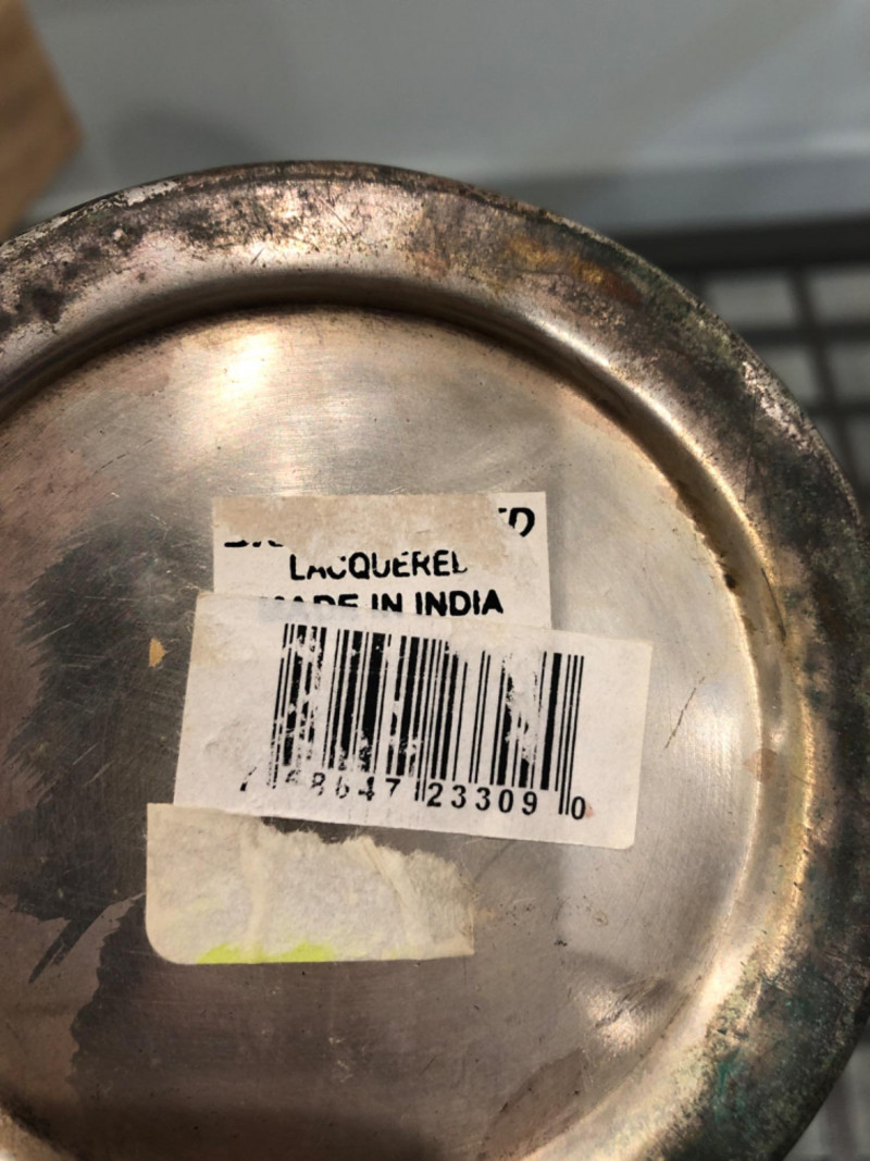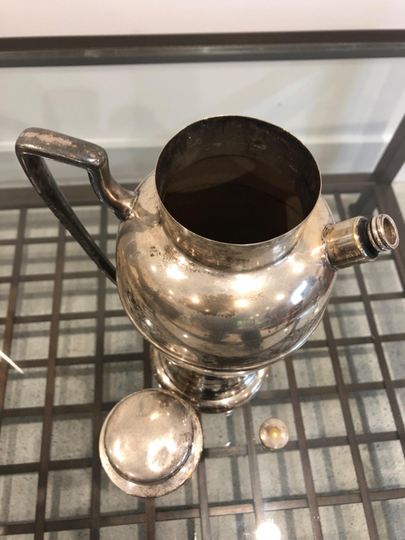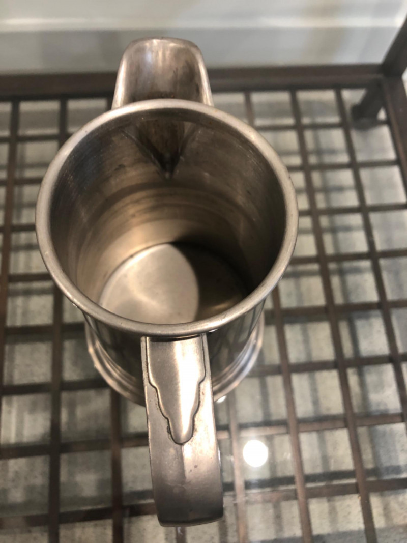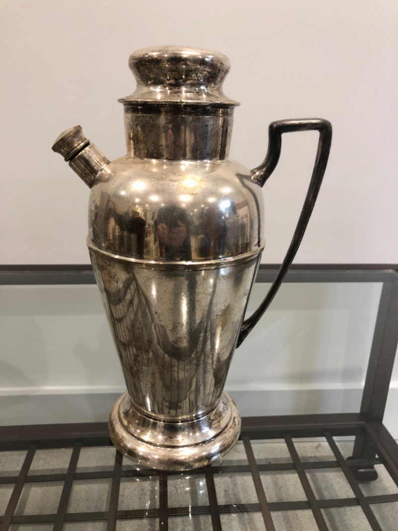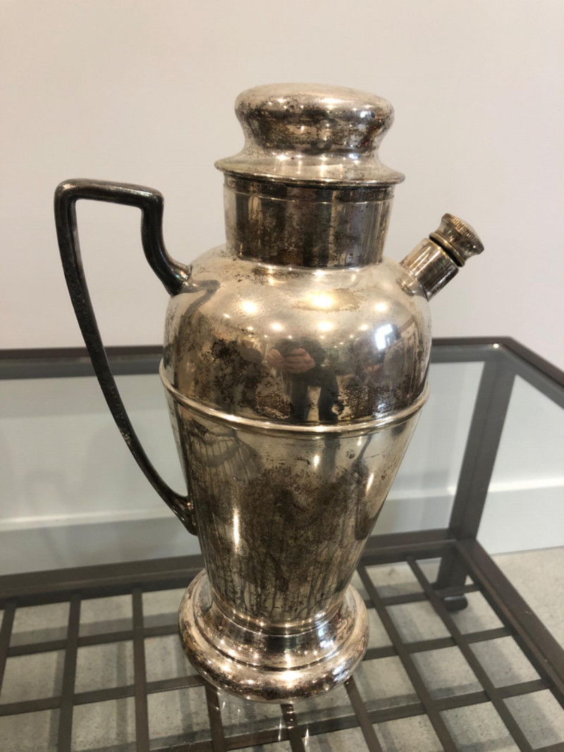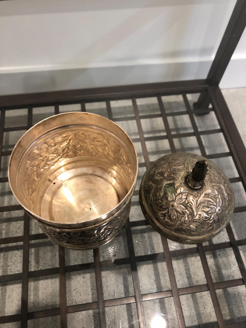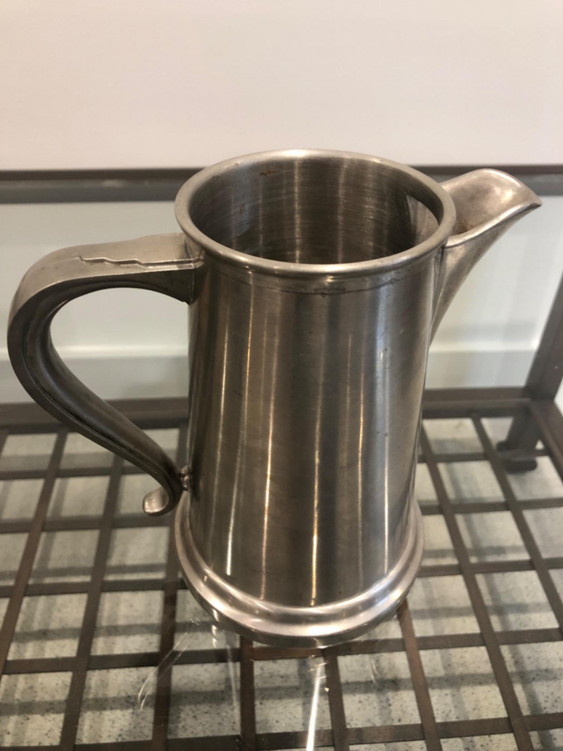 Collected grouping of five mixed-metal pieces including a tall cylindrical 1950's drink shaker (marked EPNS 301), a vintage pewter-style spouted jug with side handle, two etched metal cups, and an ornate lidded container marked “India” with raised floral motifs. Finishes range from bright polish to softly aged patina, giving the group textural variety and visual interest. A handsome shelf display or prop set for global, traditional, or industrial-inspired spaces. Dimensions: Drink Shaker - 11” H x 4” W Pewter Spouted & Handled Jug - 7” x 4.5 “ India Lidded Container - 6.5" H x 4" W Ornate Cups - 4” H x 3” W