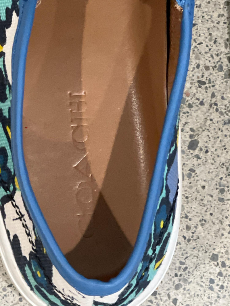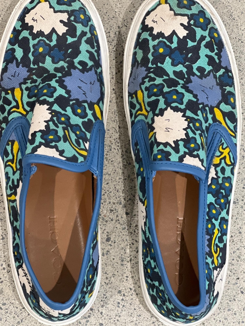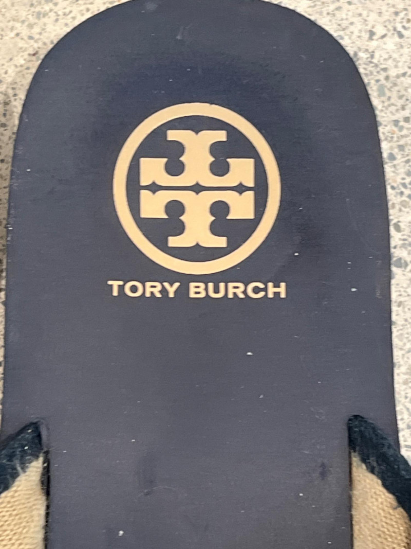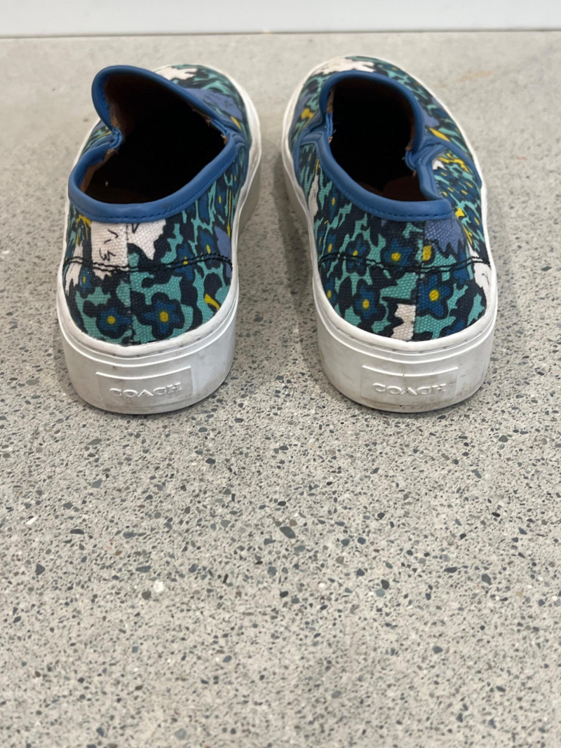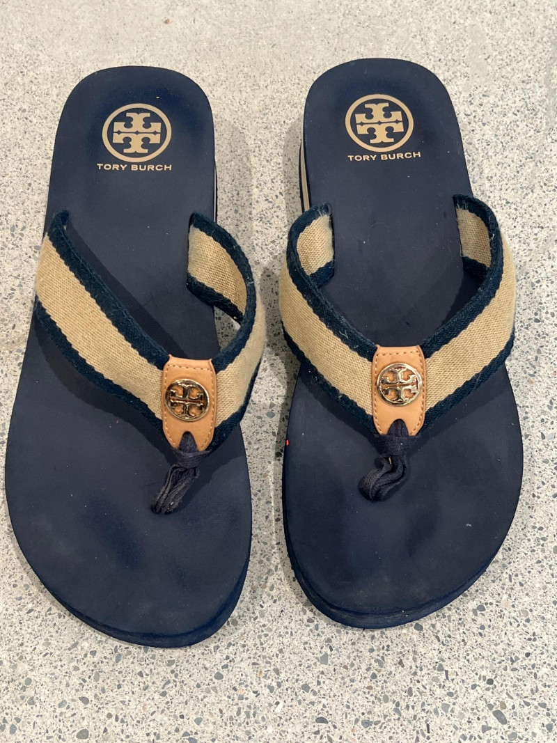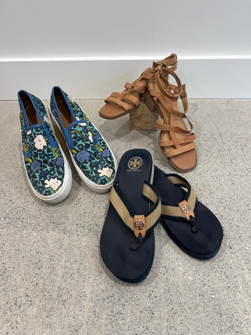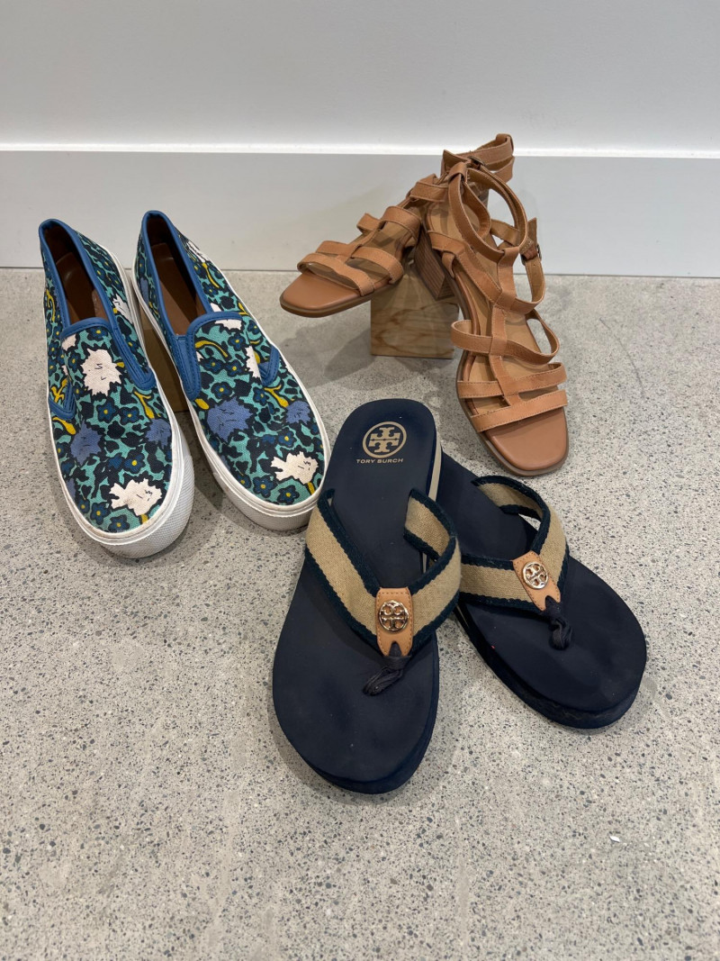 Group of 3 pairs of women’s shoes: Coach floral embroidered slip-on sneakers, Tory Burch navy and tan flip flops with logo medallion, and tan strappy block-heel sandals by Lucky Brand.