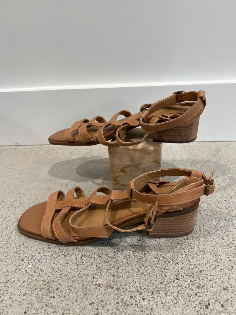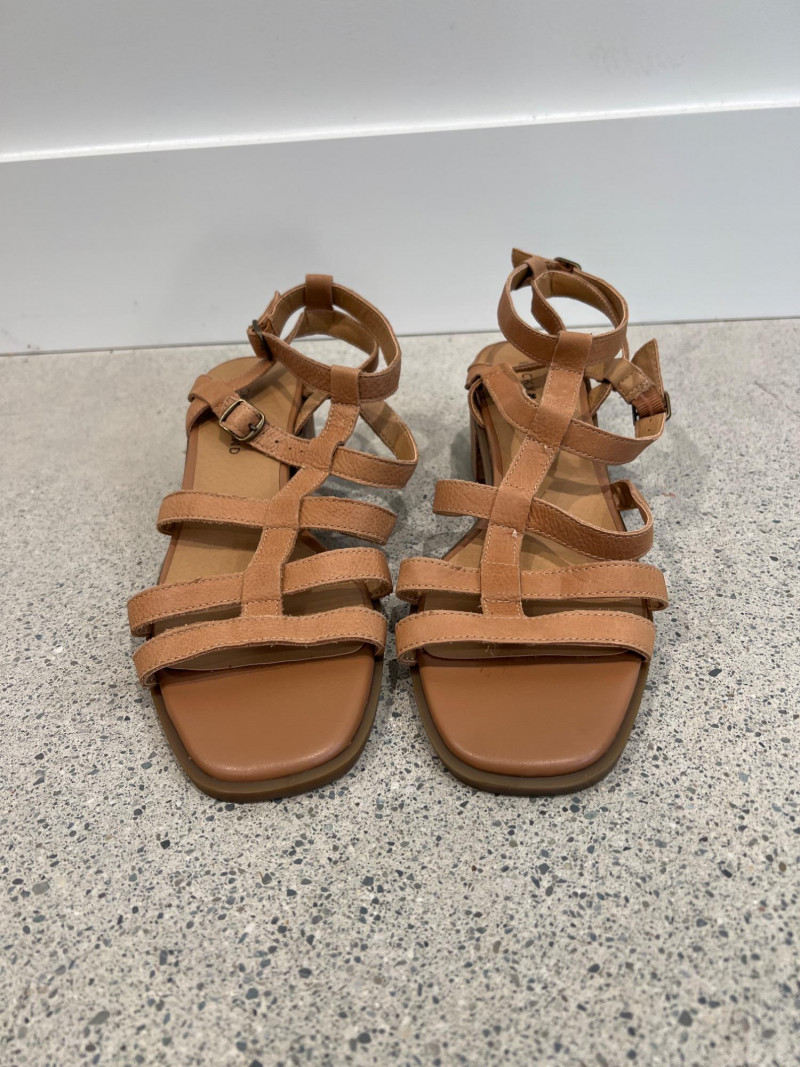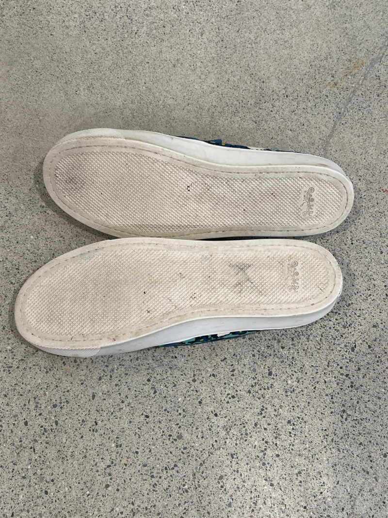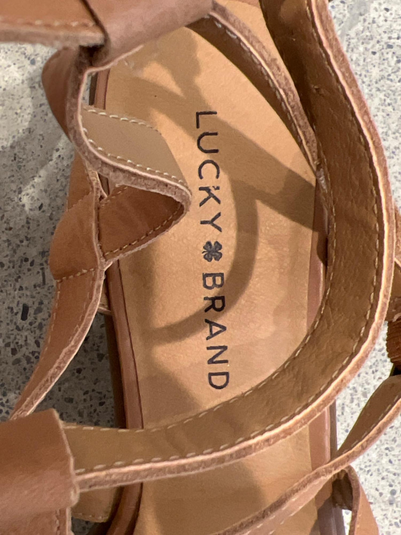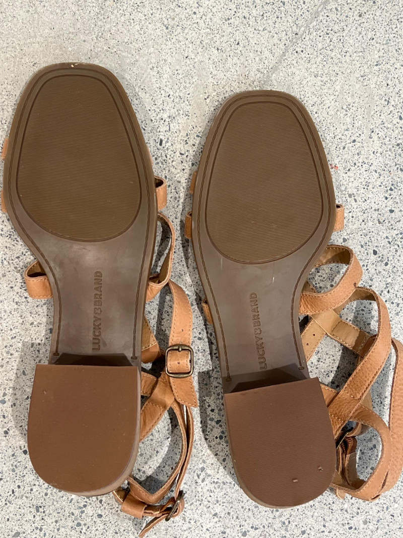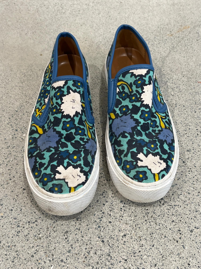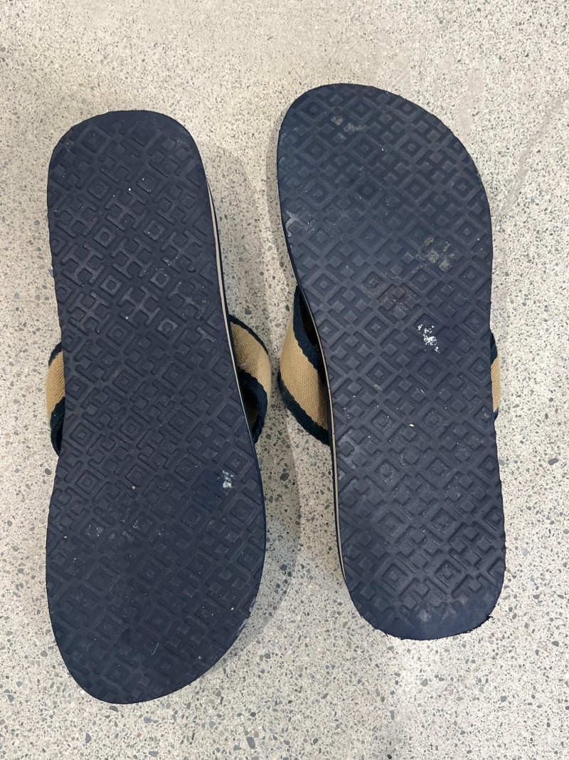 Group of 3 pairs of women’s shoes: Coach floral embroidered slip-on sneakers, Tory Burch navy and tan flip flops with logo medallion, and tan strappy block-heel sandals by Lucky Brand.