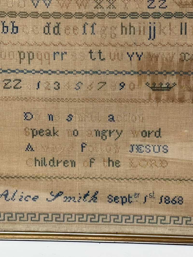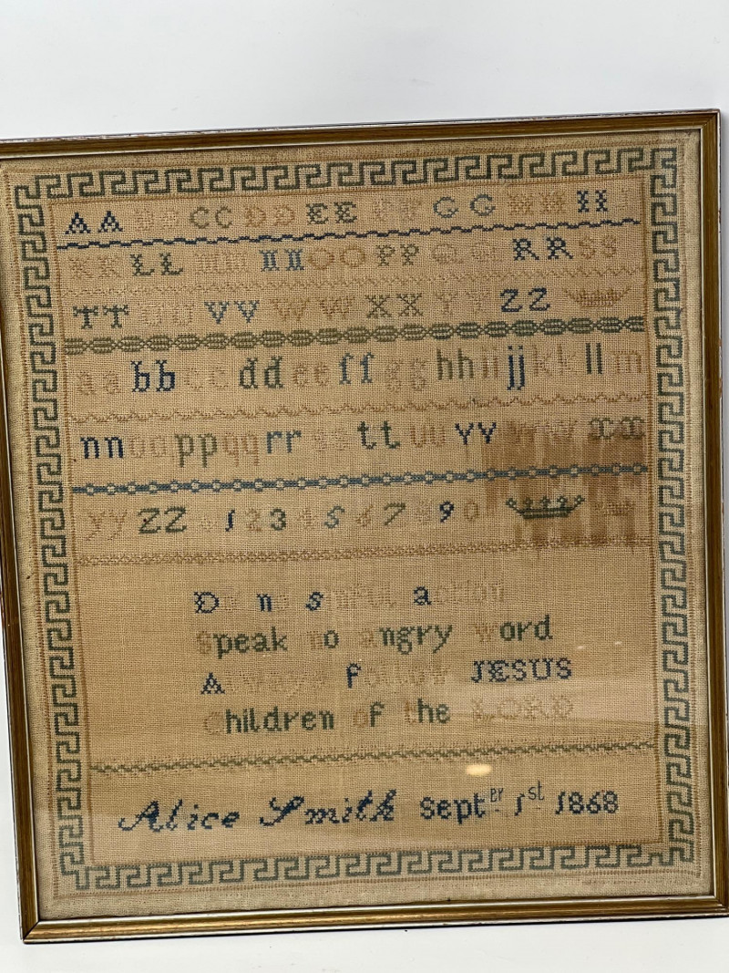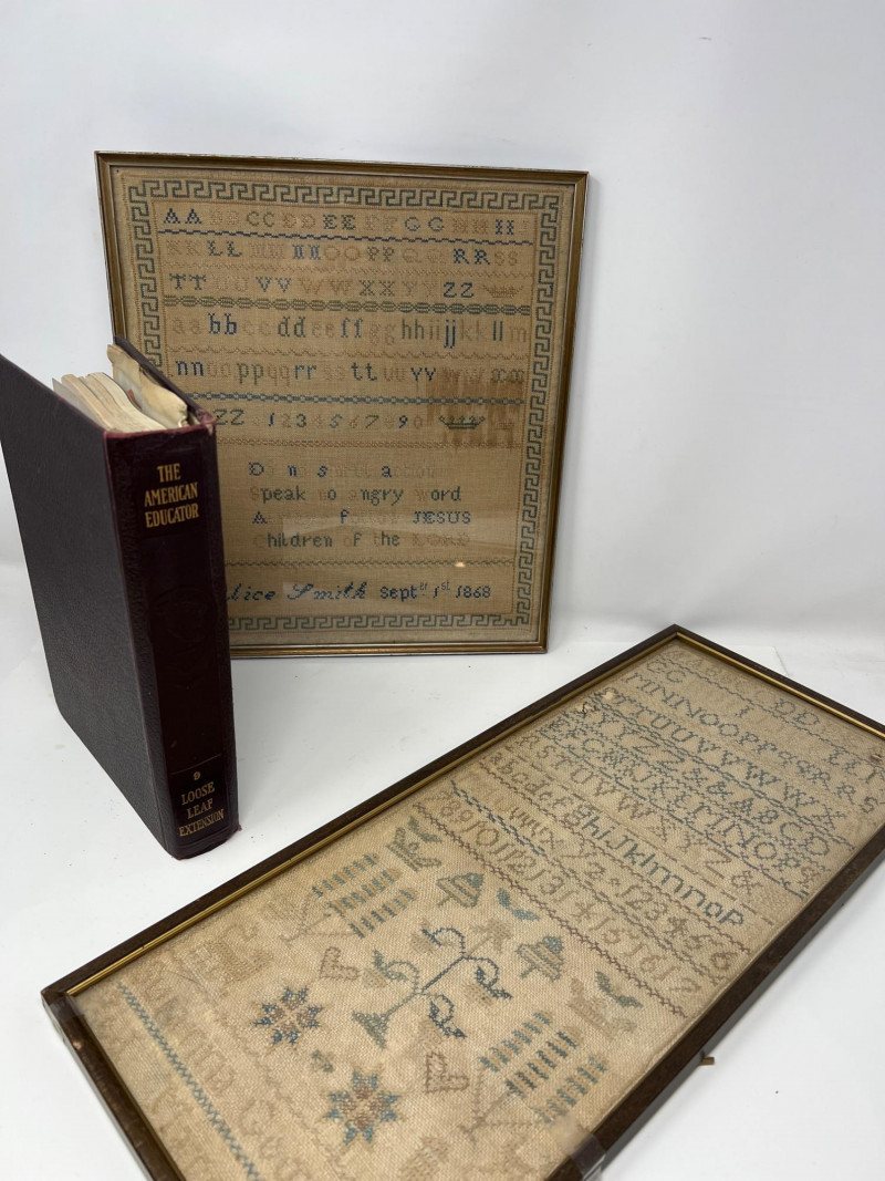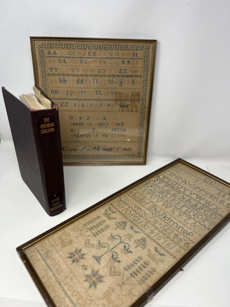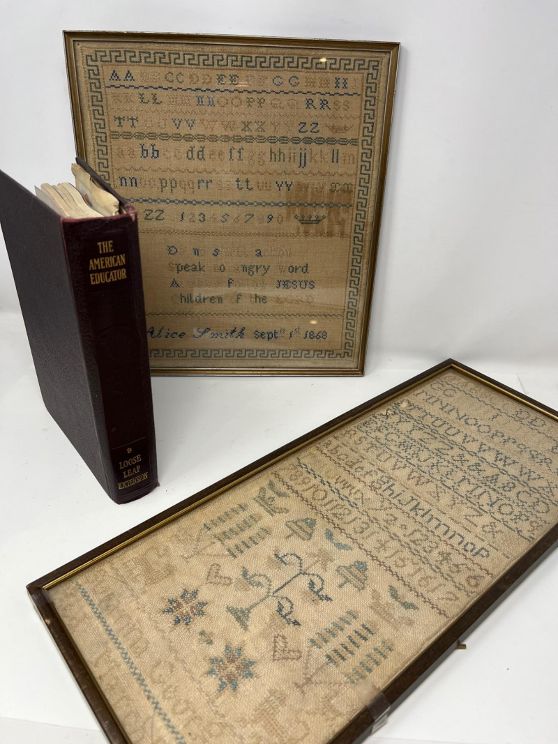 Two antique hand-stitched samplers from the 1800s, each featuring rows of alphabet letters, numbers, and traditional motif embroidery. One is signed “Alice Smith” and dated September 1st, 1868, with religious phrases and a decorative crown motif stitched in blue and tan thread. (13 inches wide x 12 inches tall) The second sampler includes multiple alphabets along with birds, trees, hearts, and floral elements in muted tones, framed under glass. (19 inches tall x 10 inches wide) Also included is a 1927 volume of The American Educator loose-leaf extension, documenting important events and developments from January to June of that year.