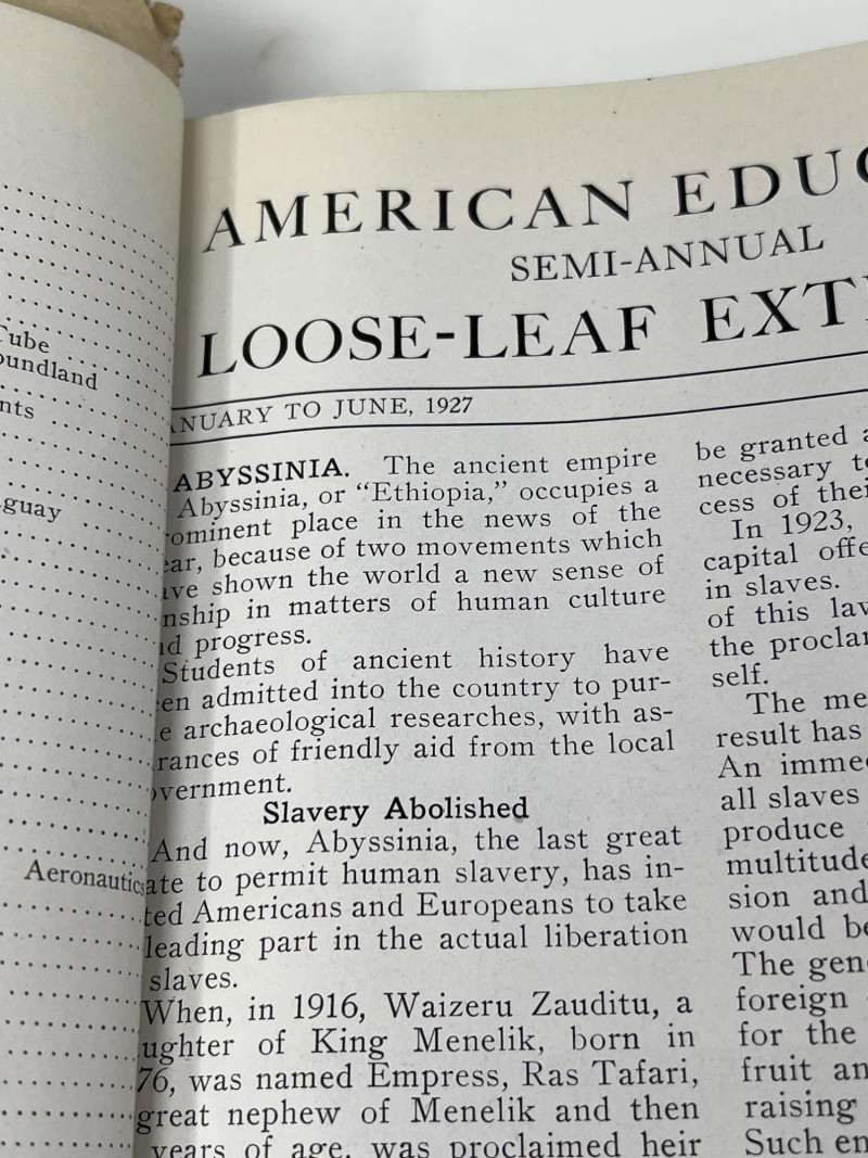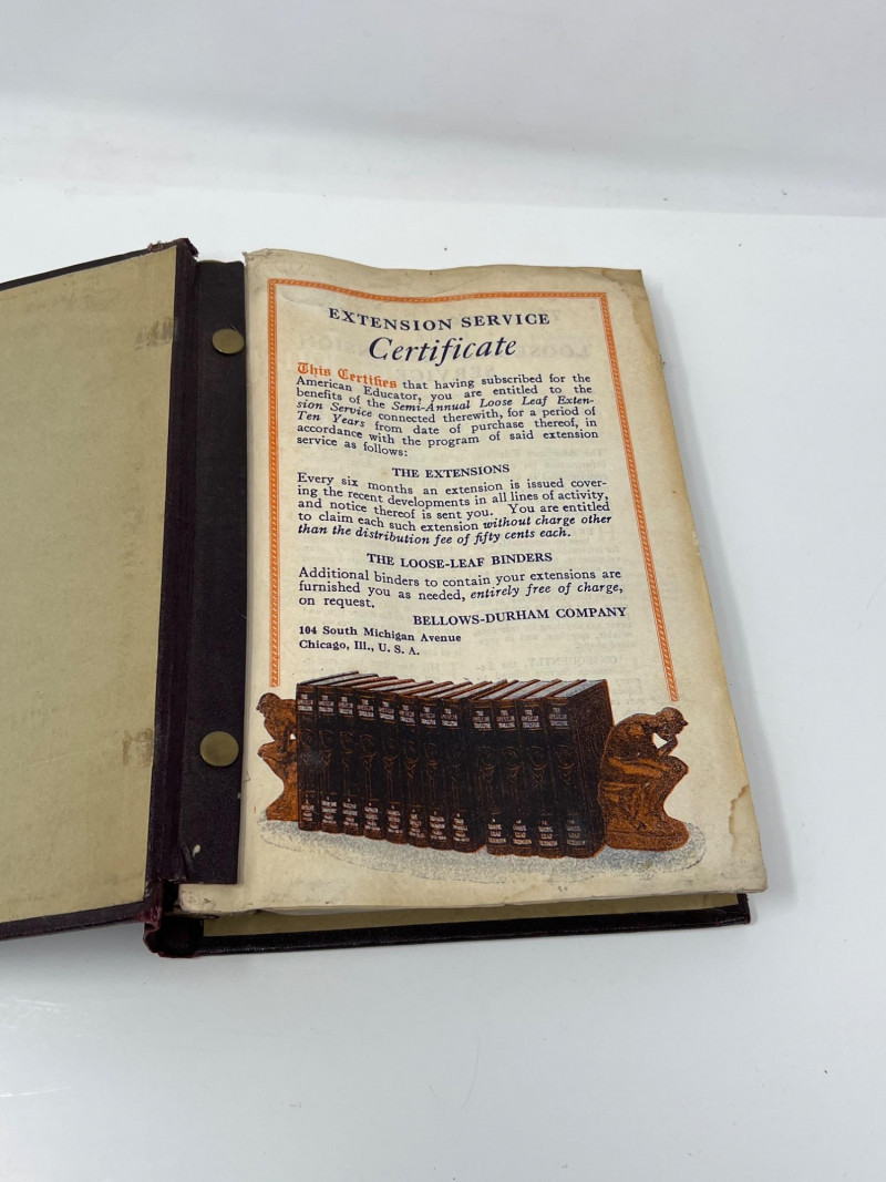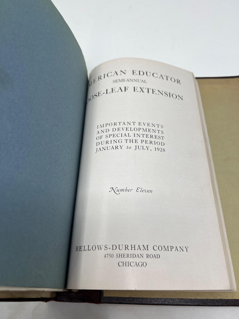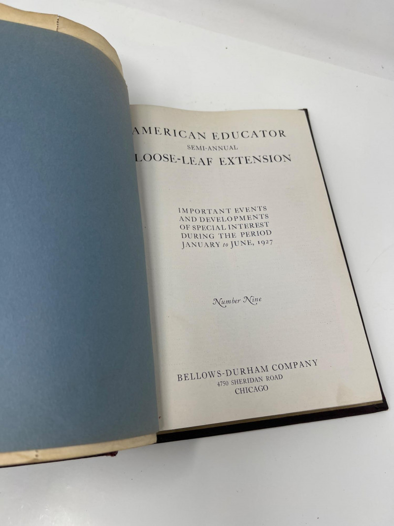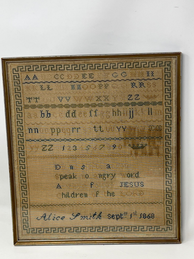 Two antique hand-stitched samplers from the 1800s, each featuring rows of alphabet letters, numbers, and traditional motif embroidery. One is signed “Alice Smith” and dated September 1st, 1868, with religious phrases and a decorative crown motif stitched in blue and tan thread. (13 inches wide x 12 inches tall) The second sampler includes multiple alphabets along with birds, trees, hearts, and floral elements in muted tones, framed under glass. (19 inches tall x 10 inches wide) Also included is a 1927 volume of The American Educator loose-leaf extension, documenting important events and developments from January to June of that year.