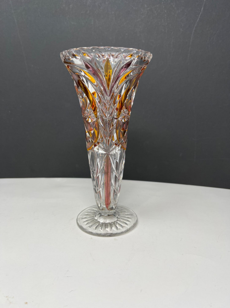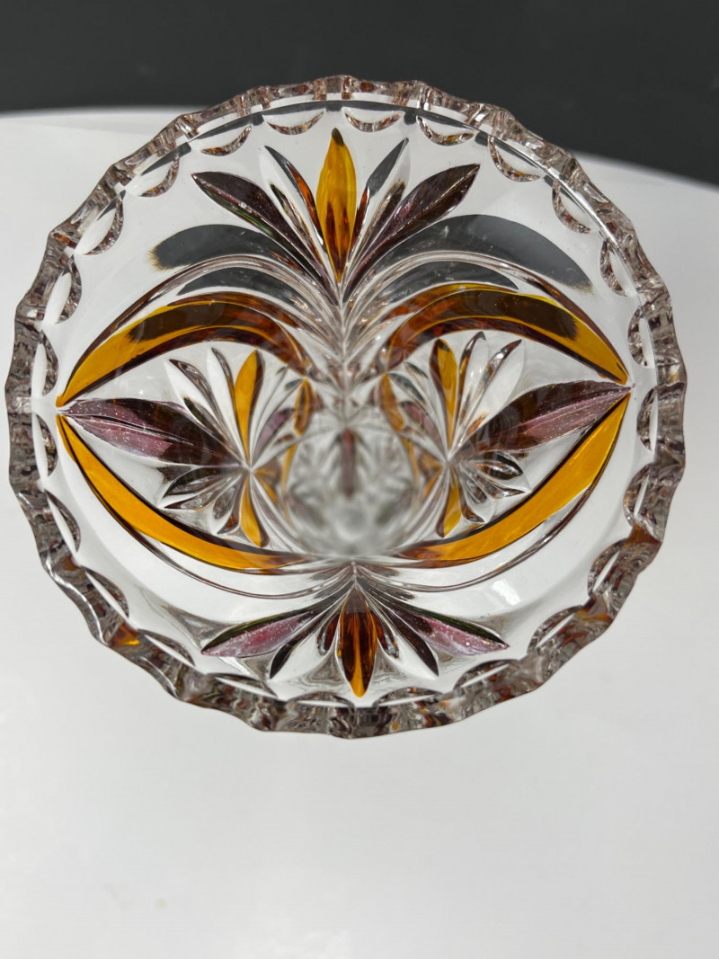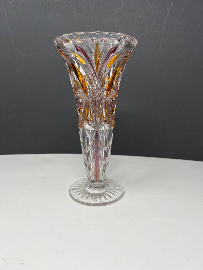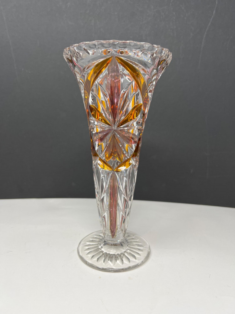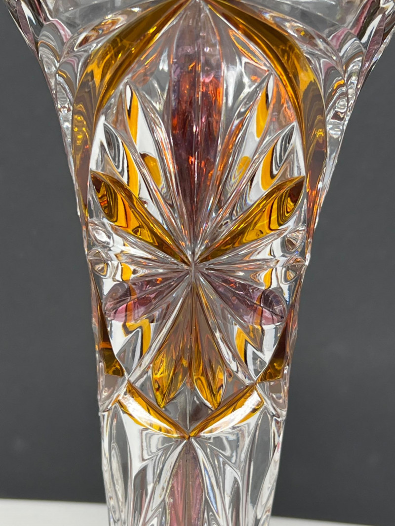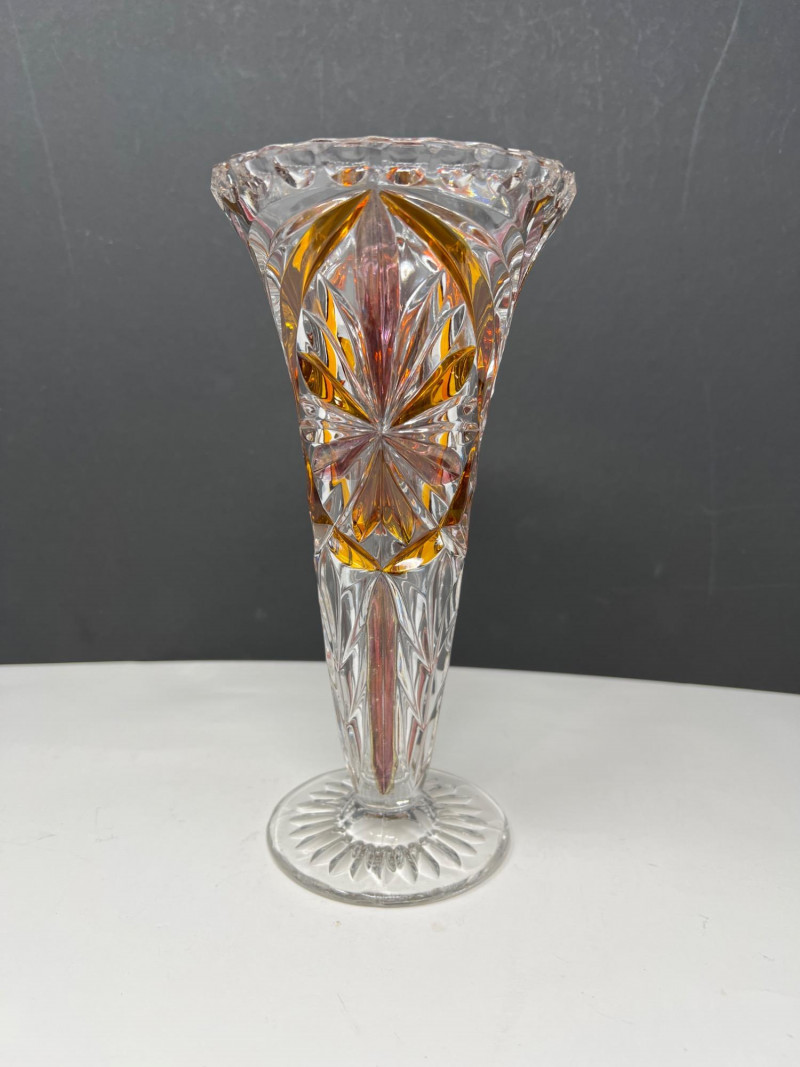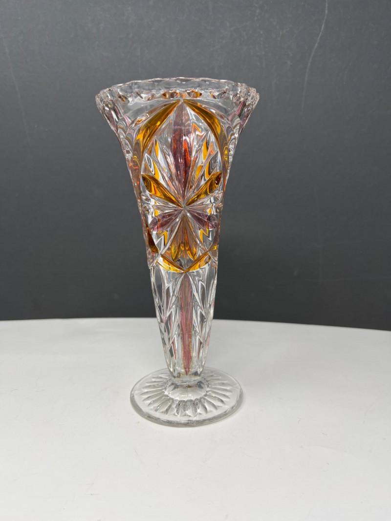 Tall, pedestal-base vase with vivid amber and clear cut glass design. Features a radiant starburst and petal motif, with intricate scalloped top and faceted base.