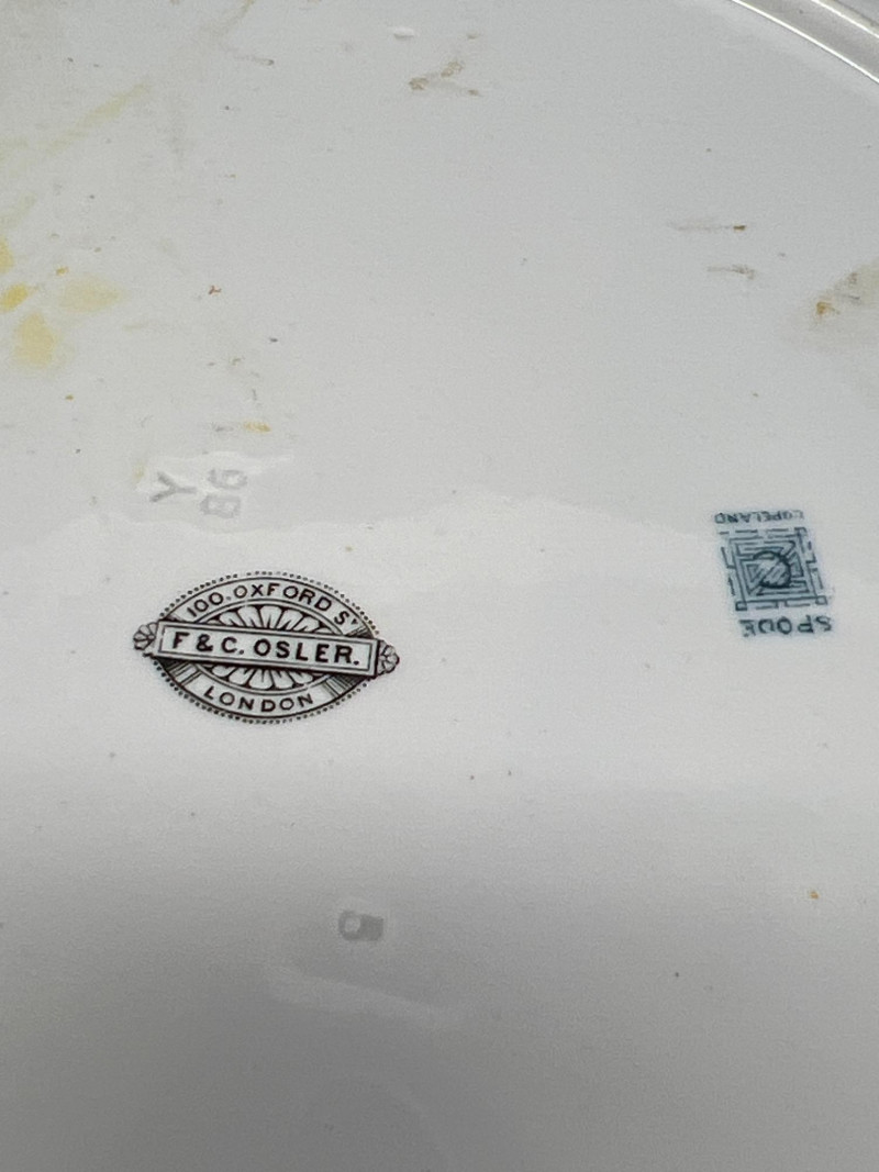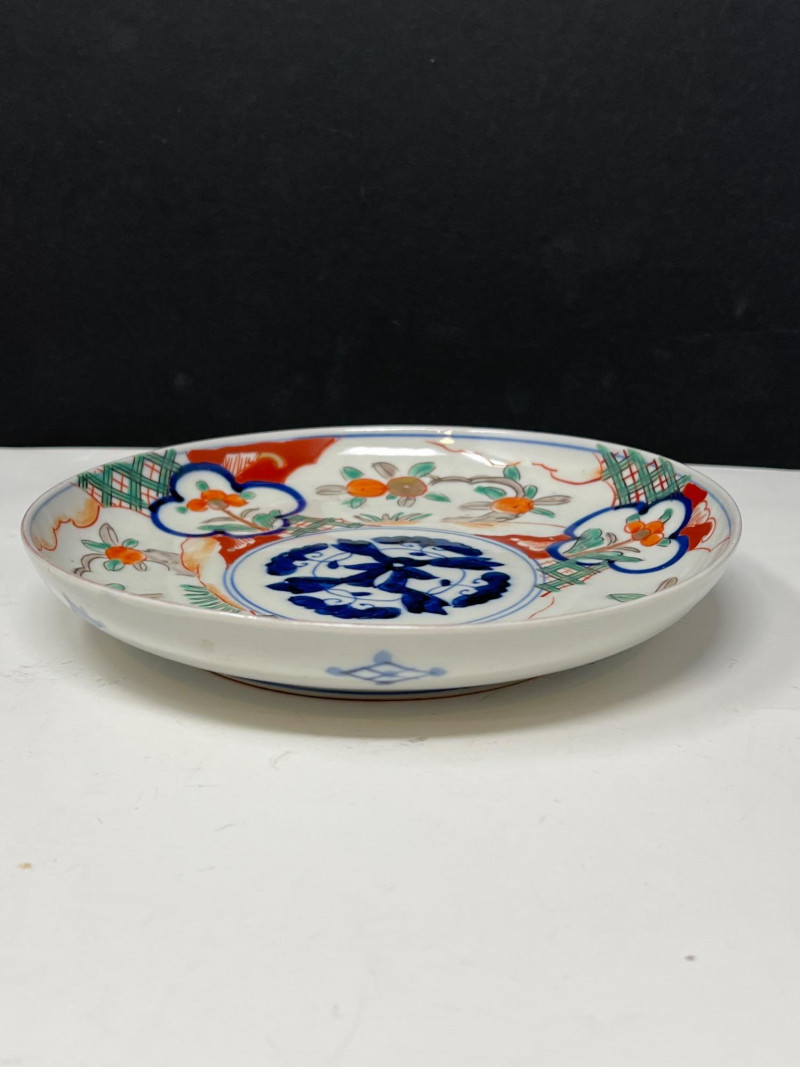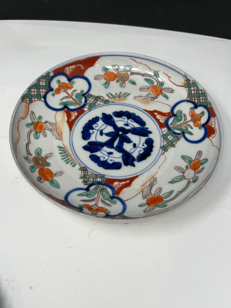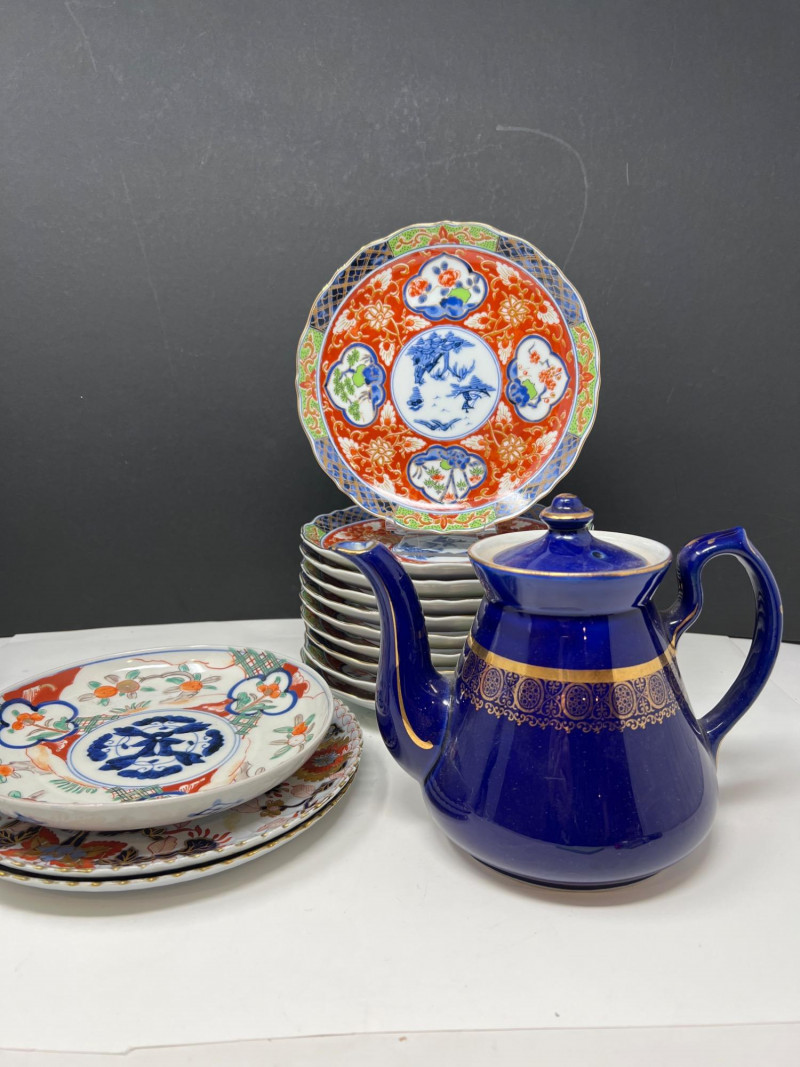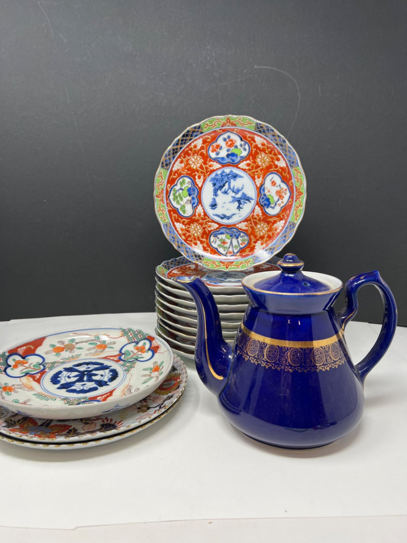 Mixed lot of Asian-style porcelain and ceramic dishware. Includes Imari-style plates with vibrant hand-painted floral and landscape designs and a red Chinese mark on the base, a deep cobalt blue Hall 5-cup teapot with gold detailing (063X), and assorted pieces marked Spode Copeland and F&C Osler, London. A colorful and collectible group blending Chinese, Japanese, and English influences. Tea pot measures 6.5 in H x 8 in L x 4 in W Plates measure 8.25 in diameter and 7.25 in diameter. Due to Size/Fragility: This Item Is Not Eligible for Shipping. Available for Local Pickup Only.