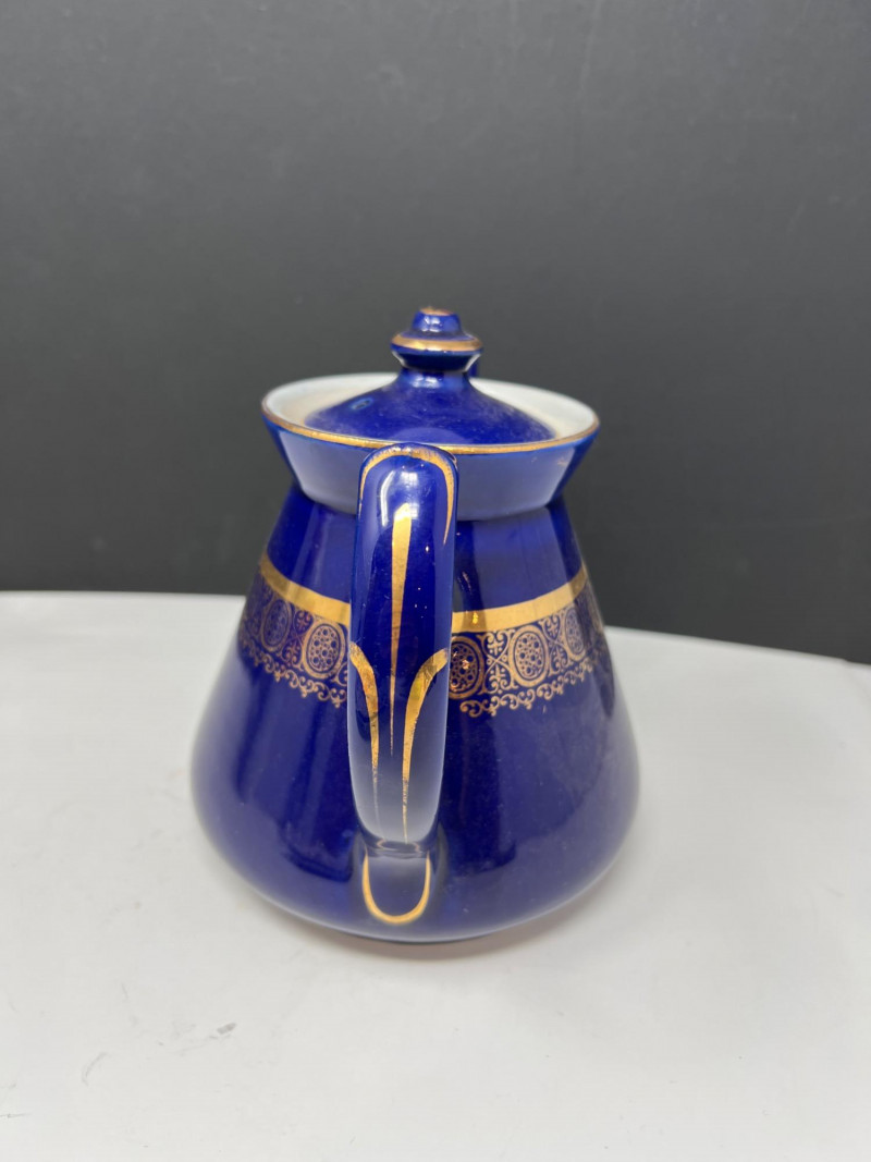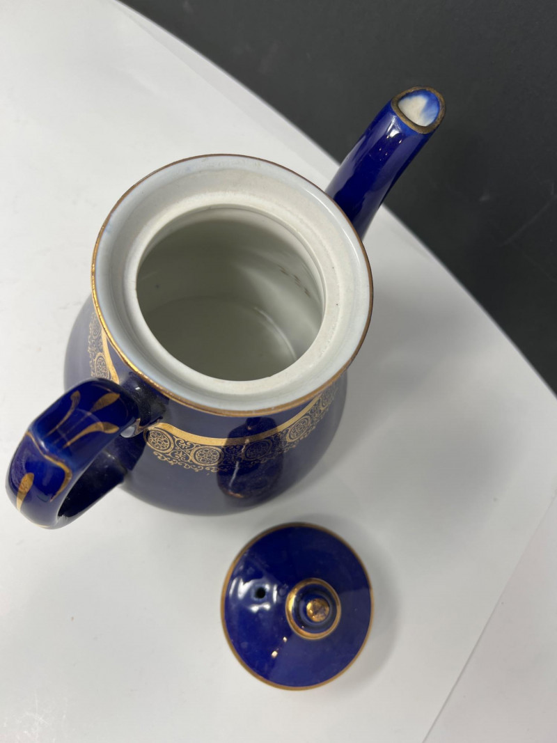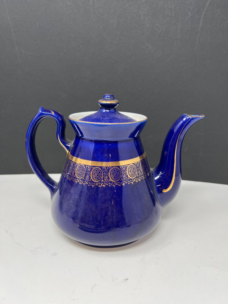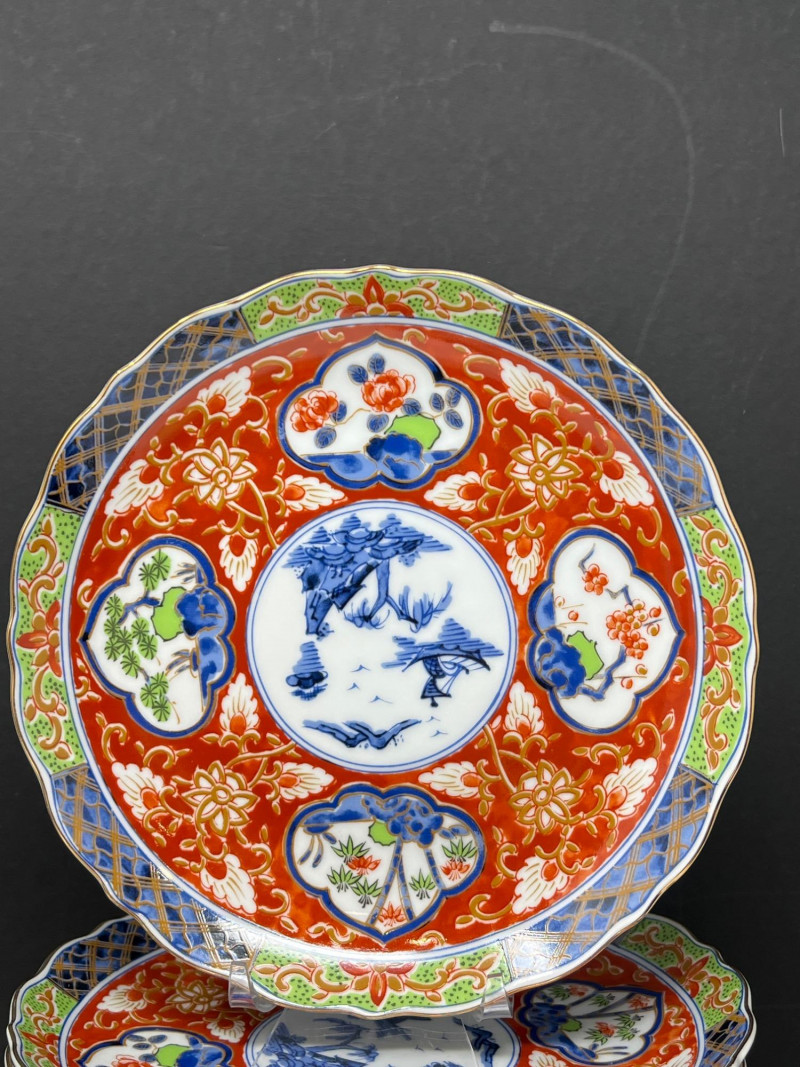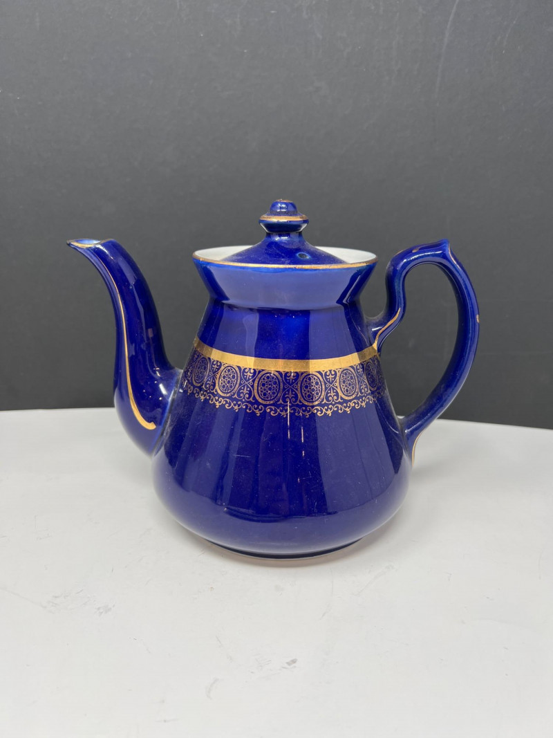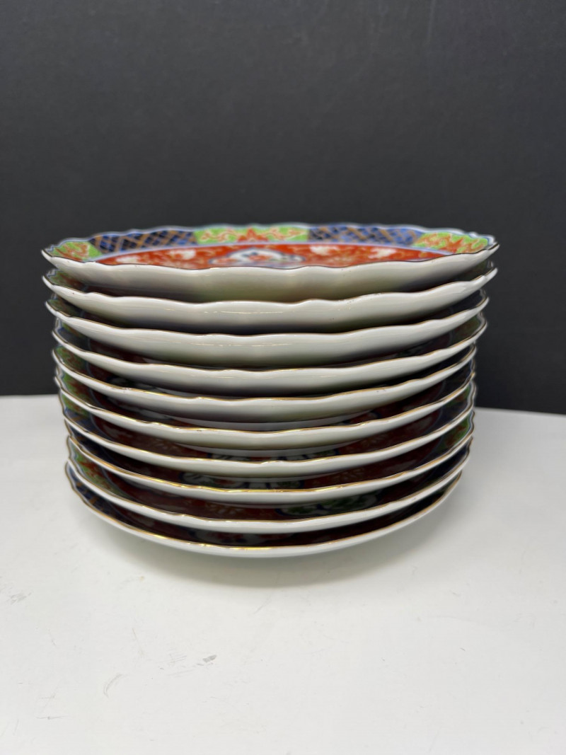 Mixed lot of Asian-style porcelain and ceramic dishware. Includes Imari-style plates with vibrant hand-painted floral and landscape designs and a red Chinese mark on the base, a deep cobalt blue Hall 5-cup teapot with gold detailing (063X), and assorted pieces marked Spode Copeland and F&C Osler, London. A colorful and collectible group blending Chinese, Japanese, and English influences. Tea pot measures 6.5 in H x 8 in L x 4 in W Plates measure 8.25 in diameter and 7.25 in diameter. Due to Size/Fragility: This Item Is Not Eligible for Shipping. Available for Local Pickup Only.