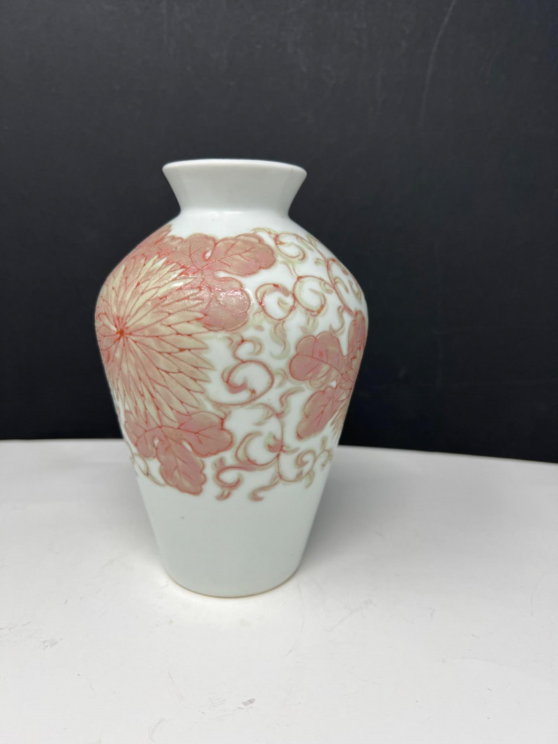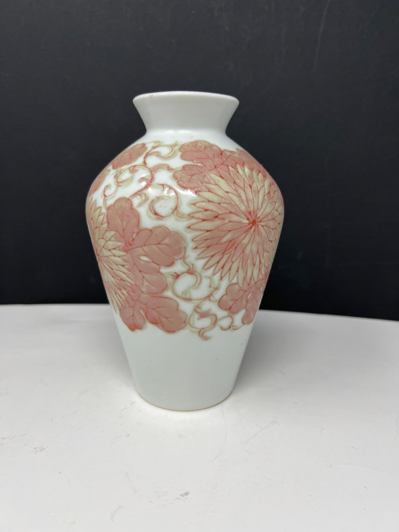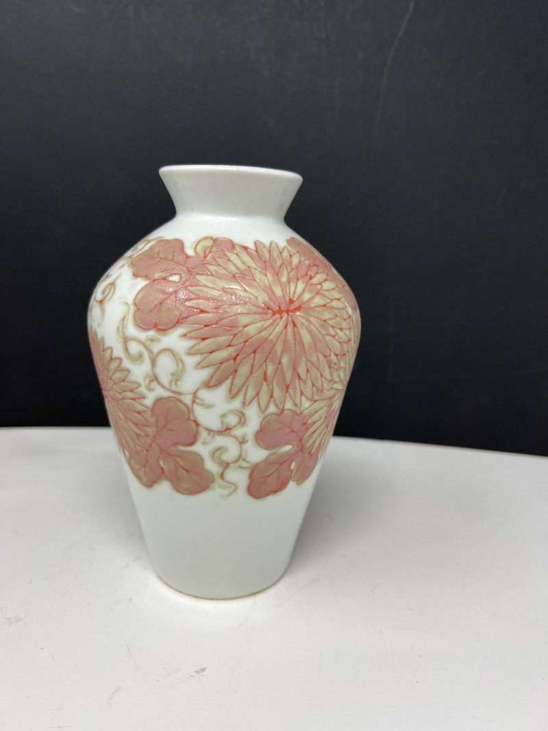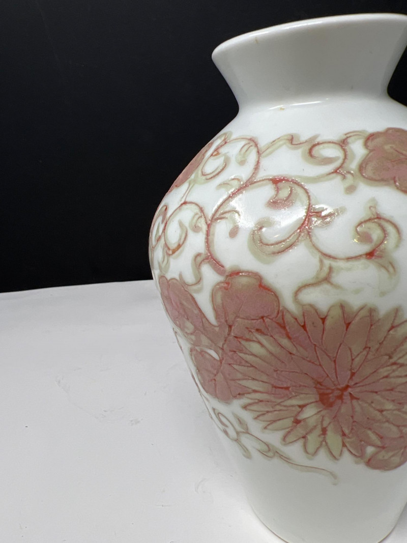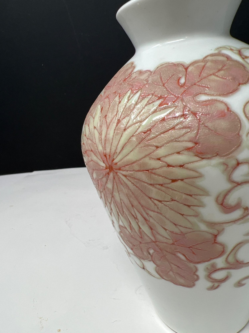 White porcelain vase featuring detailed raised pink chrysanthemum blossoms with leafy green stems encircling the body. Accented with subtle hand-painted detailing and a soft gloss glaze that enhances the textured relief. The base bears a simplified Chinese character signature, indicating likely mainland Chinese origin—possibly mid-to-late 20th century. A refined decorative piece blending craftsmanship and classic floral symbolism, ideal for display in both traditional and contemporary interiors.