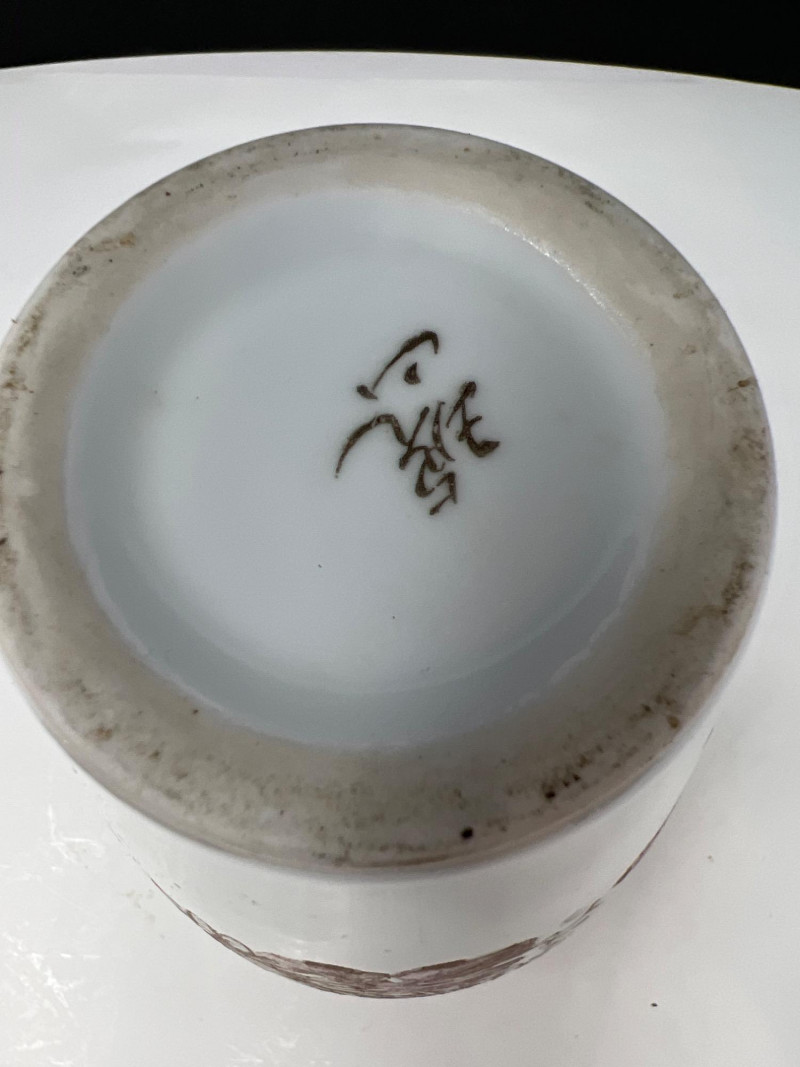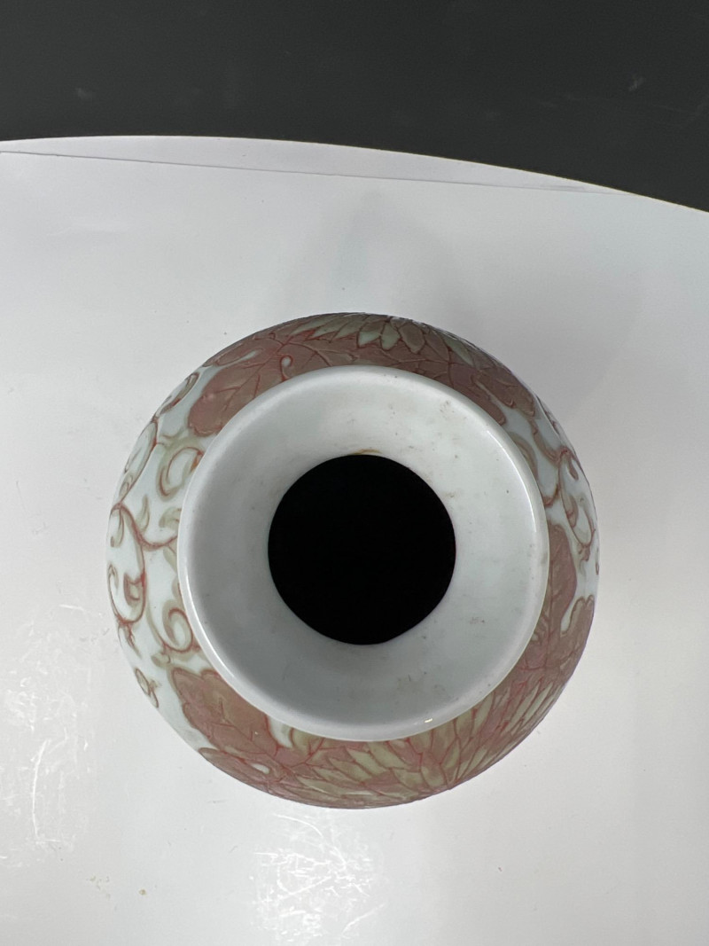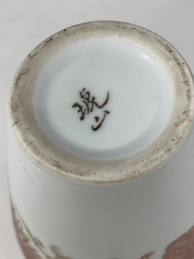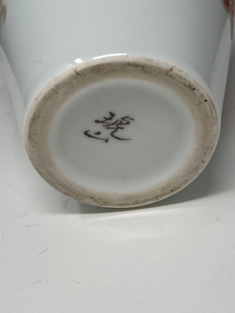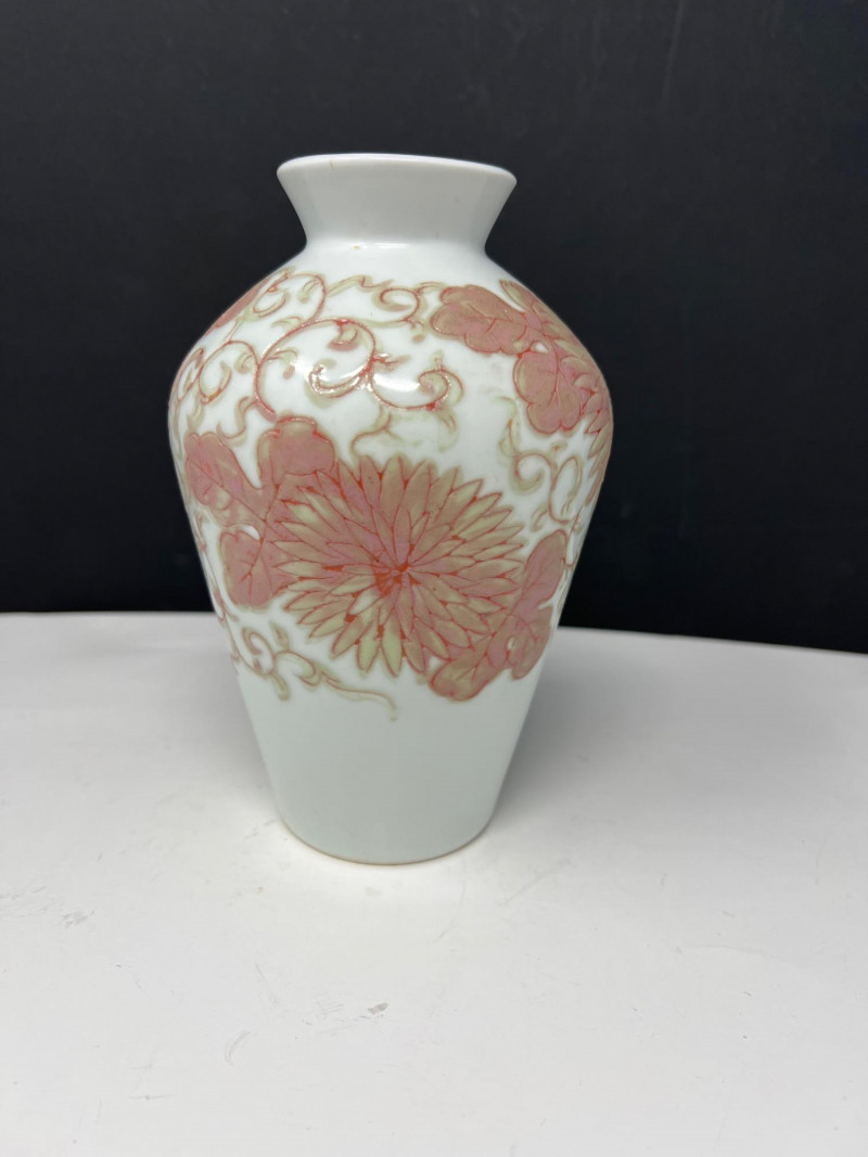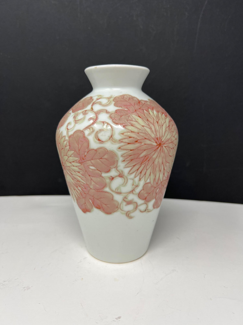 White porcelain vase featuring detailed raised pink chrysanthemum blossoms with leafy green stems encircling the body. Accented with subtle hand-painted detailing and a soft gloss glaze that enhances the textured relief. The base bears a simplified Chinese character signature, indicating likely mainland Chinese origin—possibly mid-to-late 20th century. A refined decorative piece blending craftsmanship and classic floral symbolism, ideal for display in both traditional and contemporary interiors.
