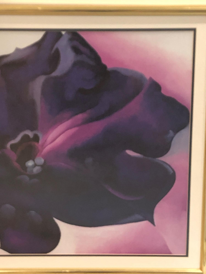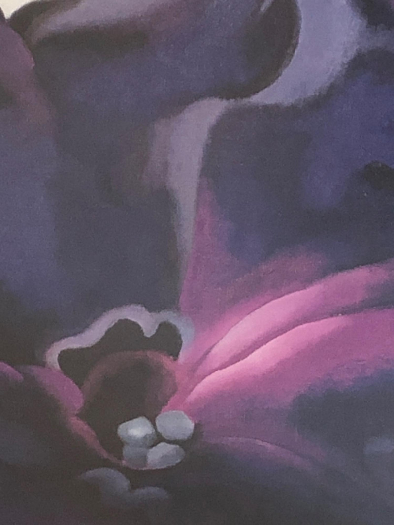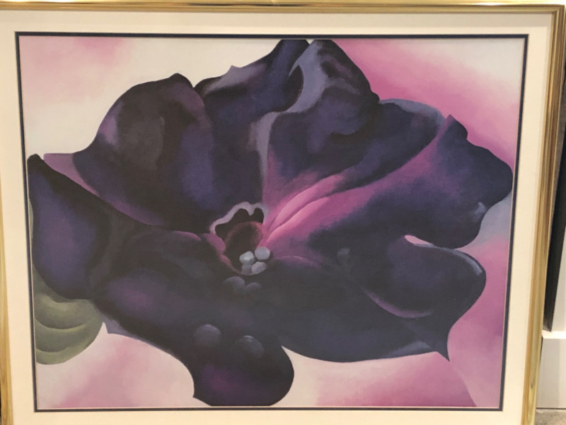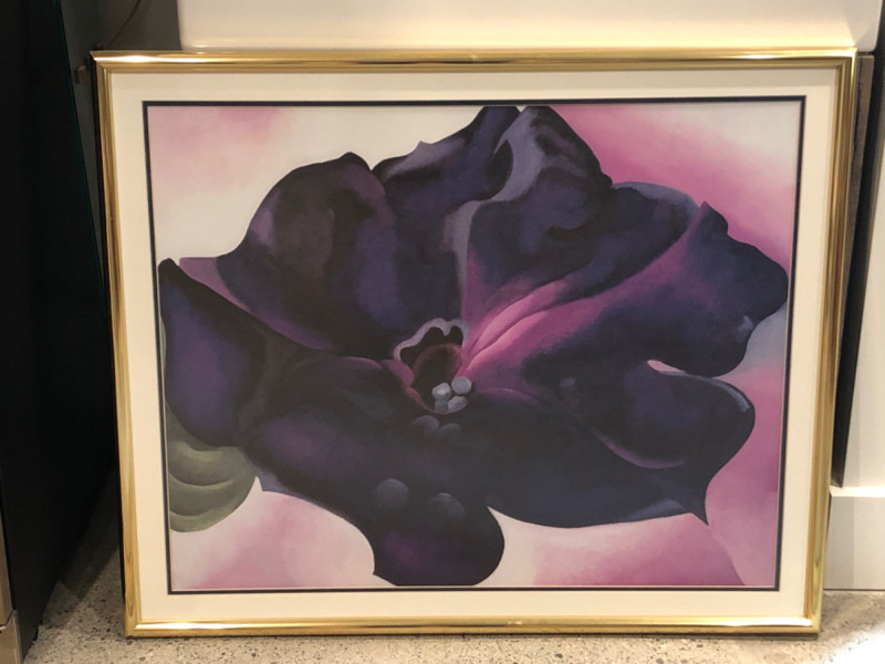 Bold floral print in the style of Georgia O’Keeffe, featuring a black and purple petunia with soft pink background tones. Print appears to be unsigned. Due to Size/Fragility: This Item Is Not Eligible for Shipping. Available for Local Pickup Only. Notes on artist: Georgia O’Keeffe - American, 1887–1986 Georgia O’Keeffe’s lush, symbolic paintings of flowers and the American Southwest are some of the most instantly recognizable works of the 20th century. The late artist imbued all her landscapes and close-up depictions of nature with a sense of mythological power. Skulls and pastel petals fill her scenes, though her pared-down compositions could also veer towards abstraction. O’Keeffe was born in Wisconsin and studied at the School of the Art Institute of Chicago and the Art Students League in New York, where she briefly lived with her photographer husband Alfred Stieglitz—and painted cityscapes—before permanently moving to New Mexico in 1949. This setting dominated her later canvases. O’Keeffe’s work has been exhibited across the world and belongs in the collections of institutions including the Museum of Modern Art, the Art Institute of Chicago, the National Gallery of Art, and the Whitney Museum of American Art, among many others. In 2014, O’Keeffe’s 1932 painting Jimson Weed/White Flower No. 1 sold for $44.4 million and set a record for the most expensive artwork by a woman ever sold.