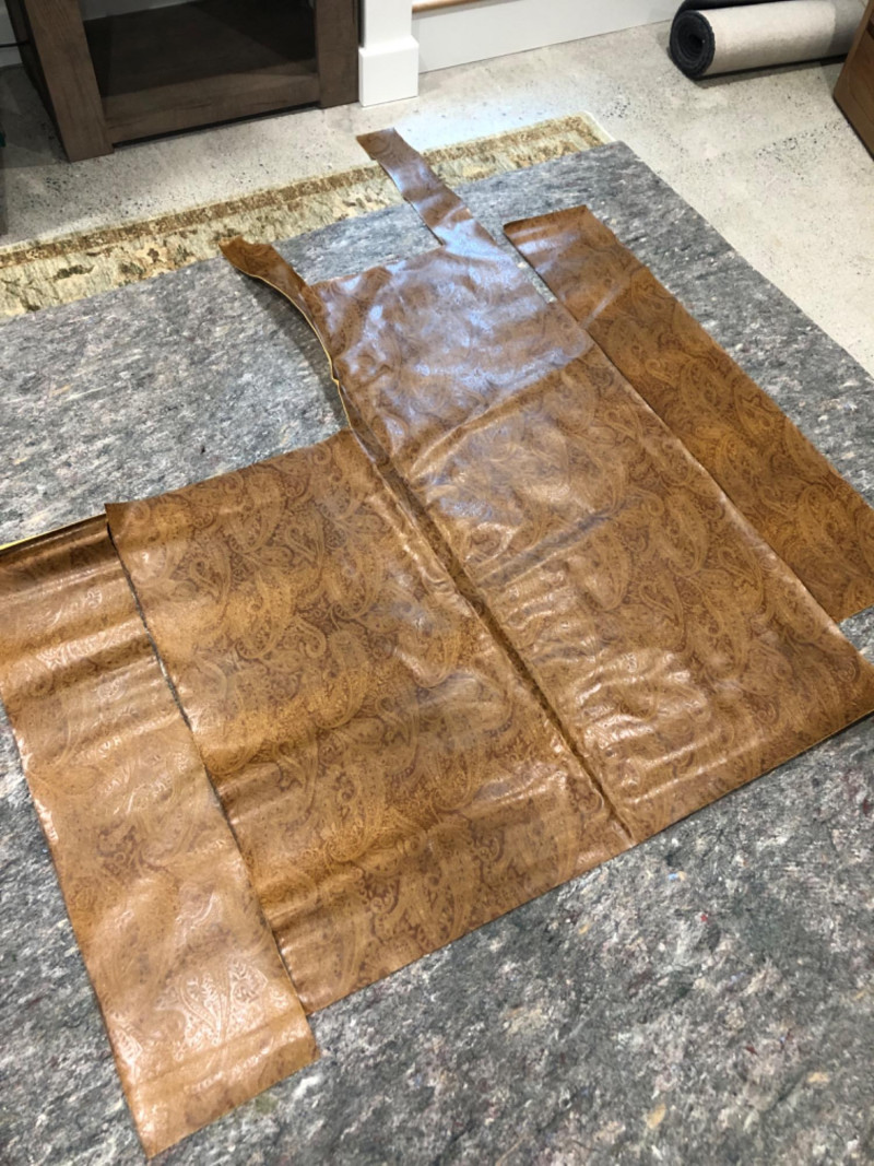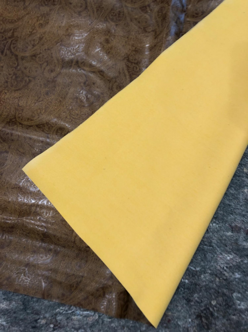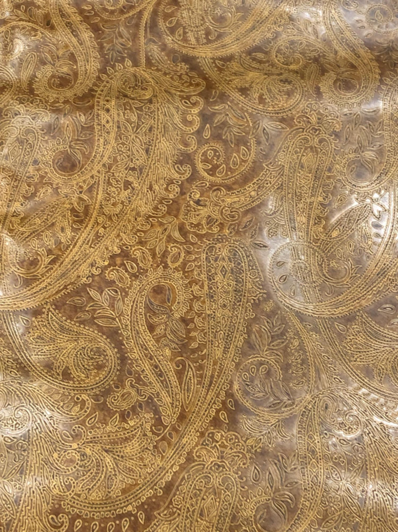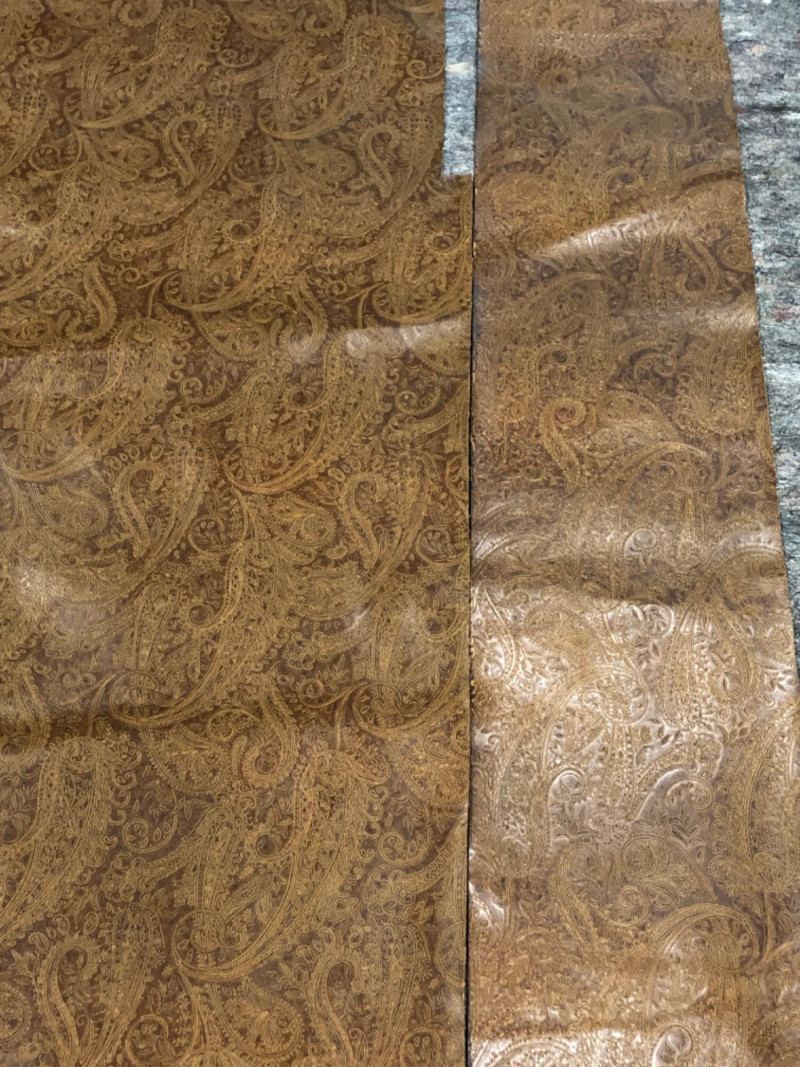 Vintage-style polyurethane fabric remnants with tooled floral paisley pattern in a western-style design. Set includes approximately 2 square yards across four irregular pieces. Textured surface with a golden brown finish and soft backing. Great for DIY projects, upholstery accents, or craft use.