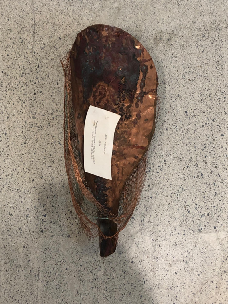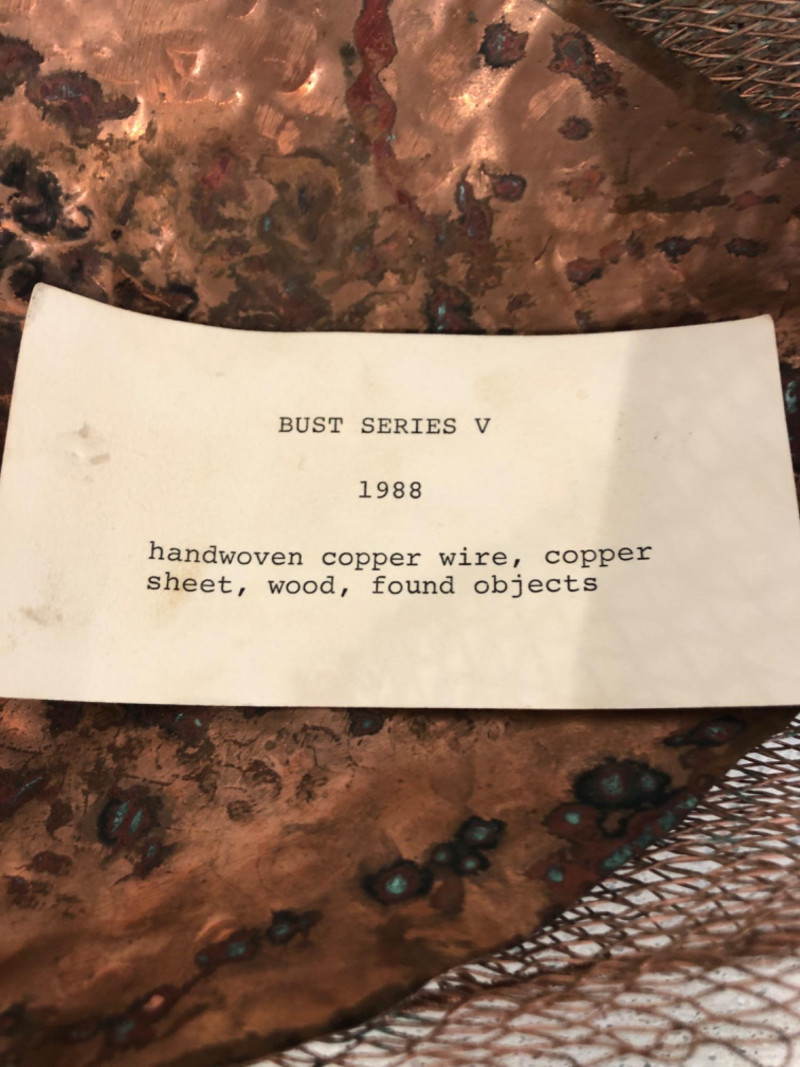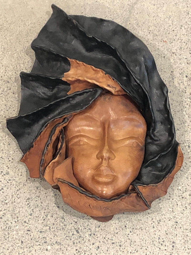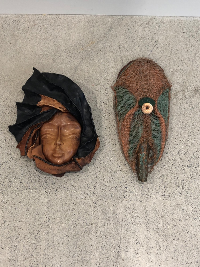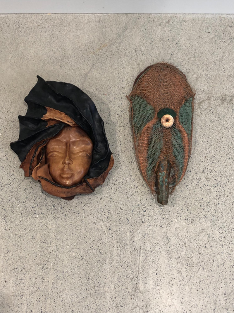 Lot includes two handcrafted wall-hanging pieces. One is a sculpted leather face mask with black and brown folds. The second is titled Bust Series V (1988), made from copper sheet, handwoven copper wire, wood, and found objects. Signed on back by artist. Sizes approx. 13" x 9" and 15" x 7". Bold, mixed-media art for display.