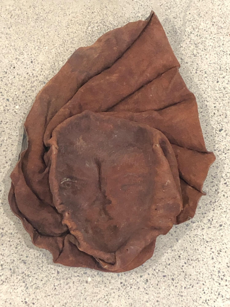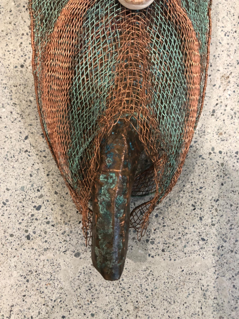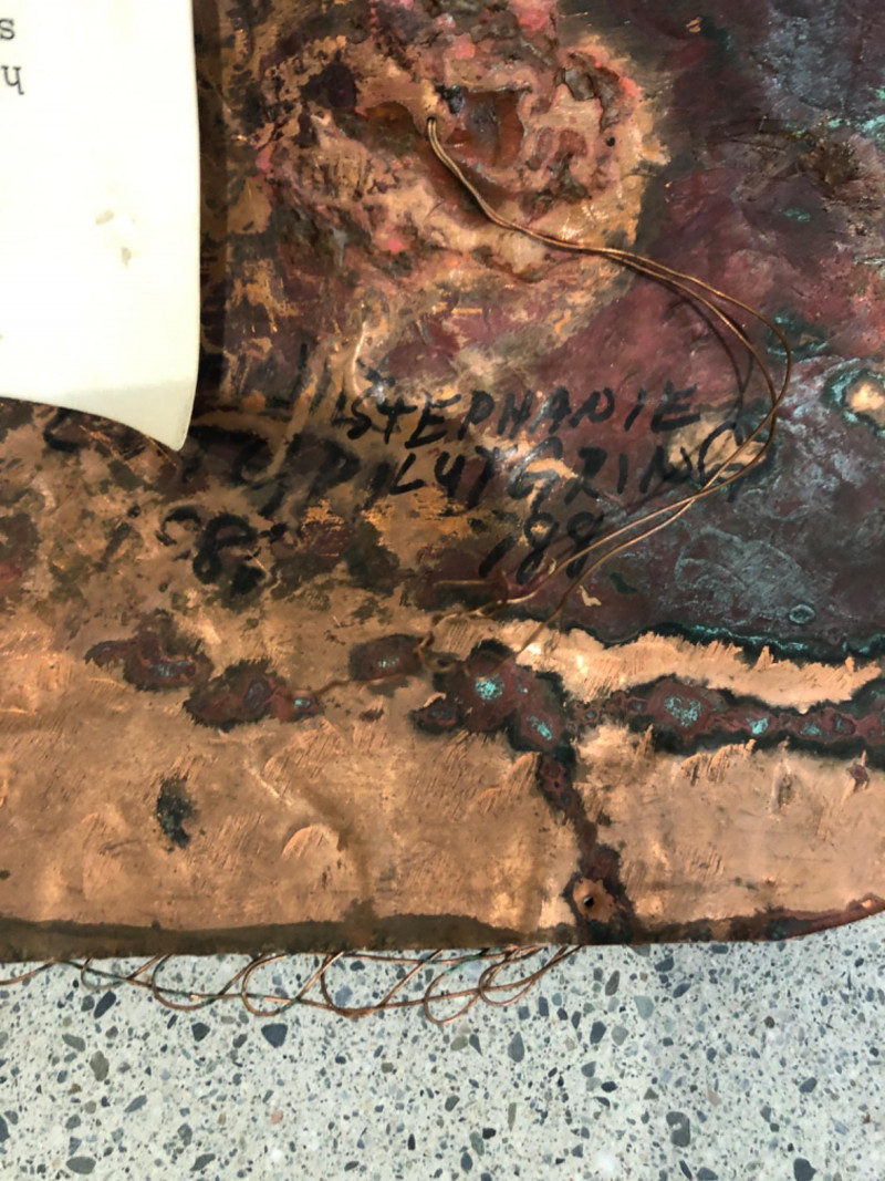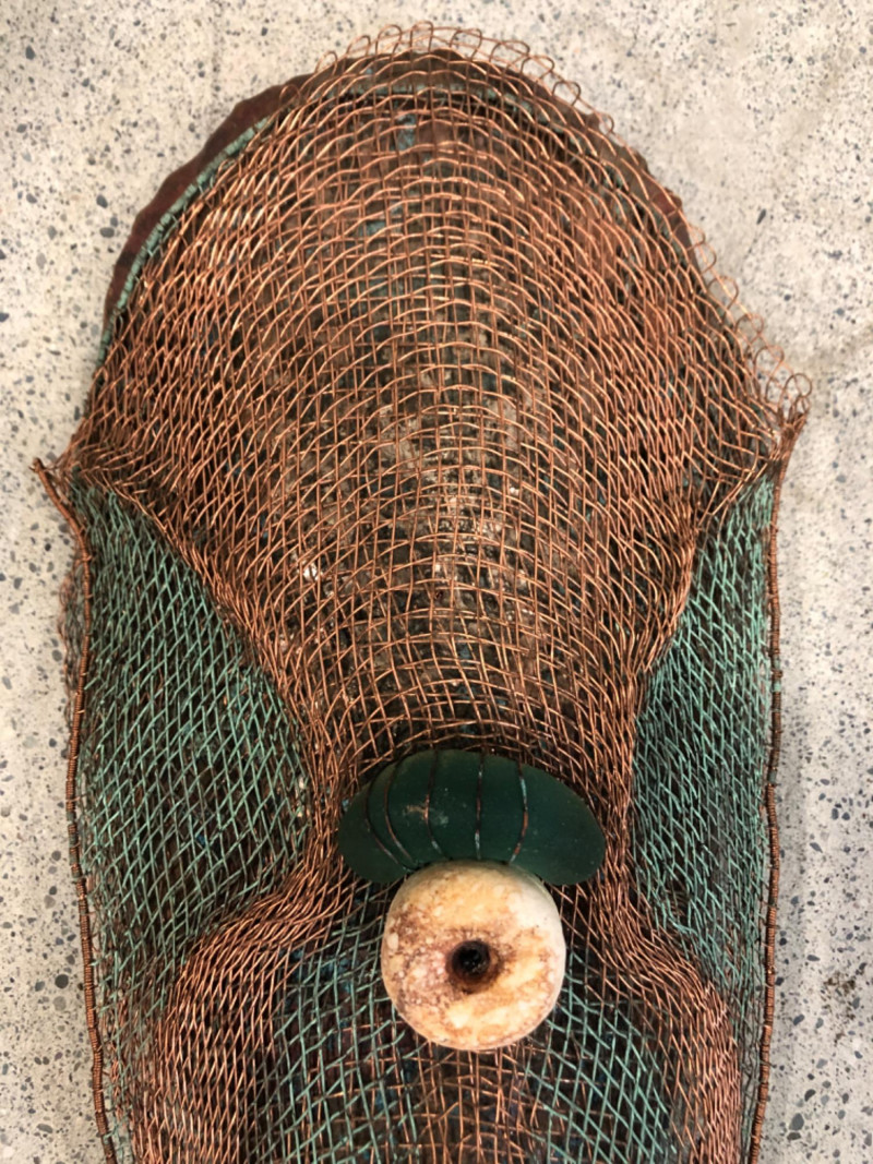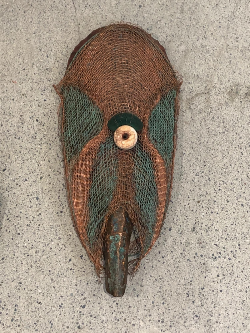 Lot includes two handcrafted wall-hanging pieces. One is a sculpted leather face mask with black and brown folds. The second is titled Bust Series V (1988), made from copper sheet, handwoven copper wire, wood, and found objects. Signed on back by artist. Sizes approx. 13" x 9" and 15" x 7". Bold, mixed-media art for display.