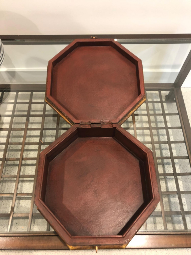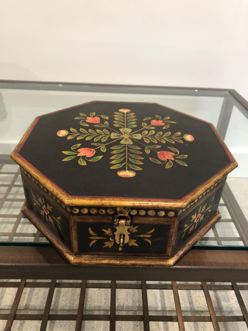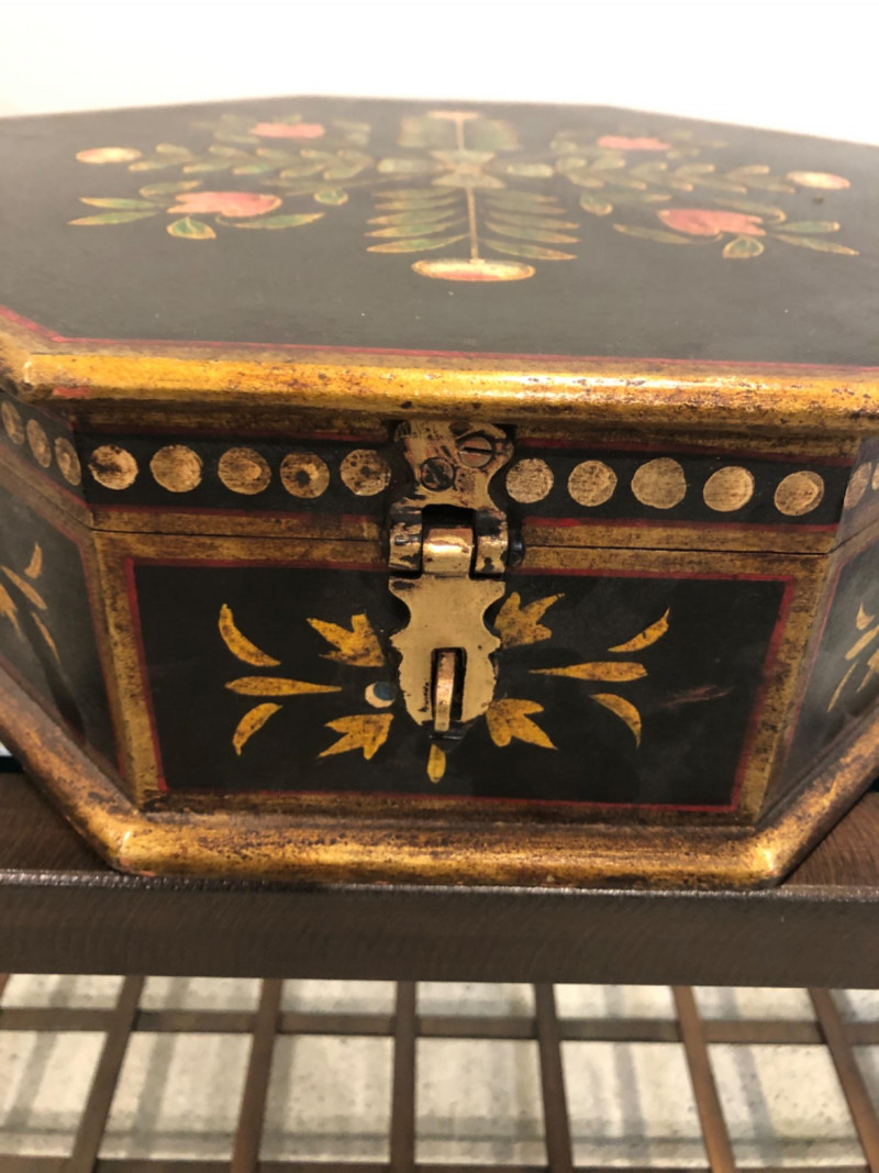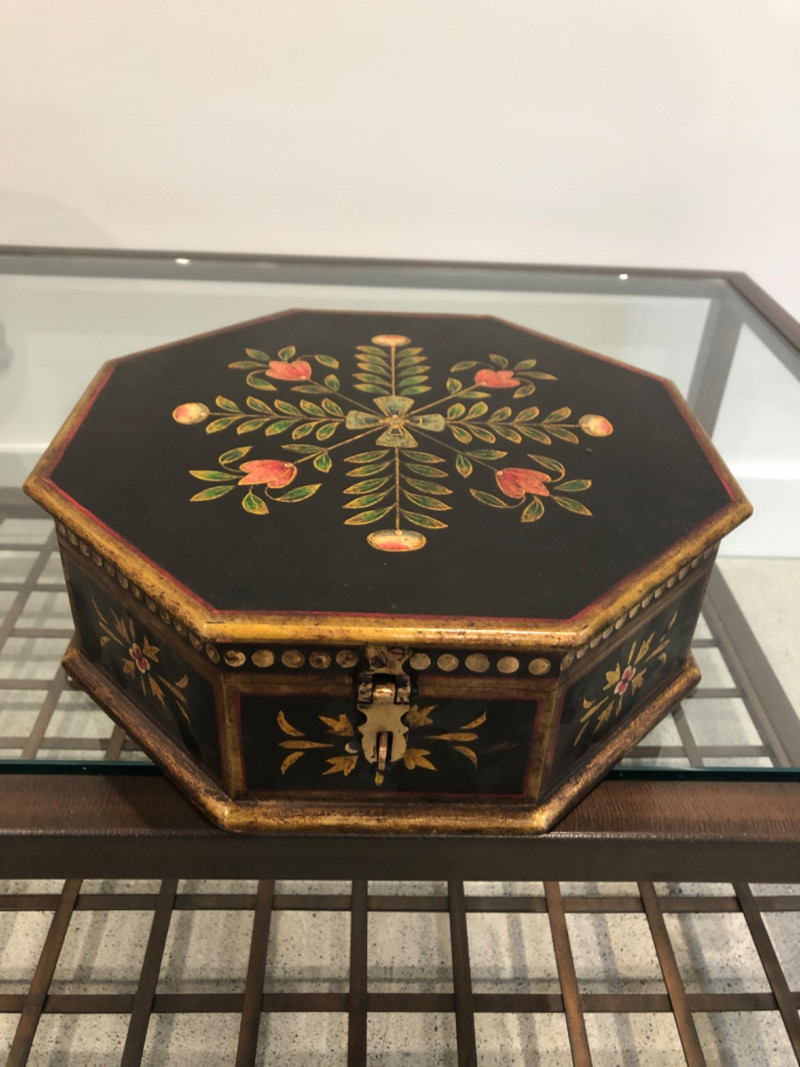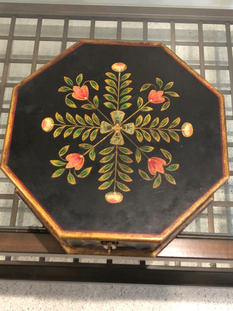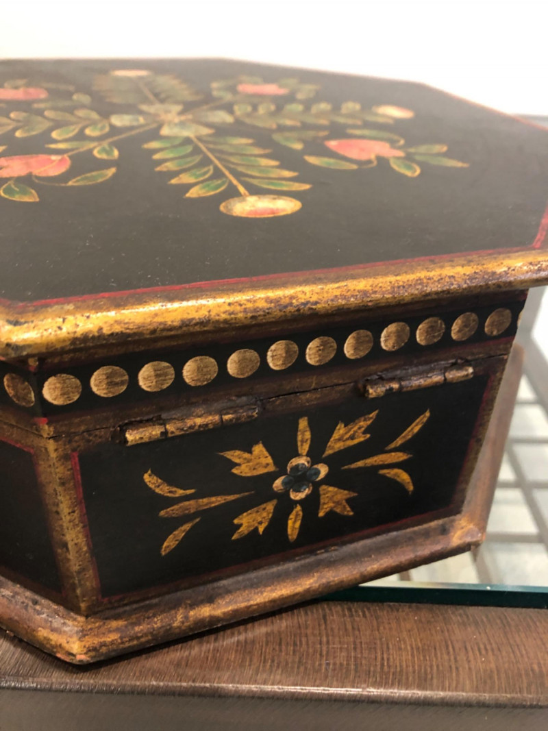 Octagonal wooden box with hinged lid and clasp, featuring hand-painted floral folk art designs on all sides. Black background with red and gold accents, lightly distressed for a vintage look. Interior is stained wood with a smooth finish—great for keepsakes or display.