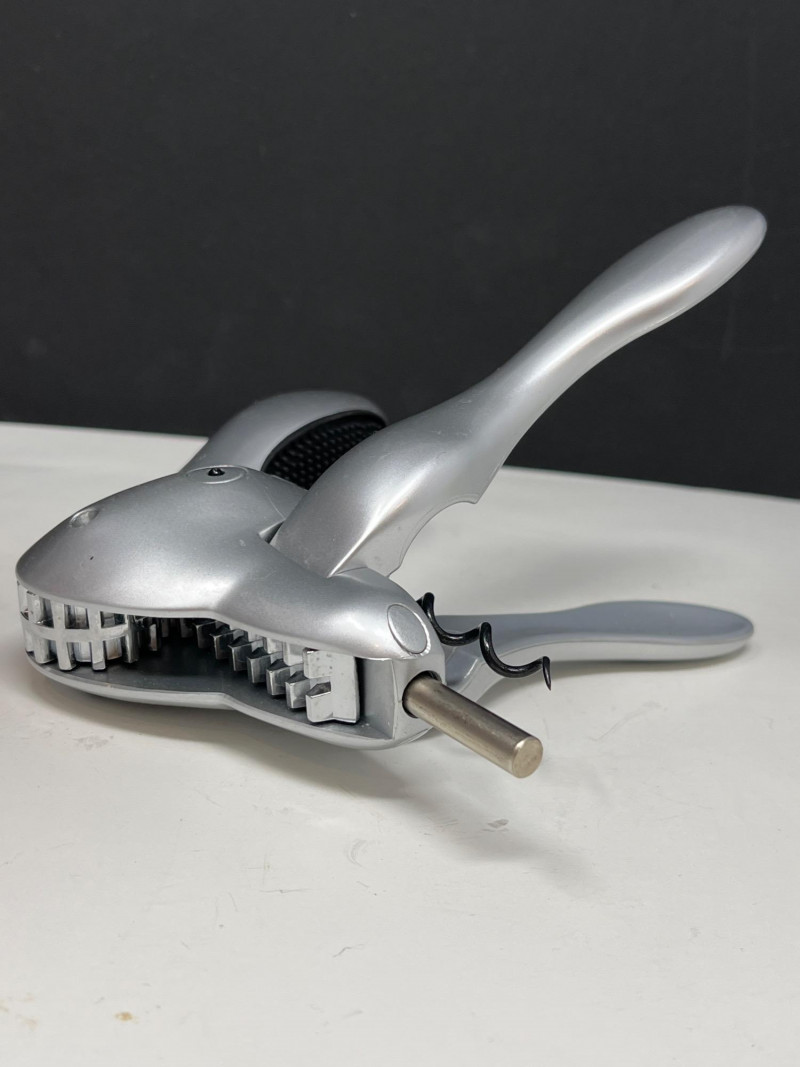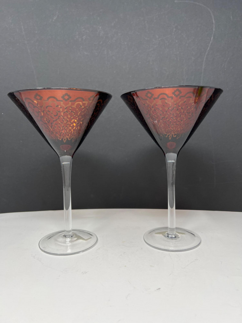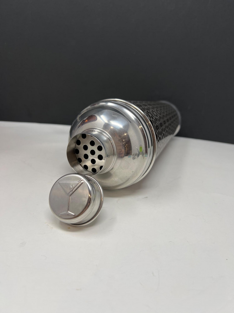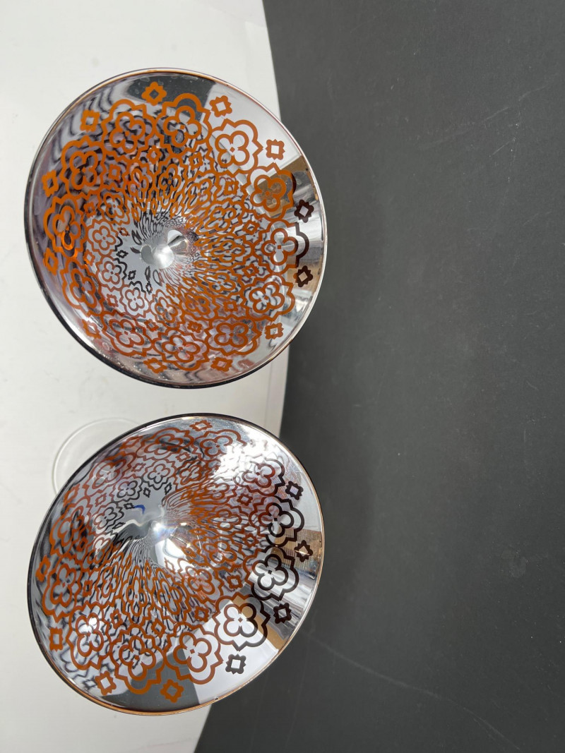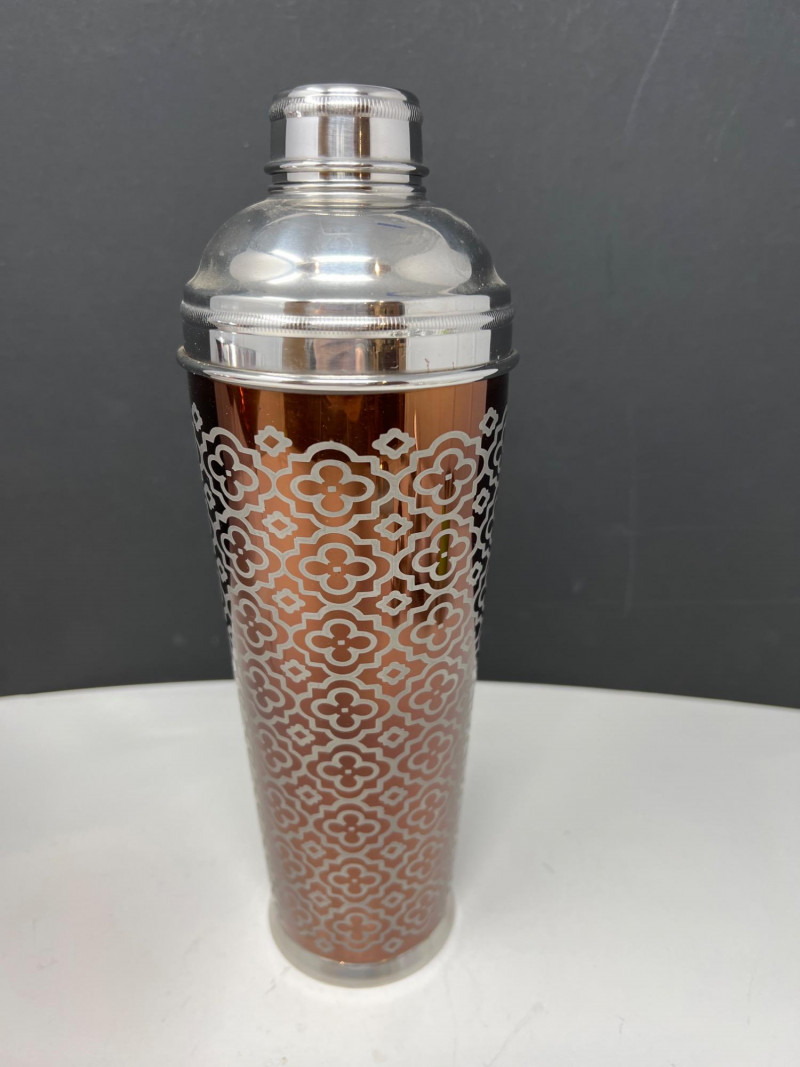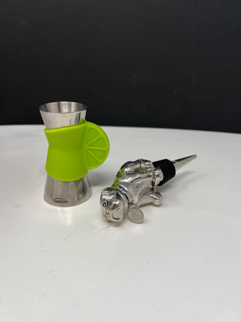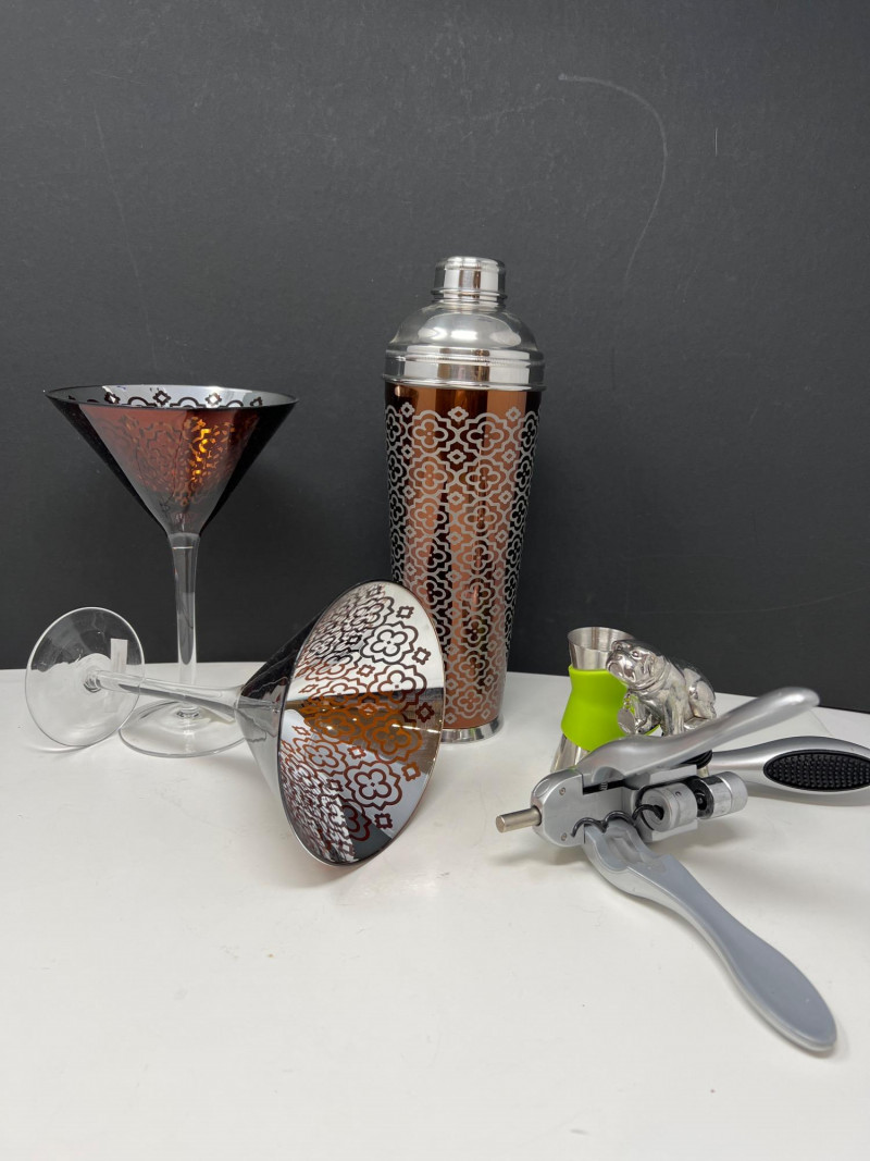 Barware bundle includes a Slant copper and silver-tone cocktail shaker with two matching martini glasses featuring metallic floral motifs. Also includes a Metrokane rabbit-style corkscrew, Trudeau stainless jigger with silicone grip, and a novelty bulldog bottle stopper. Eye-catching set for your home bar or entertaining setup.