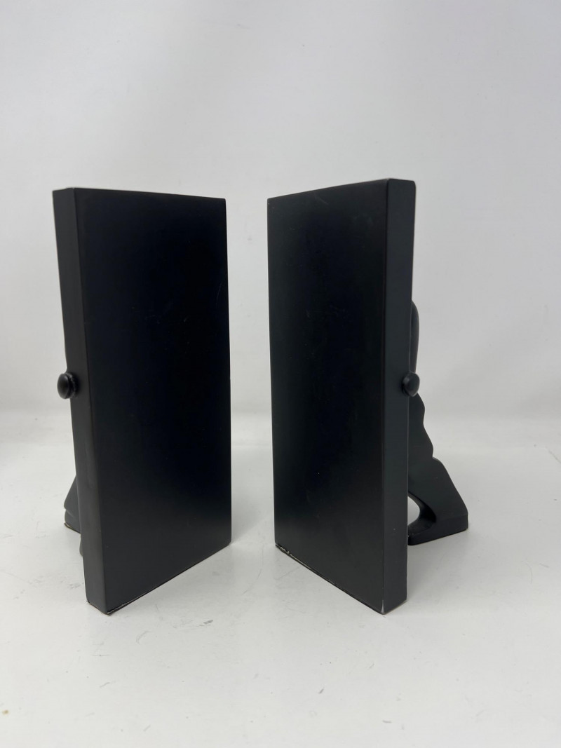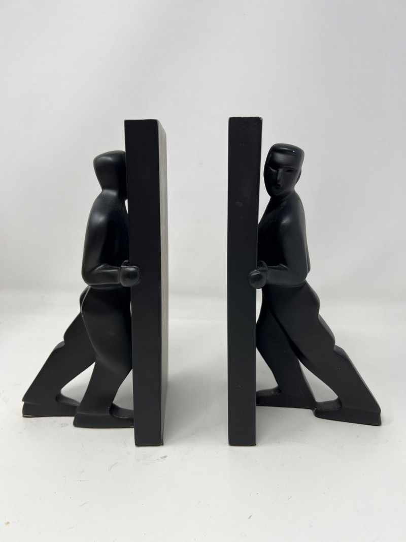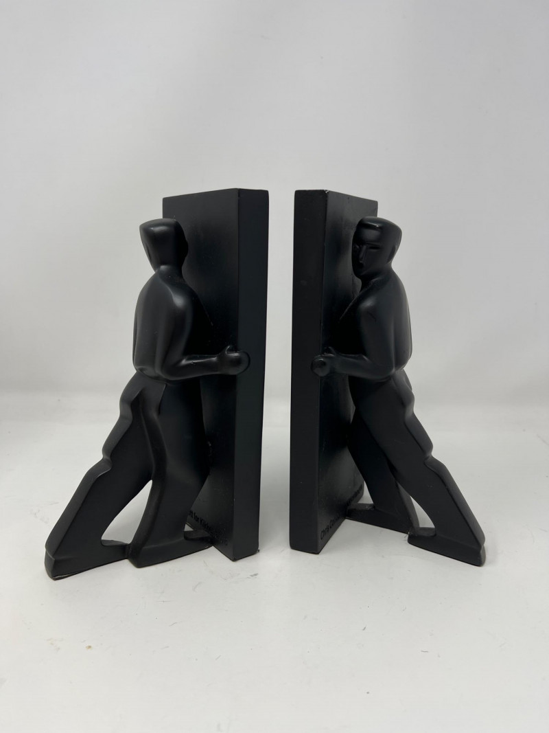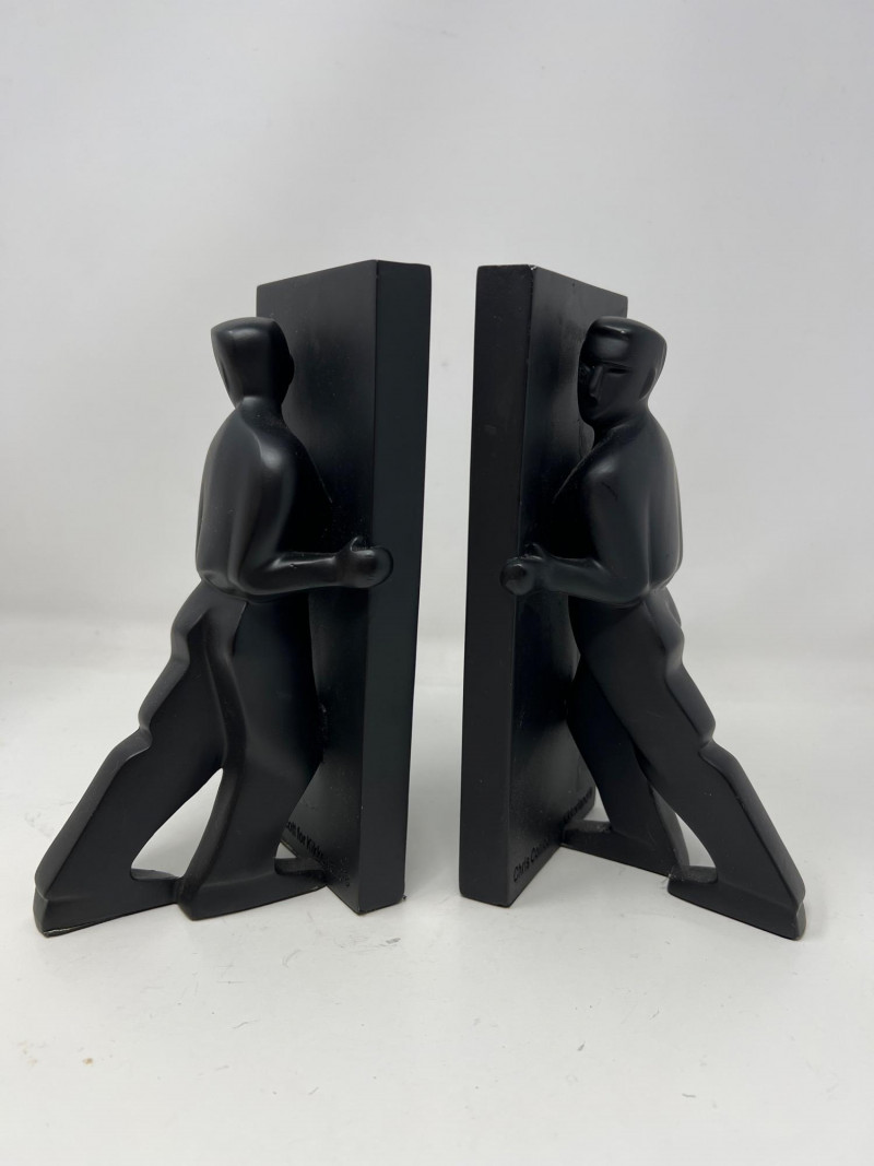 Iconic pair of “Leaning Man” bookends designed by Chris Collicott for Kikkerland. Crafted in matte black resin, each figure appears to brace against the weight of your books, combining functional support with sculptural flair. Inspired by the Art Deco forms of New York’s Rockefeller Center, these bookends reflect architectural strength and playful modernism. A standout addition to any shelf, office, or library.