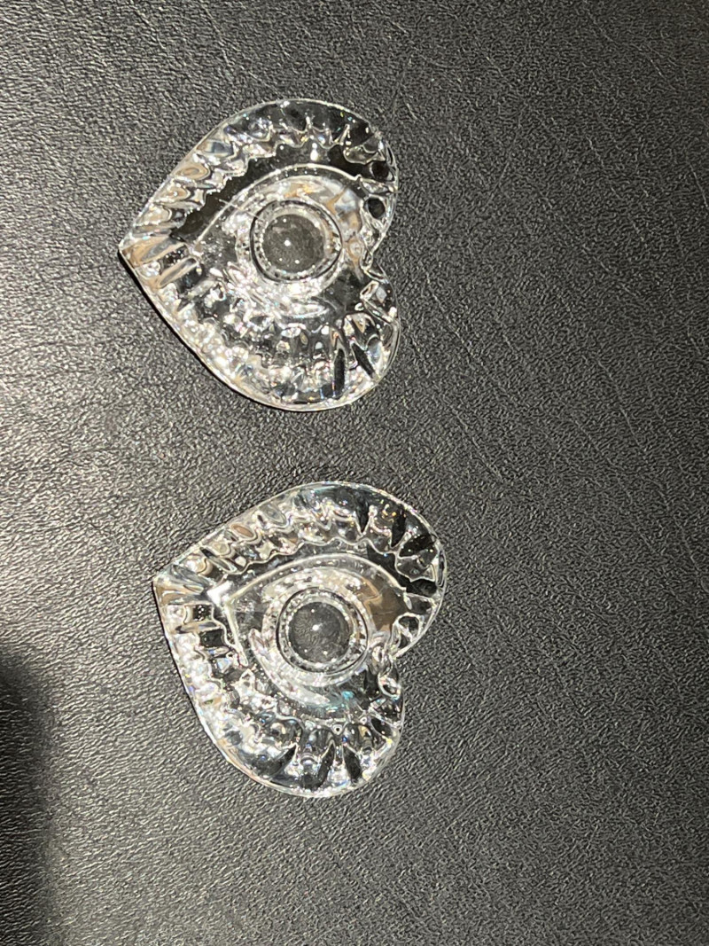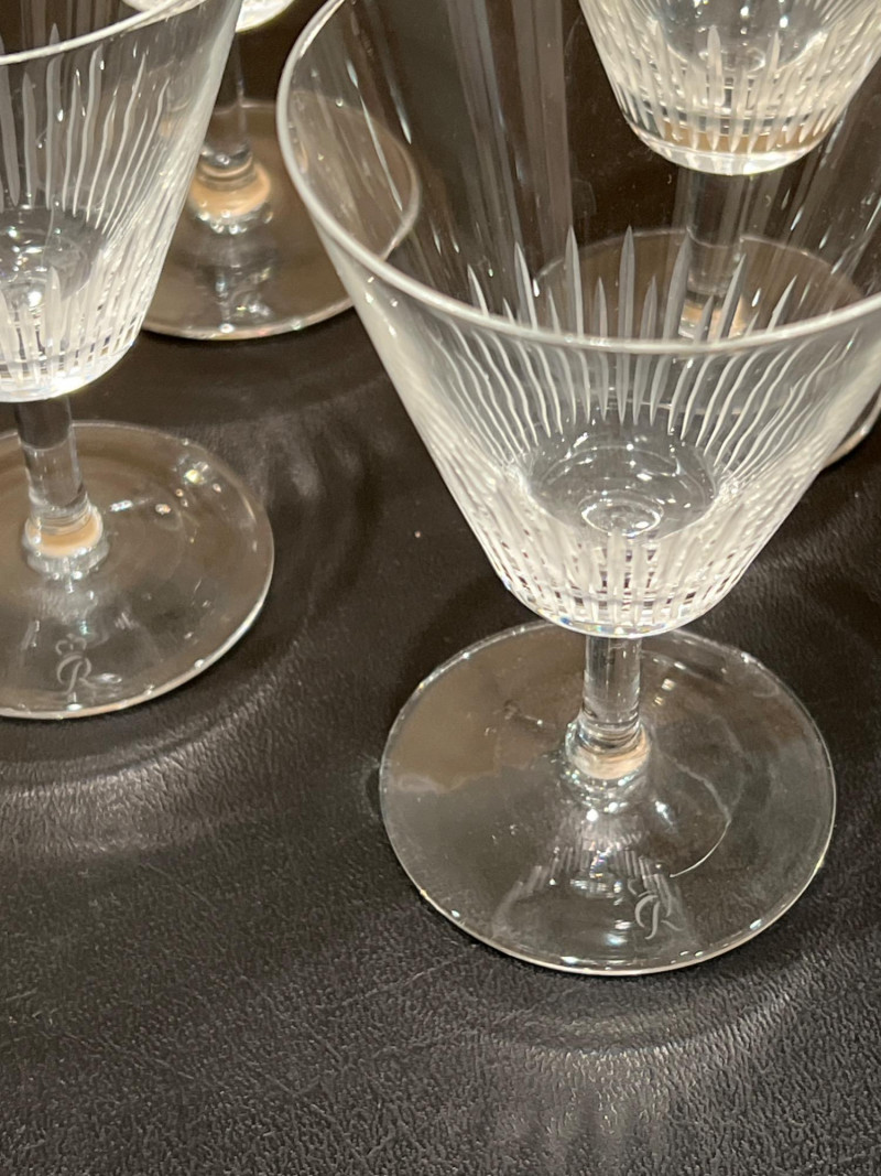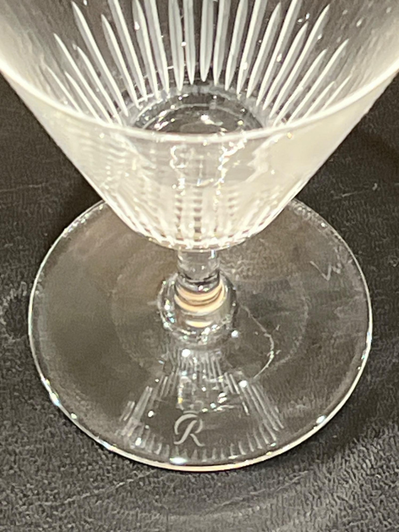 A refined pairing of four mid century modern Rosenthal crystal drinking glasses, each featuring a softly ribbed design that elegantly refracts light. Each glass has the "R" signature etched in the base. Accompanying the set are two heart-shaped crystal candle holders, faceted to enhance their luminous appeal. A beautiful blend of function and sentiment, ideal for romantic occasions, vintage-inspired table settings, or display in a curated crystal collection. Due to Fragility: This Item Is Not Eligible for Shipping. Available for Local Pickup Only. Measurements: Heart - 1.5" x 1.5" Glasses measure:
