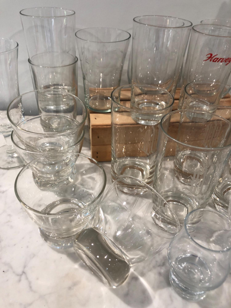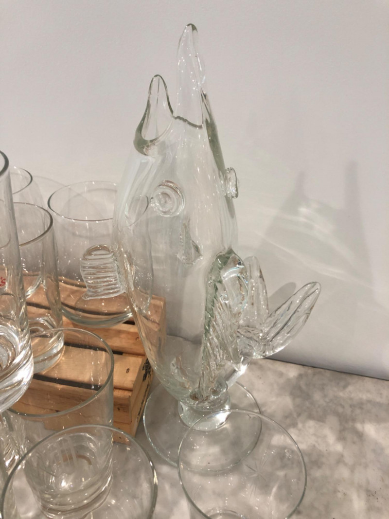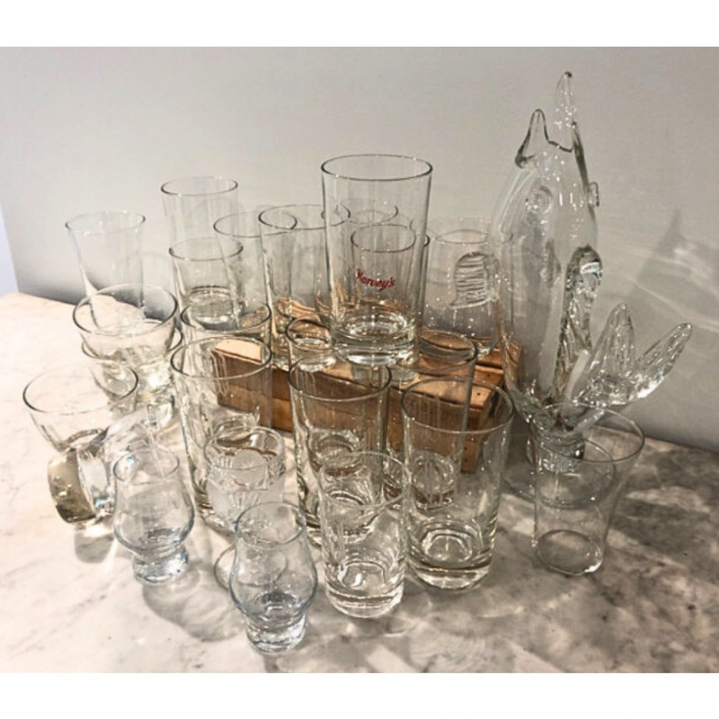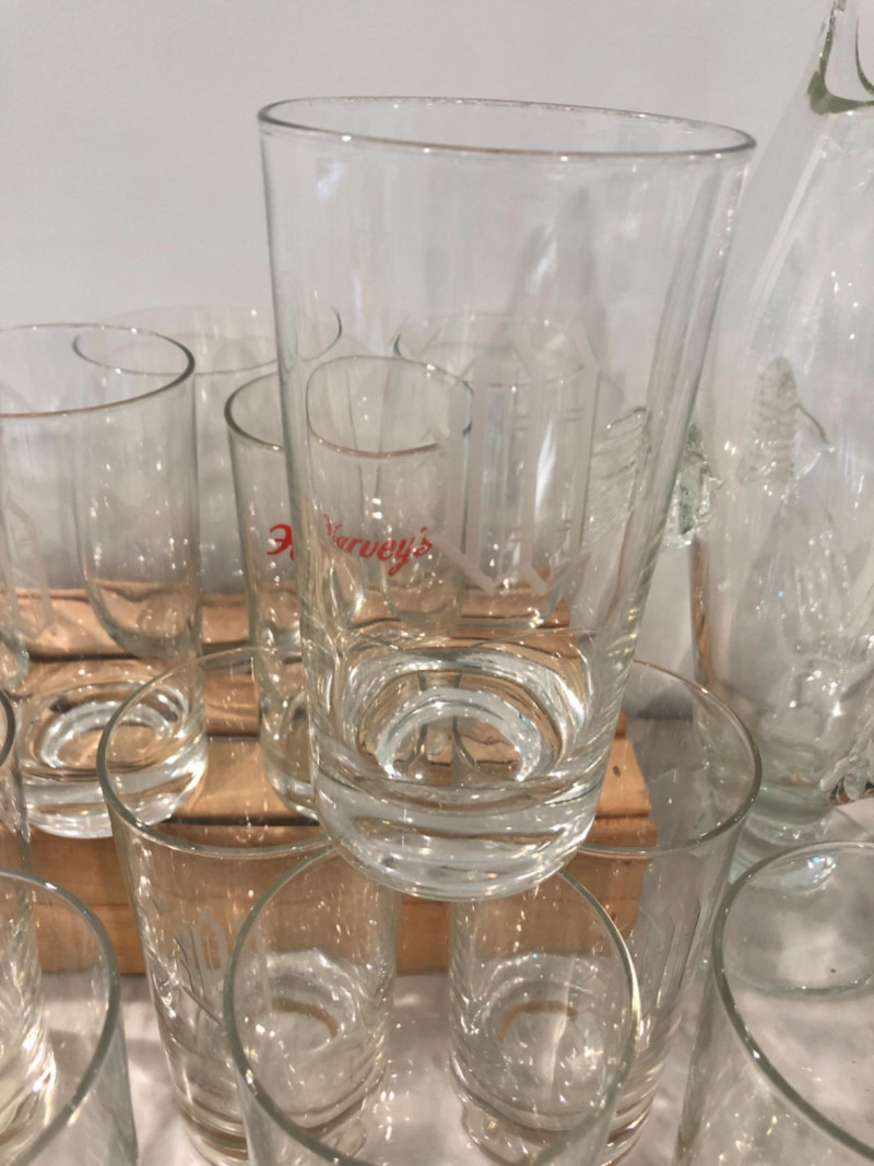 Diverse set of barware including etched glass tumblers, logo pint glasses (Harvey's), fine crystal stemware, and unique pieces like a "Fyne Malts of Inveraray" whisky glass and a blown glass fish decanter. Over 20 pieces in various shapes and sizes—perfect for adding character to your home bar or collection. Some vintage and collectible designs included. Due to Bulk Size/Fragility: This Item Is Not Eligible for Shipping. Available for Local Pickup Only.