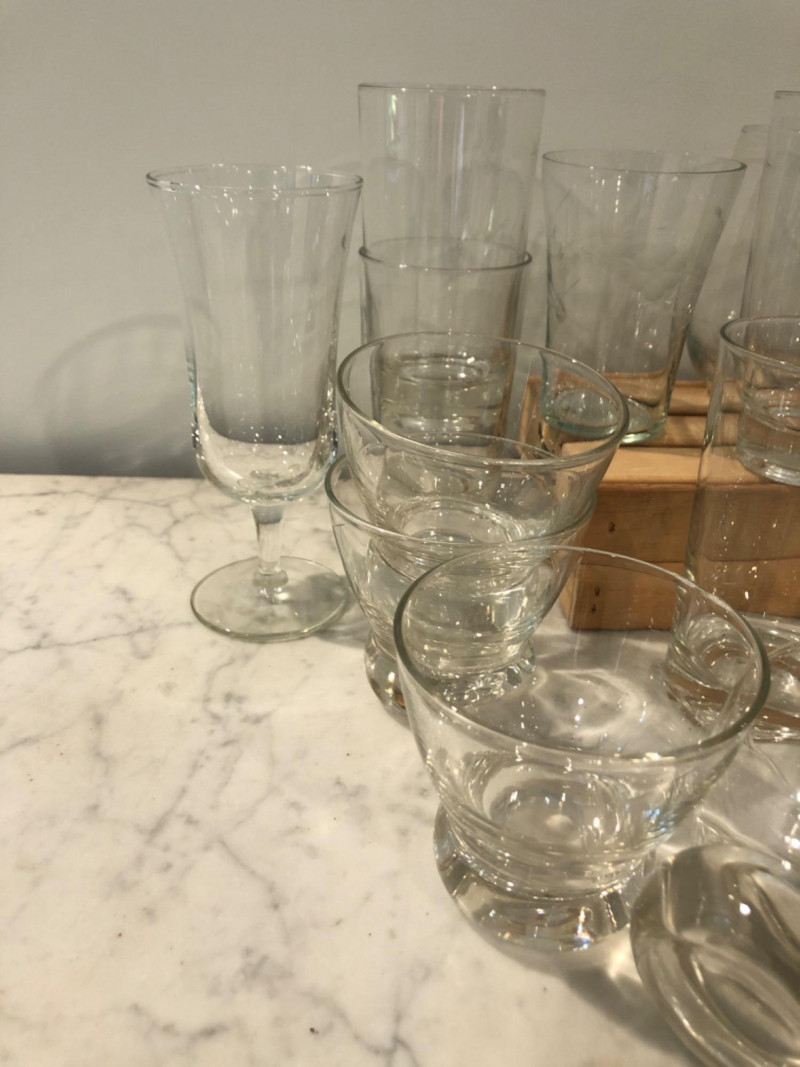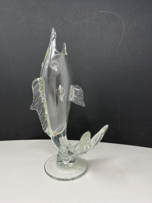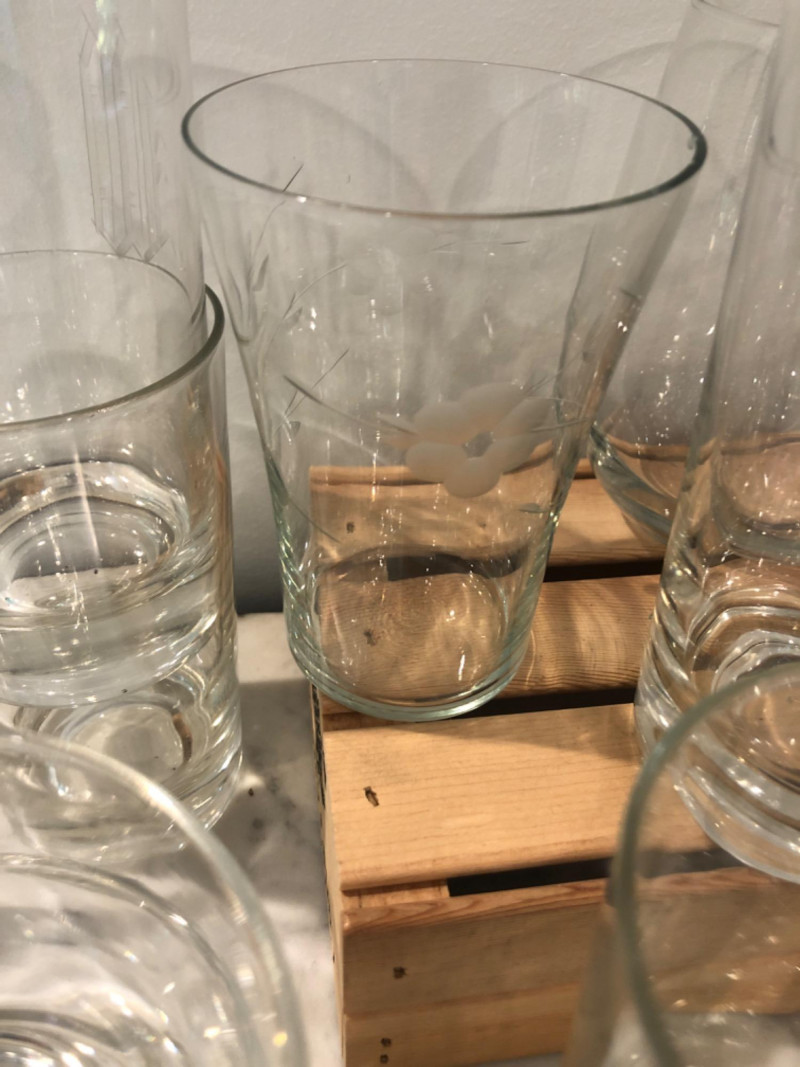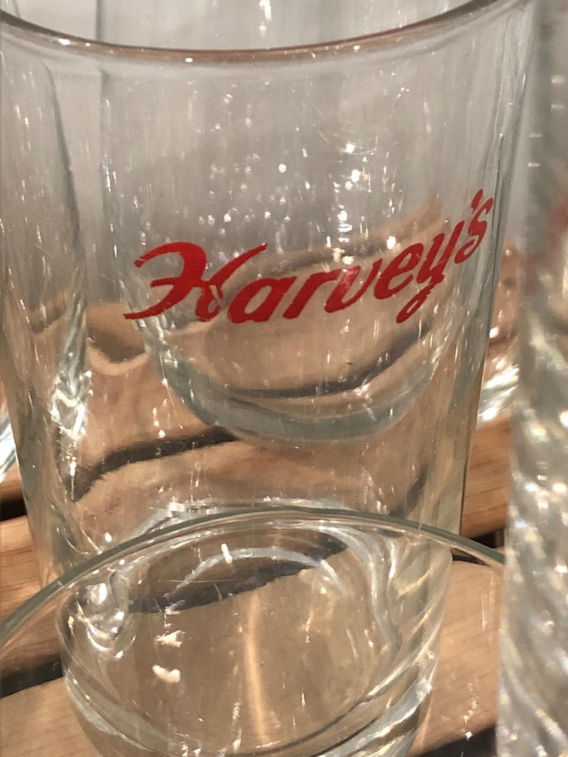 Diverse set of barware including etched glass tumblers, logo pint glasses (Harvey's), fine crystal stemware, and unique pieces like a "Fyne Malts of Inveraray" whisky glass and a blown glass fish decanter. Over 20 pieces in various shapes and sizes—perfect for adding character to your home bar or collection. Some vintage and collectible designs included. Due to Bulk Size/Fragility: This Item Is Not Eligible for Shipping. Available for Local Pickup Only.