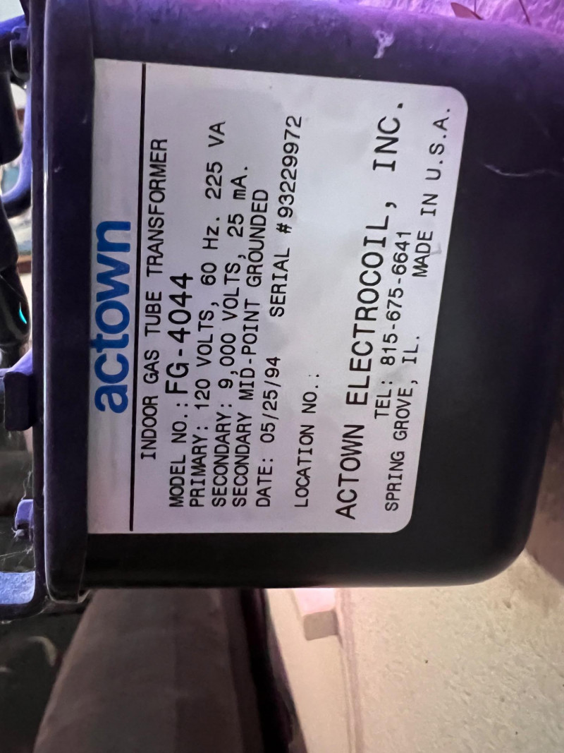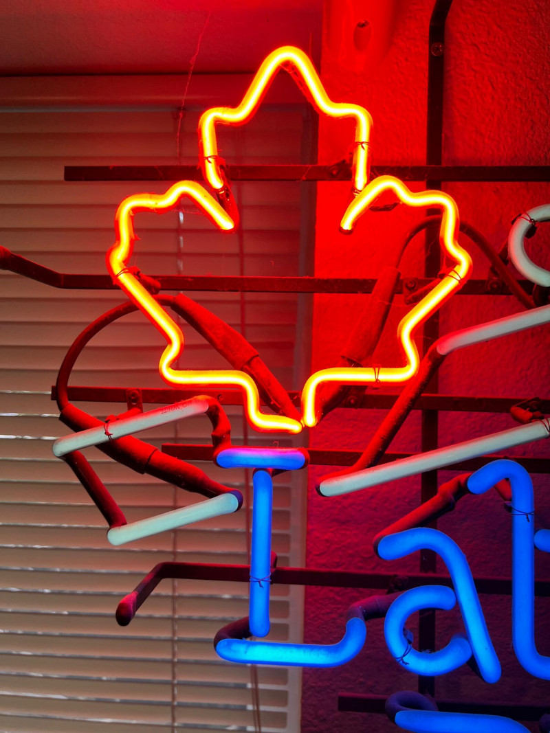 Labatt’s Blue Neon Sign – 25" W x 26" H Neon sign featuring the Labatt’s Blue logo in blue tubing, with the words "ON TAP" displayed above in white tubes on diagonal lines, and a red maple leaf forming the background. The sign is mounted on a black metal frame and powered by an Actown transformer. Dimensions: 25" W x 26" H