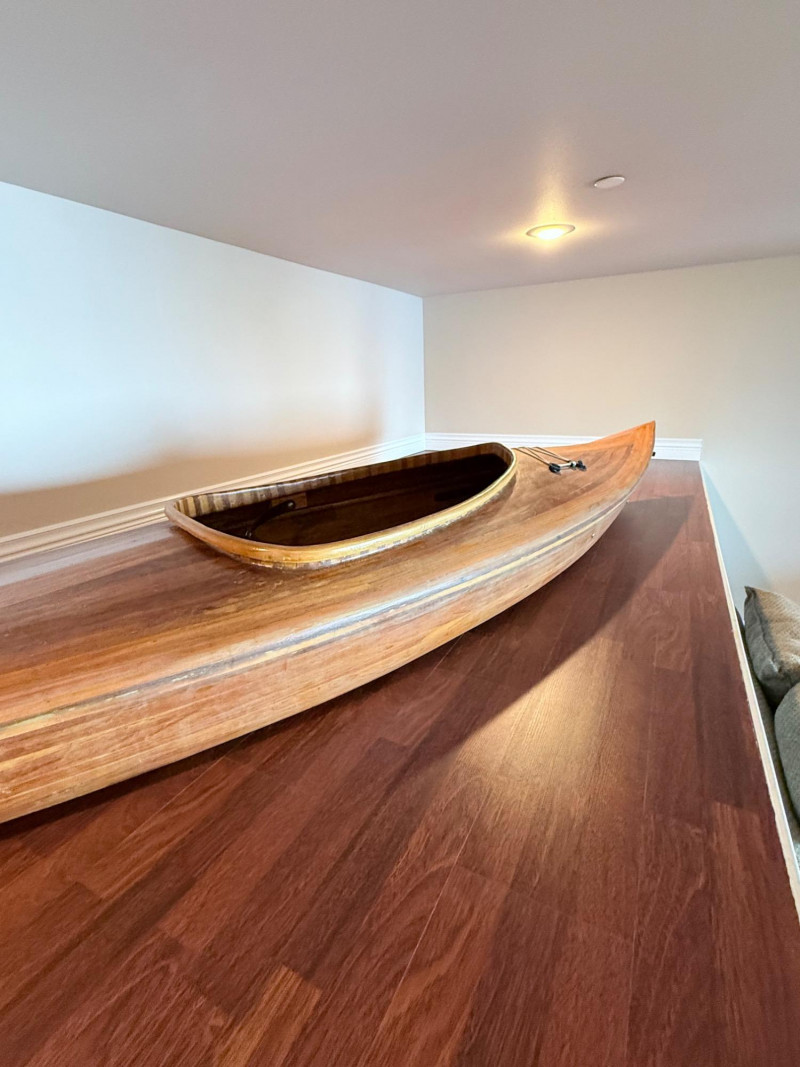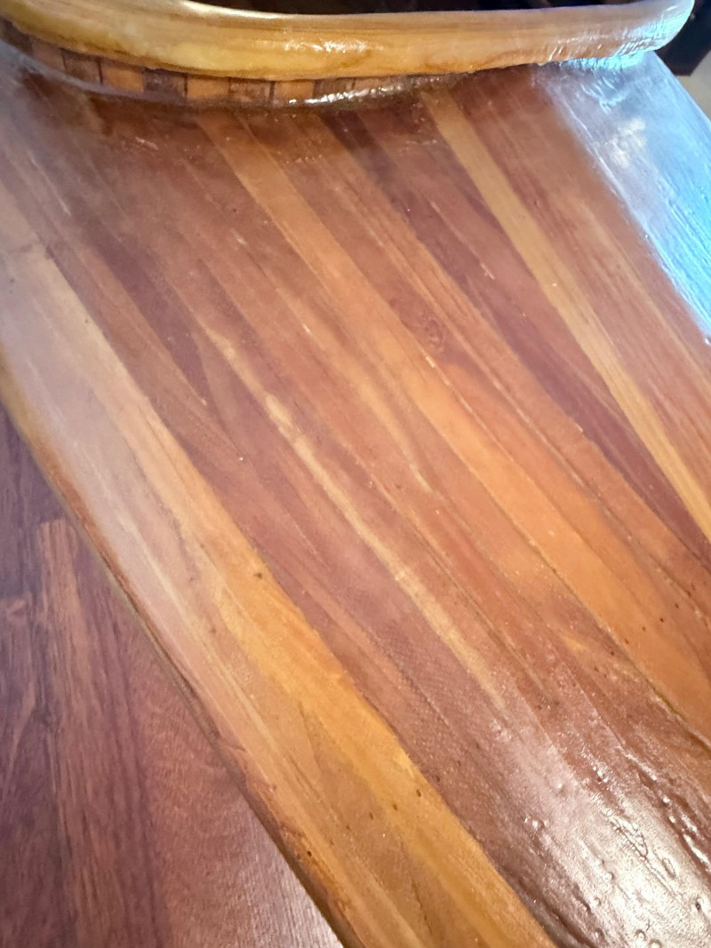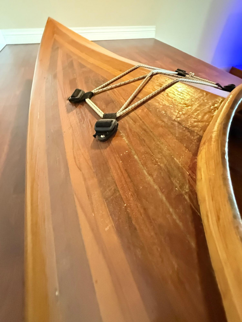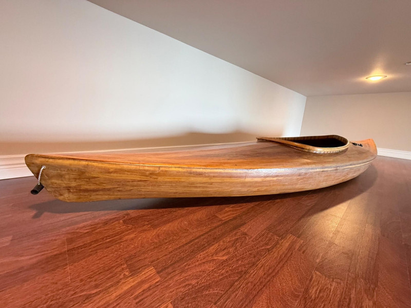A stunning handcrafted wooden kayak made by Nor’West Passage (Wooden Boats) of Tacoma, Washington, led by craftsman Ernie Stephenson. This locally built, artisan-quality kayak measures 11 feet long, 28 inches wide, and 13 inches high, showcasing the timeless beauty and precision of traditional strip-built construction.