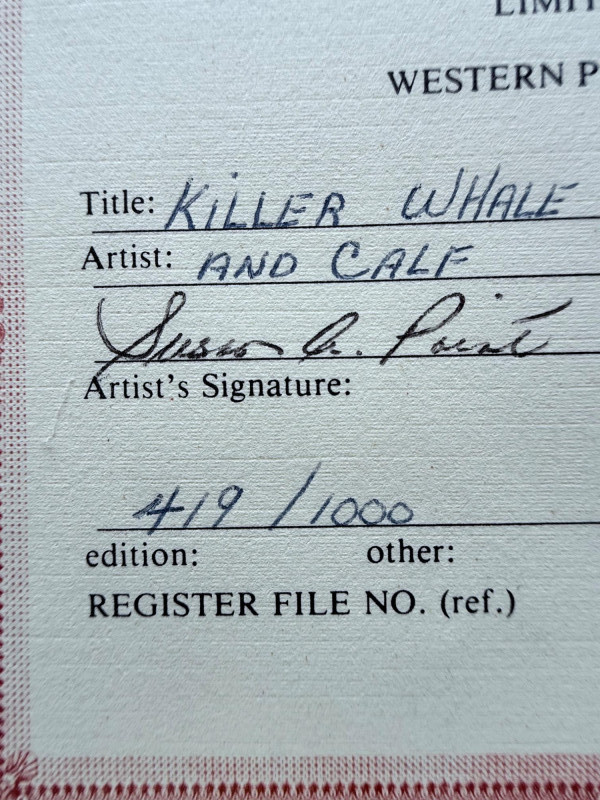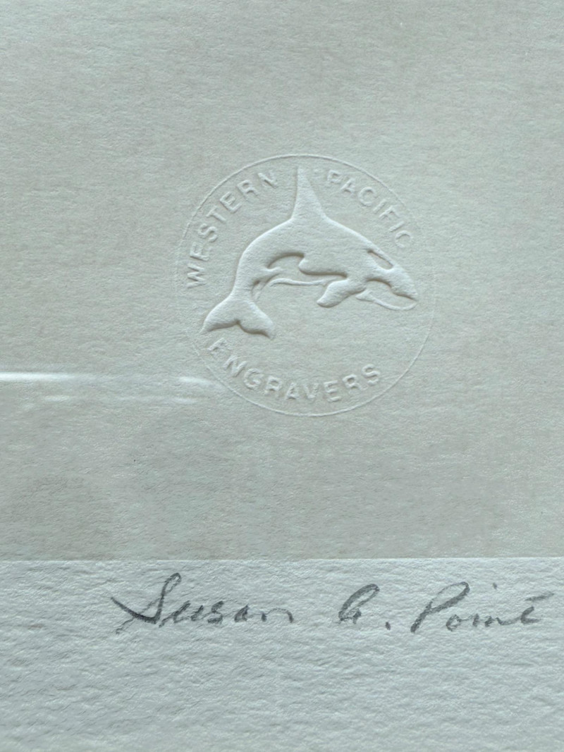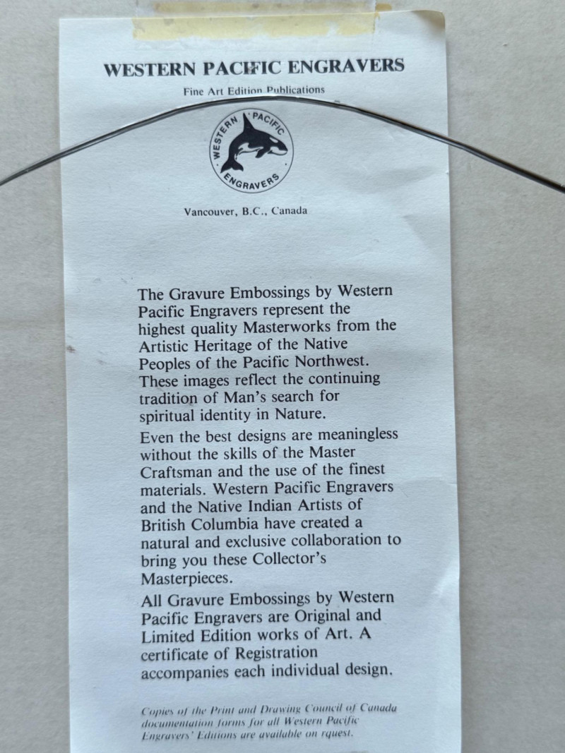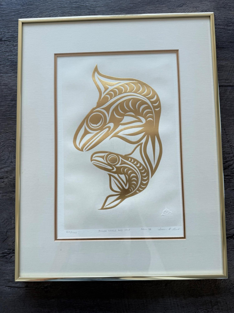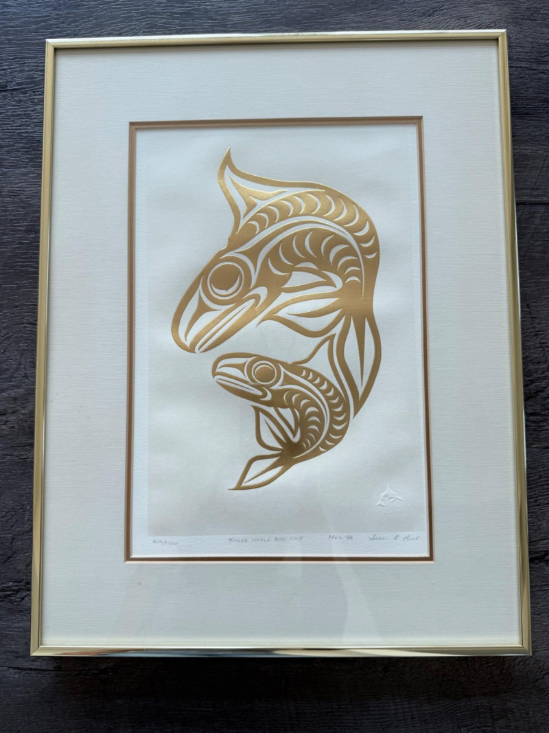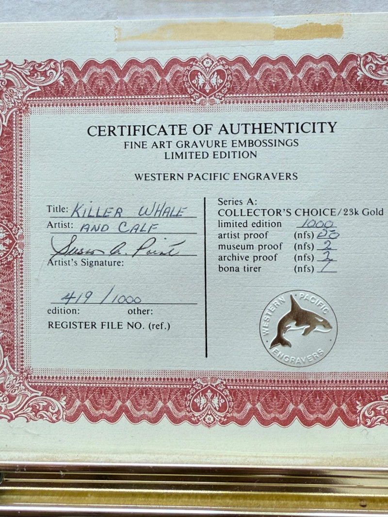 “Killer Whale and Calf” 23k Gold Gravure Embossing by Susan Point Limited edition gravure embossing titled Killer Whale and Calf, created by Susan A. Point and numbered 419/1000. The design is rendered in 23k gold and published by Western Pacific Engravers in Vancouver, Canada. The composition features two stylized marine figures in a Pacific Northwest Coast formline style, produced in collaboration with Native artists of British Columbia. The work includes the artist’s signature and embossed seal from the publisher. Presented in a 13 x 17 inch metal frame with mat. Includes original Certificate of Authenticity. Dimensions (approx.):