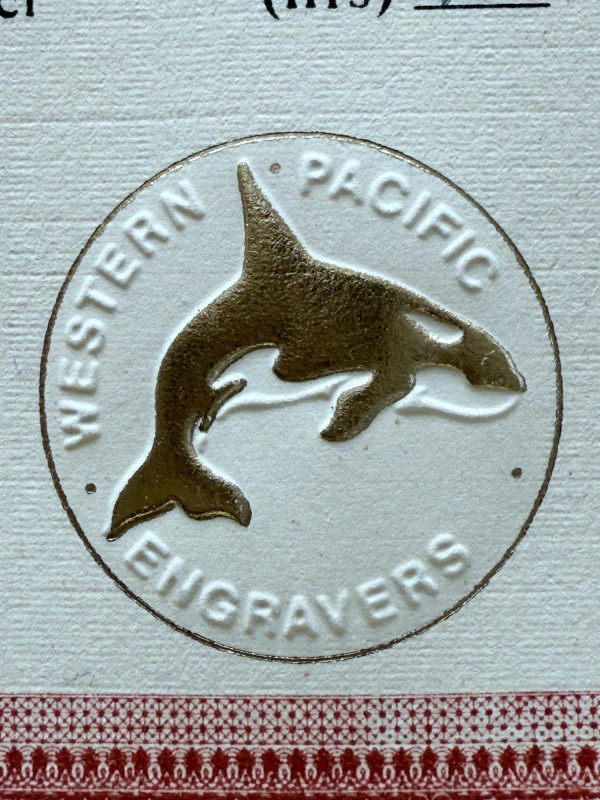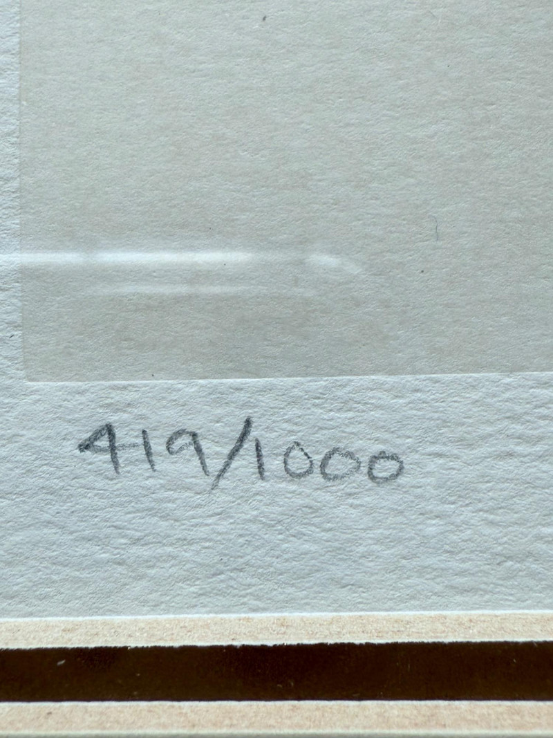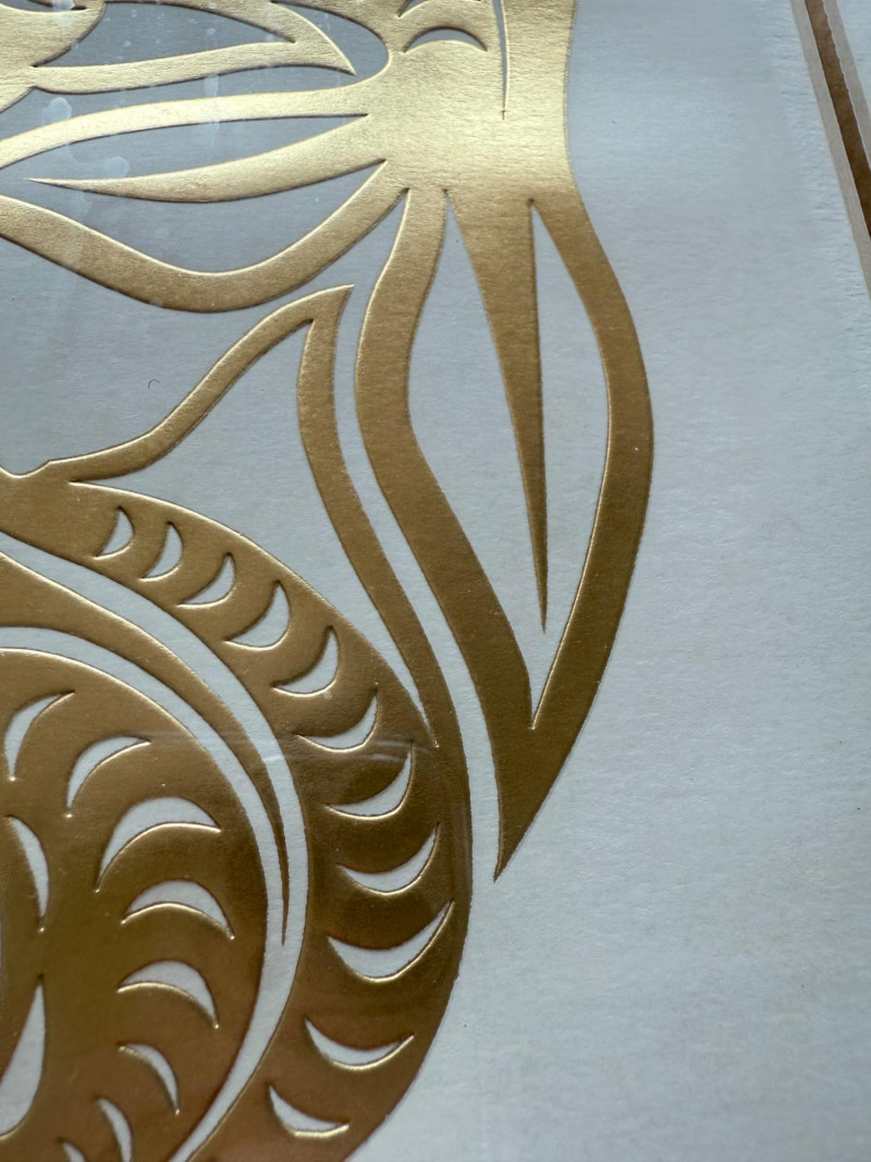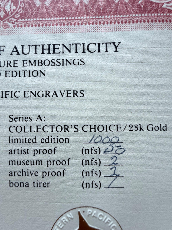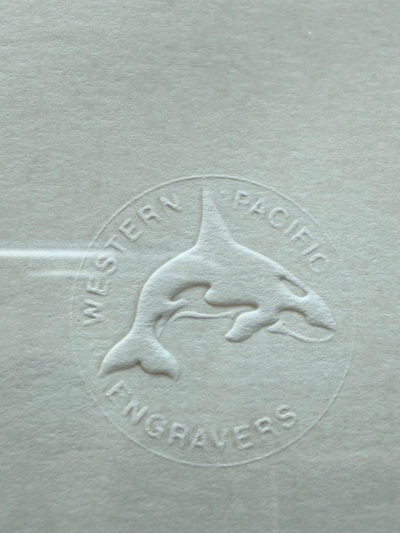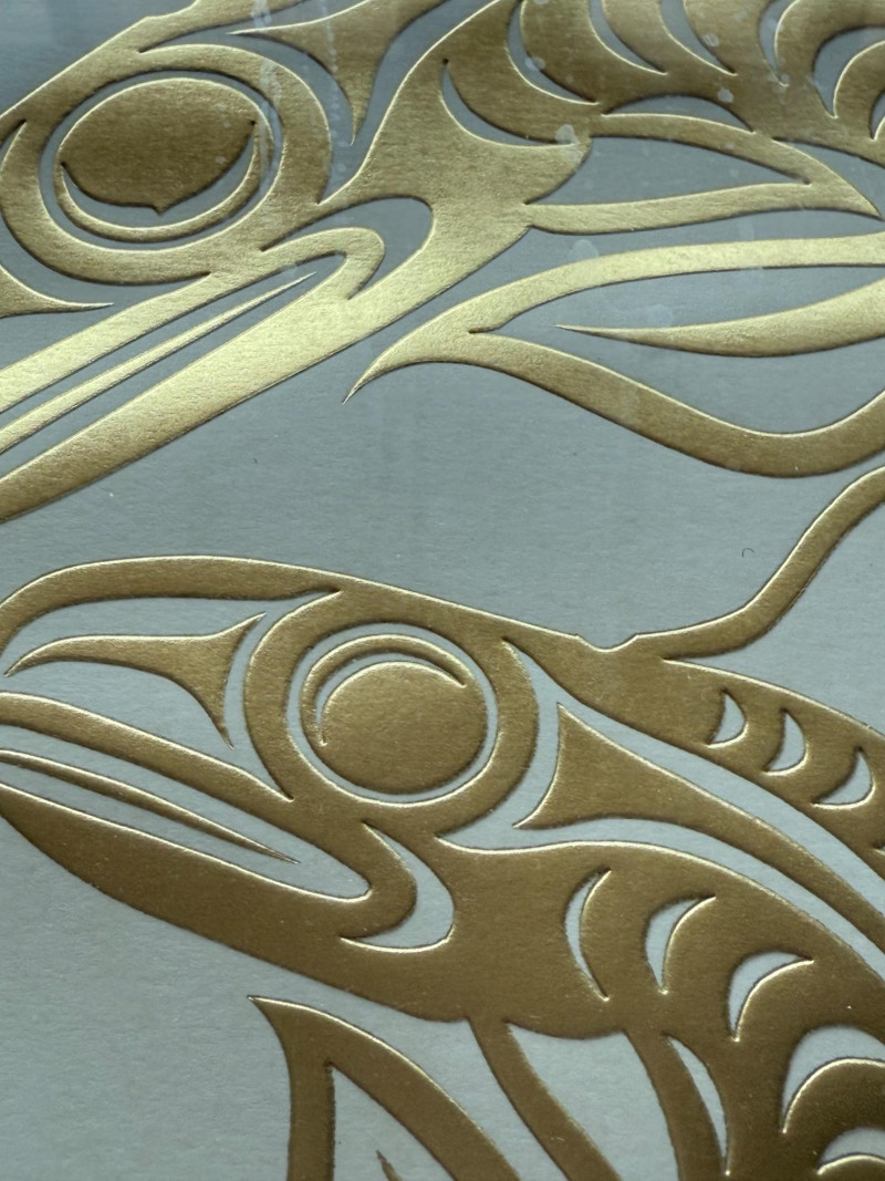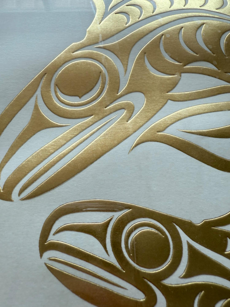 “Killer Whale and Calf” 23k Gold Gravure Embossing by Susan Point Limited edition gravure embossing titled Killer Whale and Calf, created by Susan A. Point and numbered 419/1000. The design is rendered in 23k gold and published by Western Pacific Engravers in Vancouver, Canada. The composition features two stylized marine figures in a Pacific Northwest Coast formline style, produced in collaboration with Native artists of British Columbia. The work includes the artist’s signature and embossed seal from the publisher. Presented in a 13 x 17 inch metal frame with mat. Includes original Certificate of Authenticity. Dimensions (approx.):