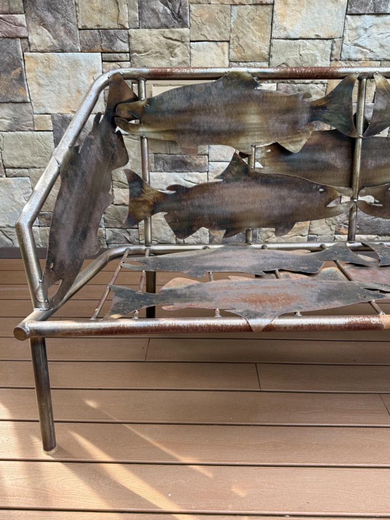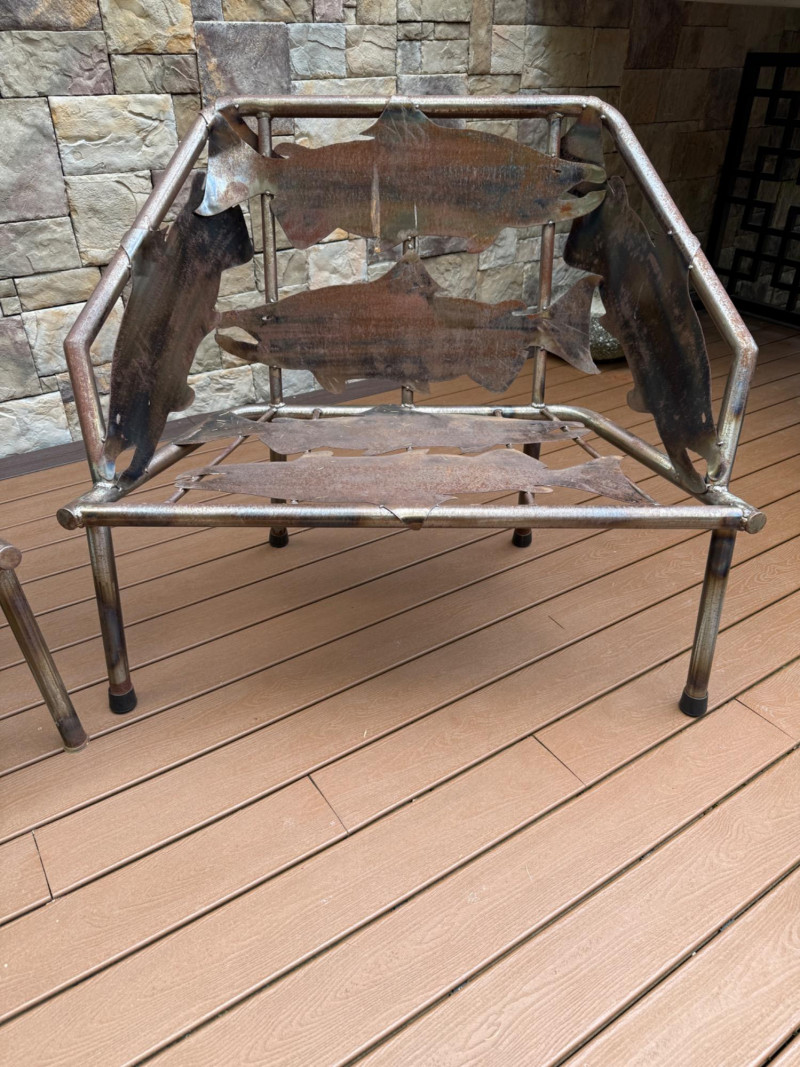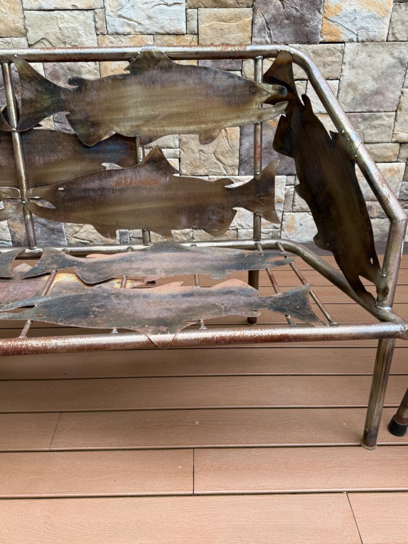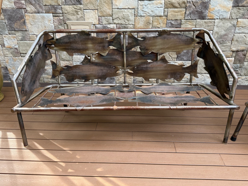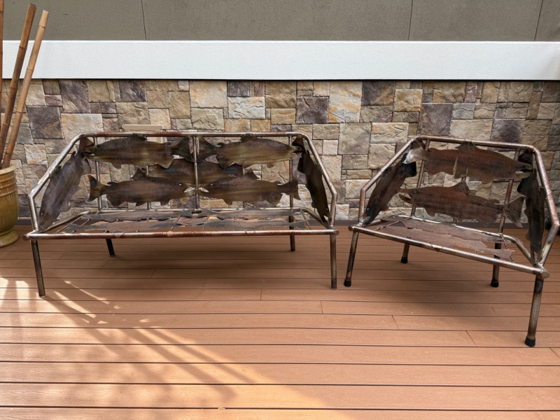 This striking handcrafted metal furniture set includes a large bench and a matching chair, both featuring intricate salmon cutout designs that celebrate Pacific Northwest artistry and craftsmanship.