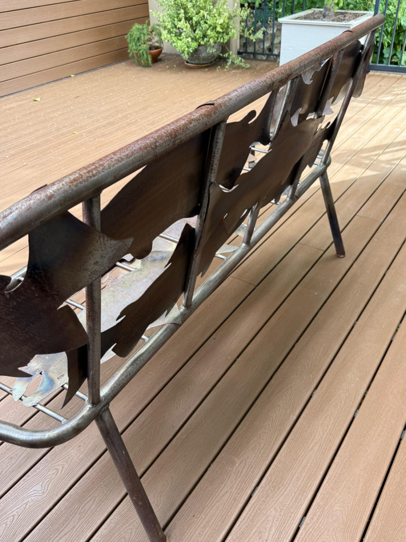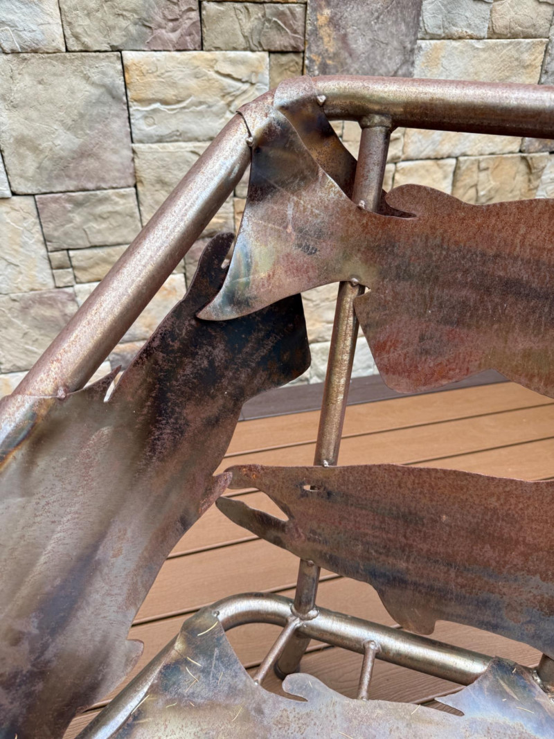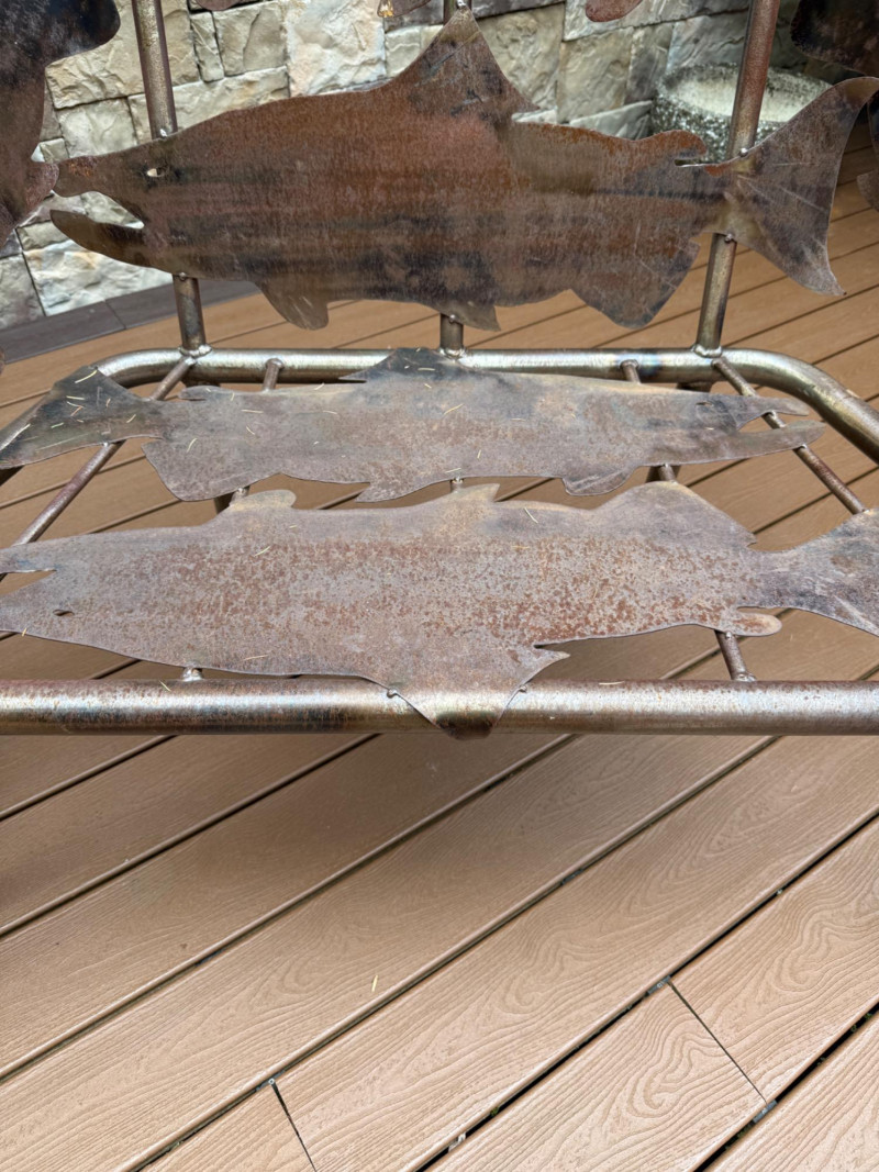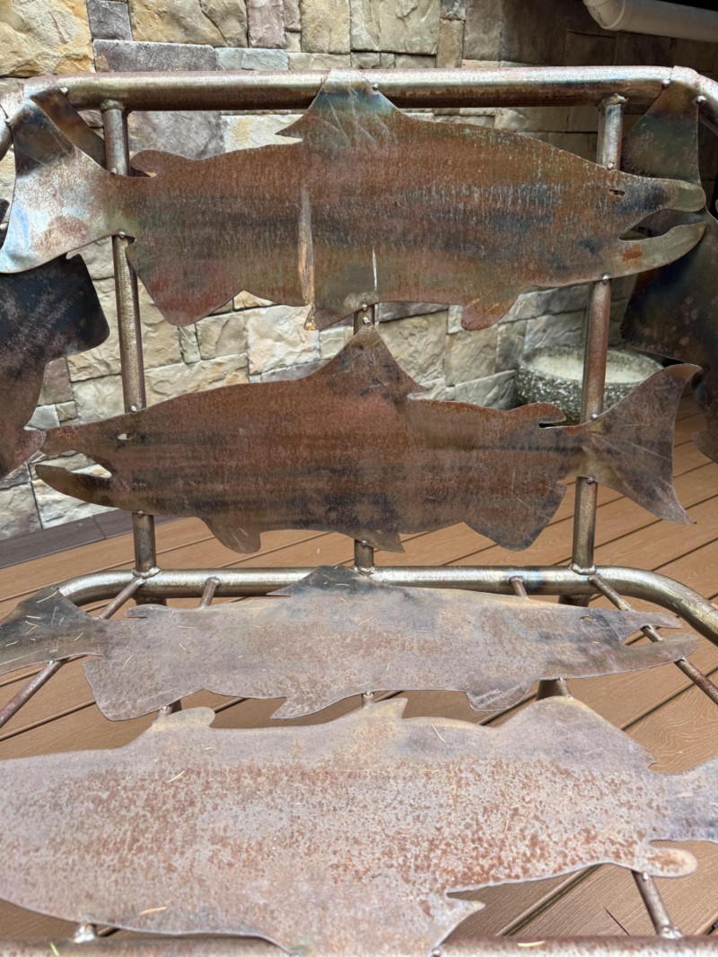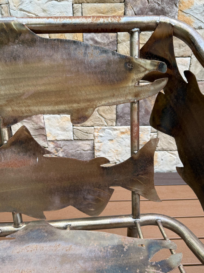 This striking handcrafted metal furniture set includes a large bench and a matching chair, both featuring intricate salmon cutout designs that celebrate Pacific Northwest artistry and craftsmanship.