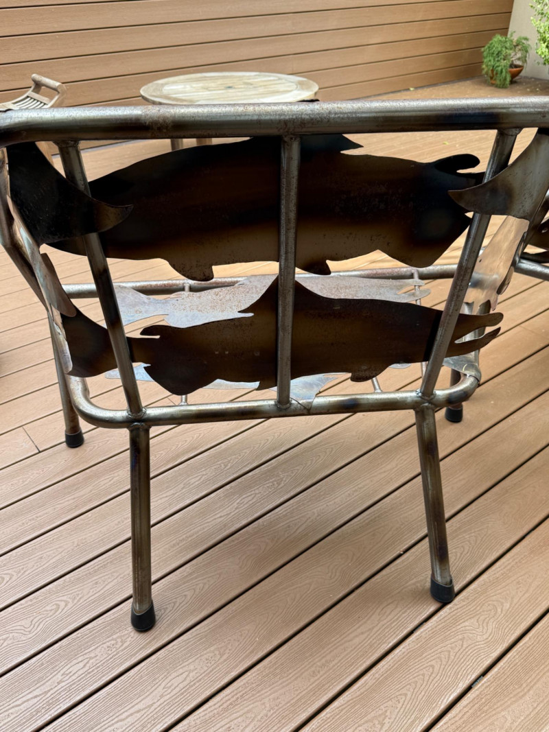 Handcrafted Metal Bench and Chair Set with Salmon Cutout Art – Pacific Northwest Artisan Design Description:
