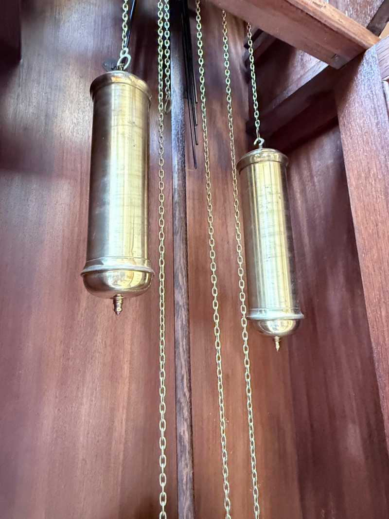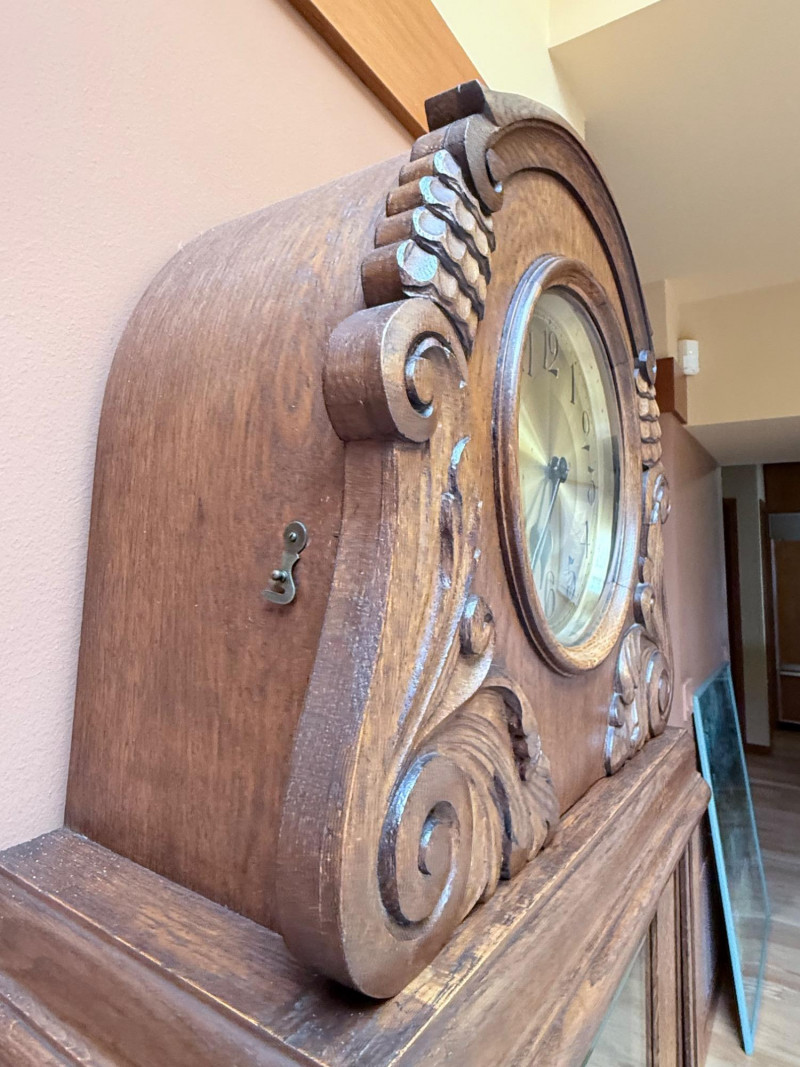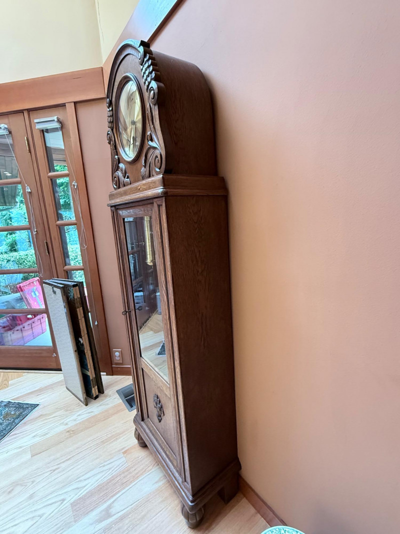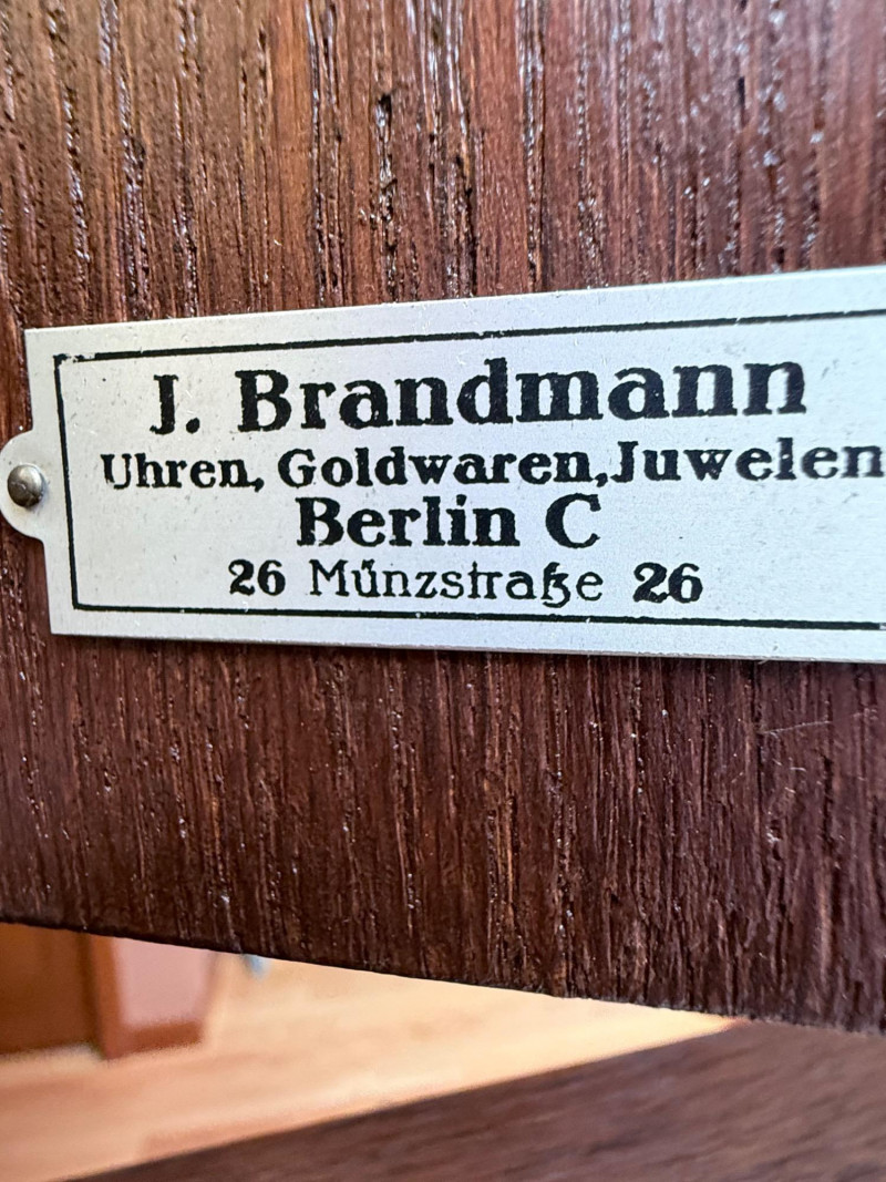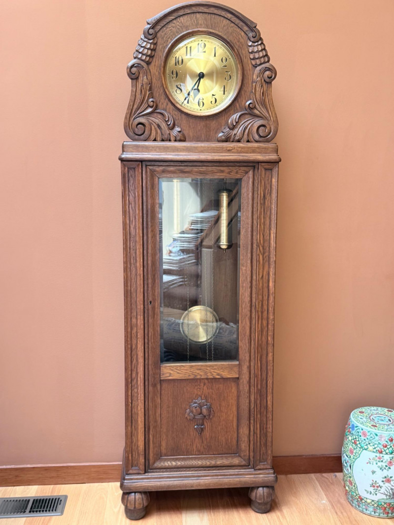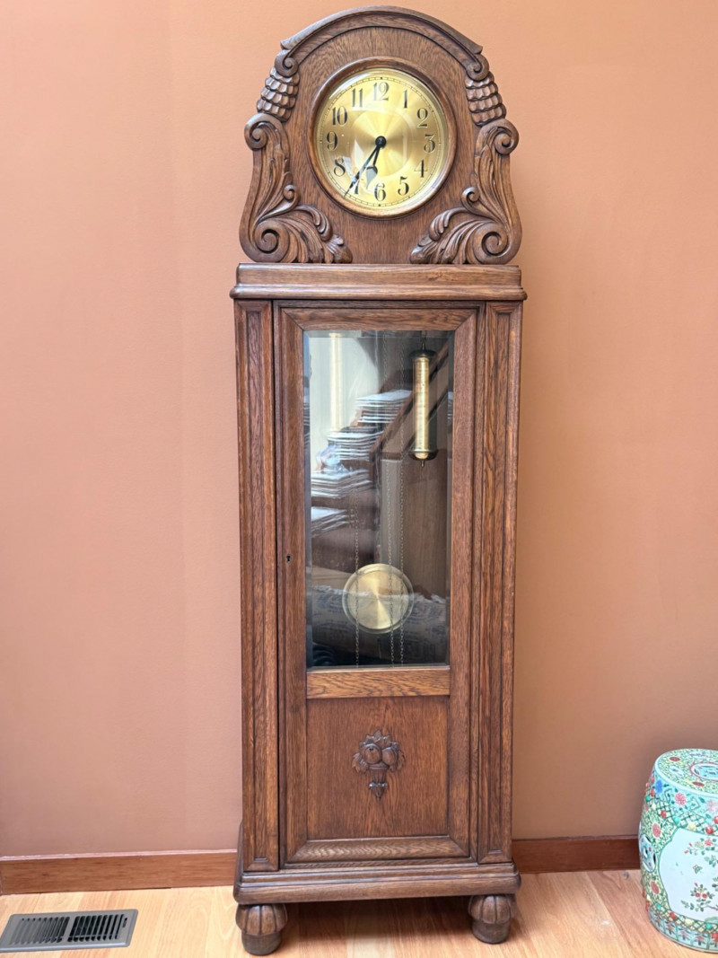 J. Brandmann Grandfather Clock, Berlin — 76" Tall Freestanding grandfather clock housed in a wooden case with glass-paneled door, carved scrollwork, and a floral relief panel. The arched bonnet features volute and pinecone carvings flanking a circular dial. The dial has stylized Arabic numerals and blued steel hands set on a brass-toned face. The clock operates with a weight-driven mechanical movement using two cylindrical brass weights and a large round pendulum suspended on chains. An interior plaque reads: “J. Brandmann, Uhren, Goldwaren, Juwelen, Berlin C, Münzstraße 26.” Dimensions (approx.): *This item is in a different location. It is located in Gig Harbor. You must pick up this item in Gig Harbor. You will coordinate with Chris 206-290-7918 if you win this bid.
