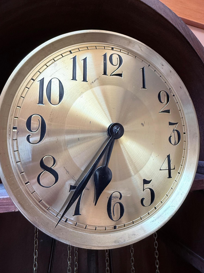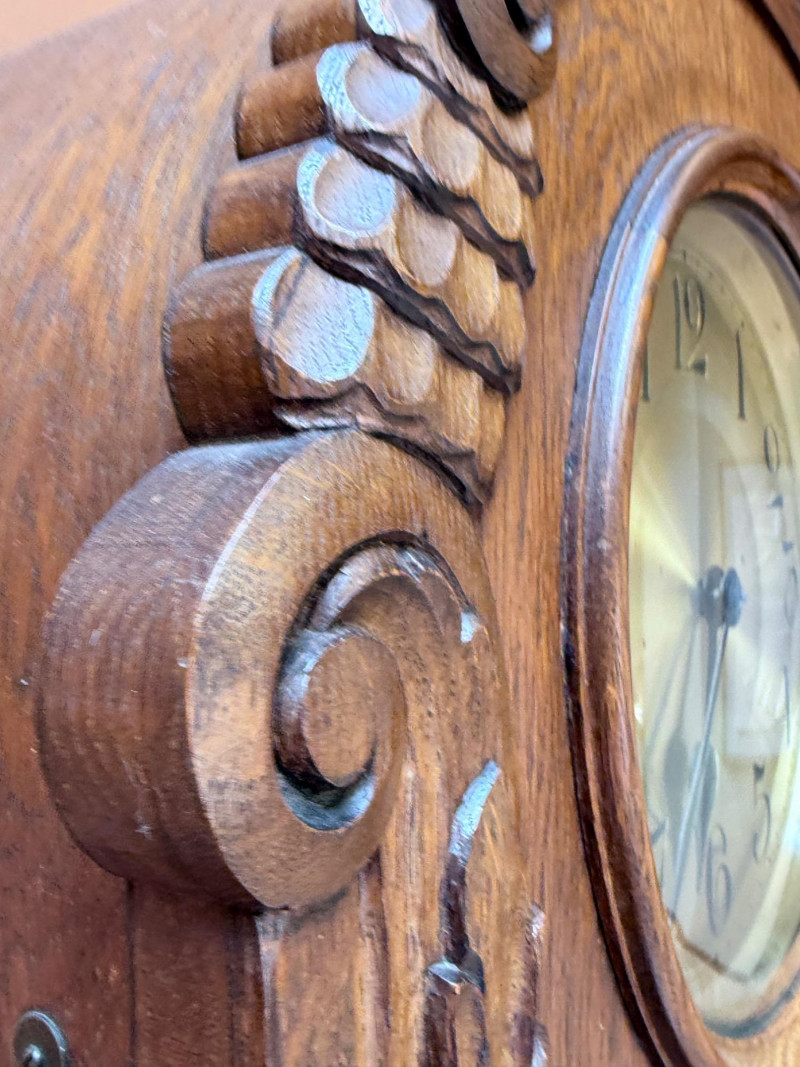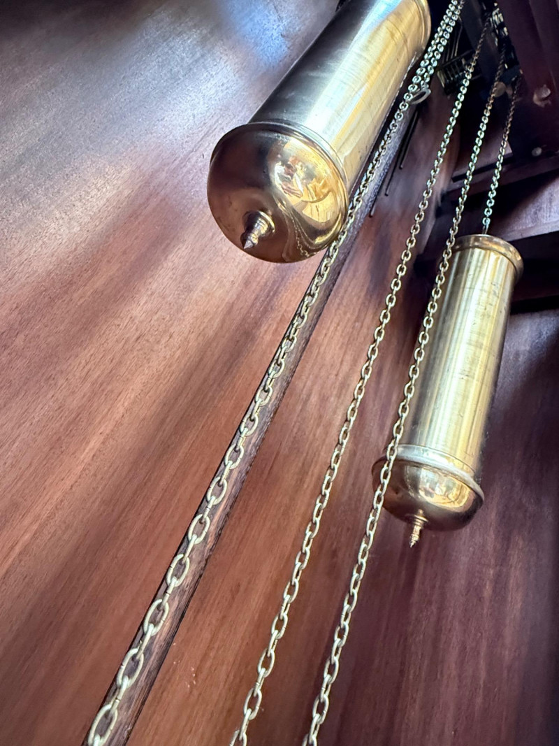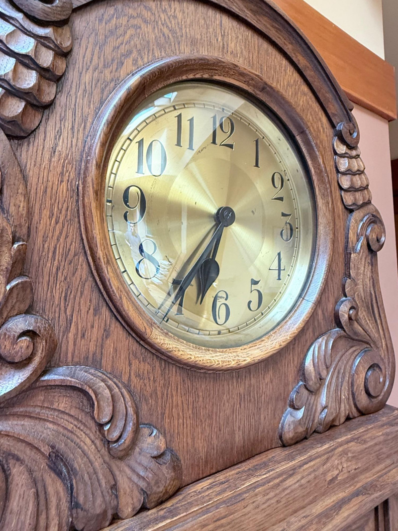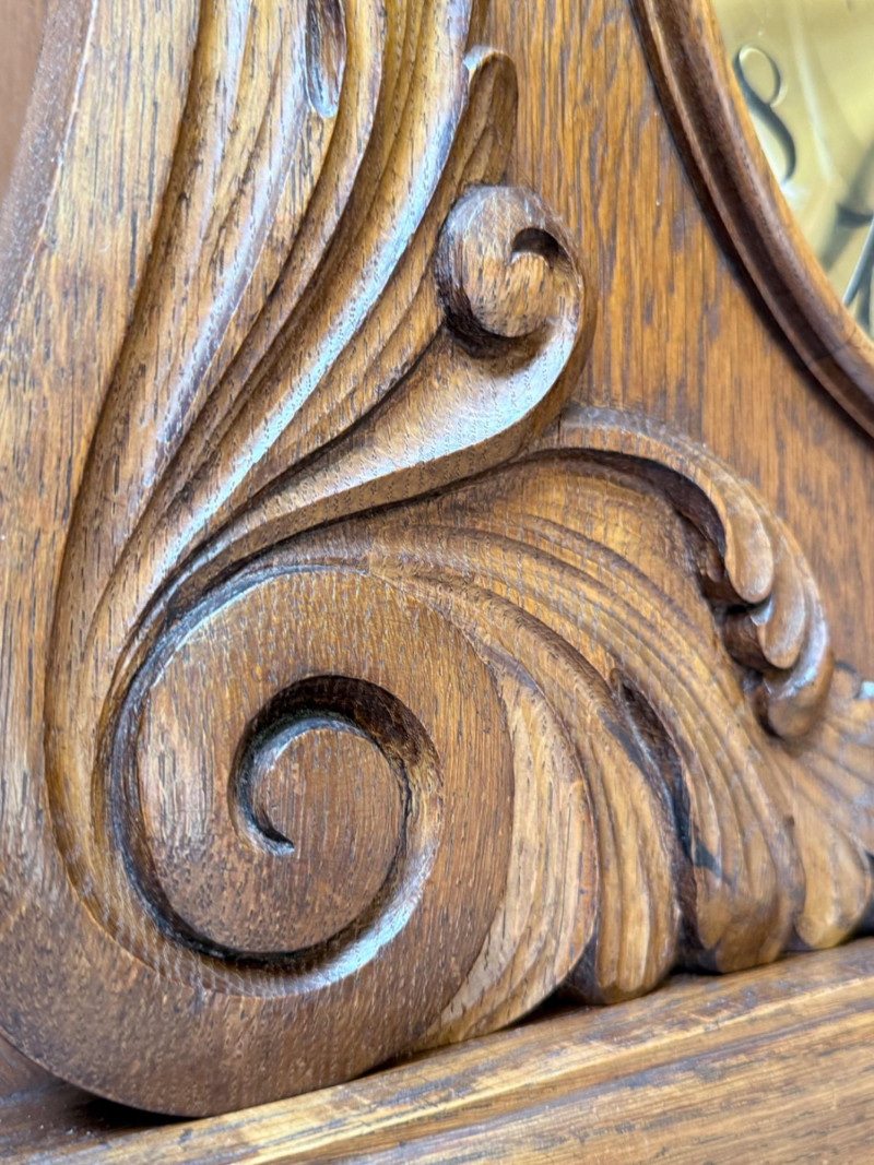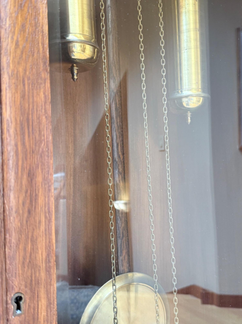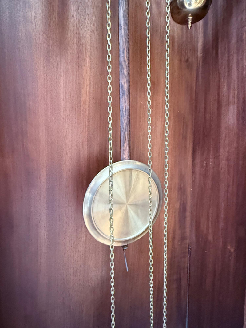 J. Brandmann Grandfather Clock, Berlin — 76" Tall Freestanding grandfather clock housed in a wooden case with glass-paneled door, carved scrollwork, and a floral relief panel. The arched bonnet features volute and pinecone carvings flanking a circular dial. The dial has stylized Arabic numerals and blued steel hands set on a brass-toned face. The clock operates with a weight-driven mechanical movement using two cylindrical brass weights and a large round pendulum suspended on chains. An interior plaque reads: “J. Brandmann, Uhren, Goldwaren, Juwelen, Berlin C, Münzstraße 26.” Dimensions (approx.): *This item is in a different location. It is located in Gig Harbor. You must pick up this item in Gig Harbor. You will coordinate with Chris 206-290-7918 if you win this bid.
