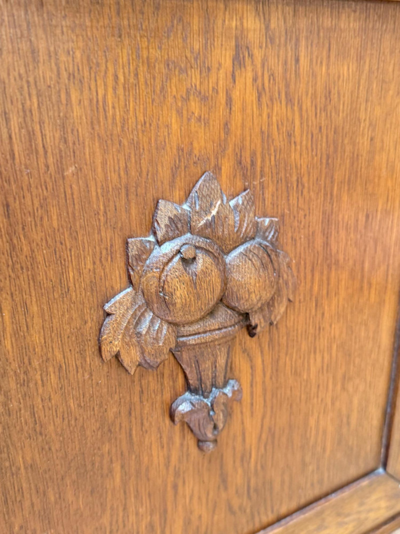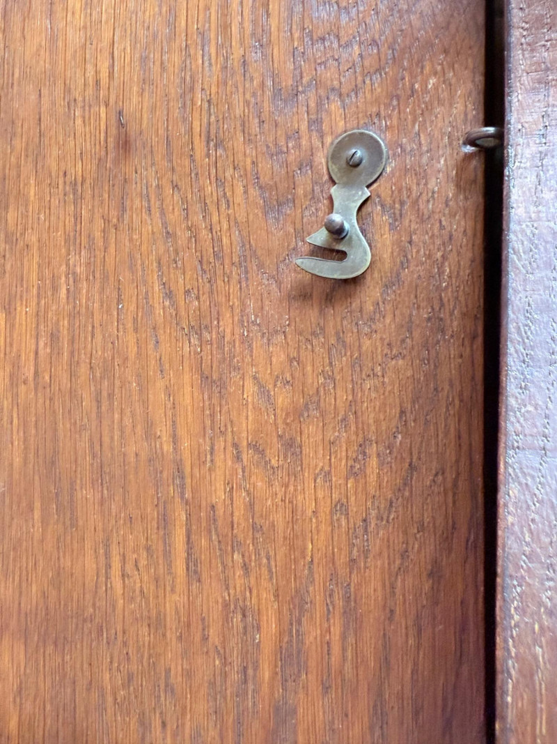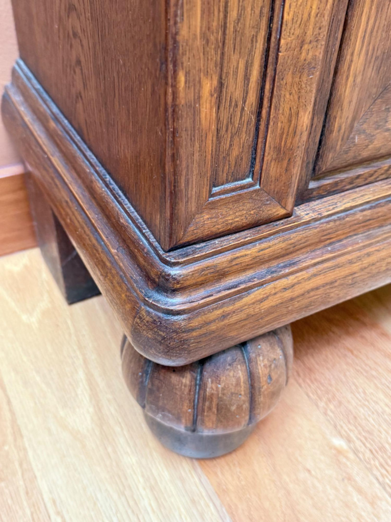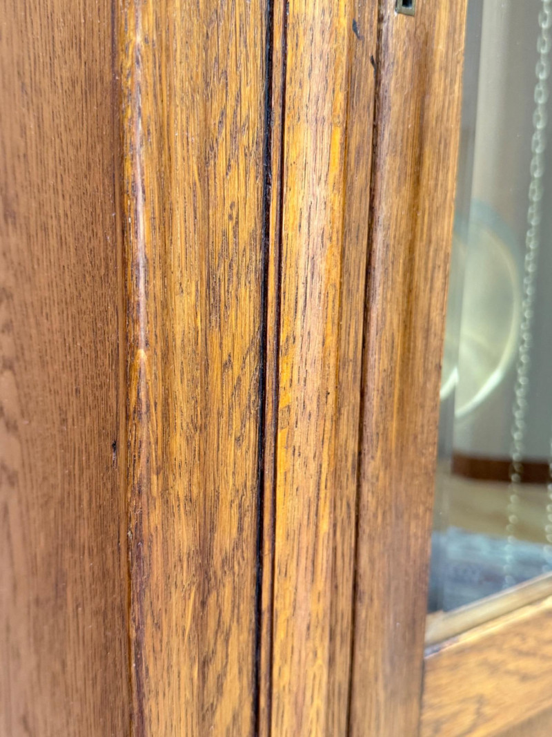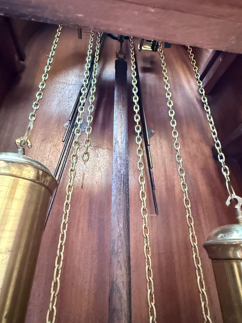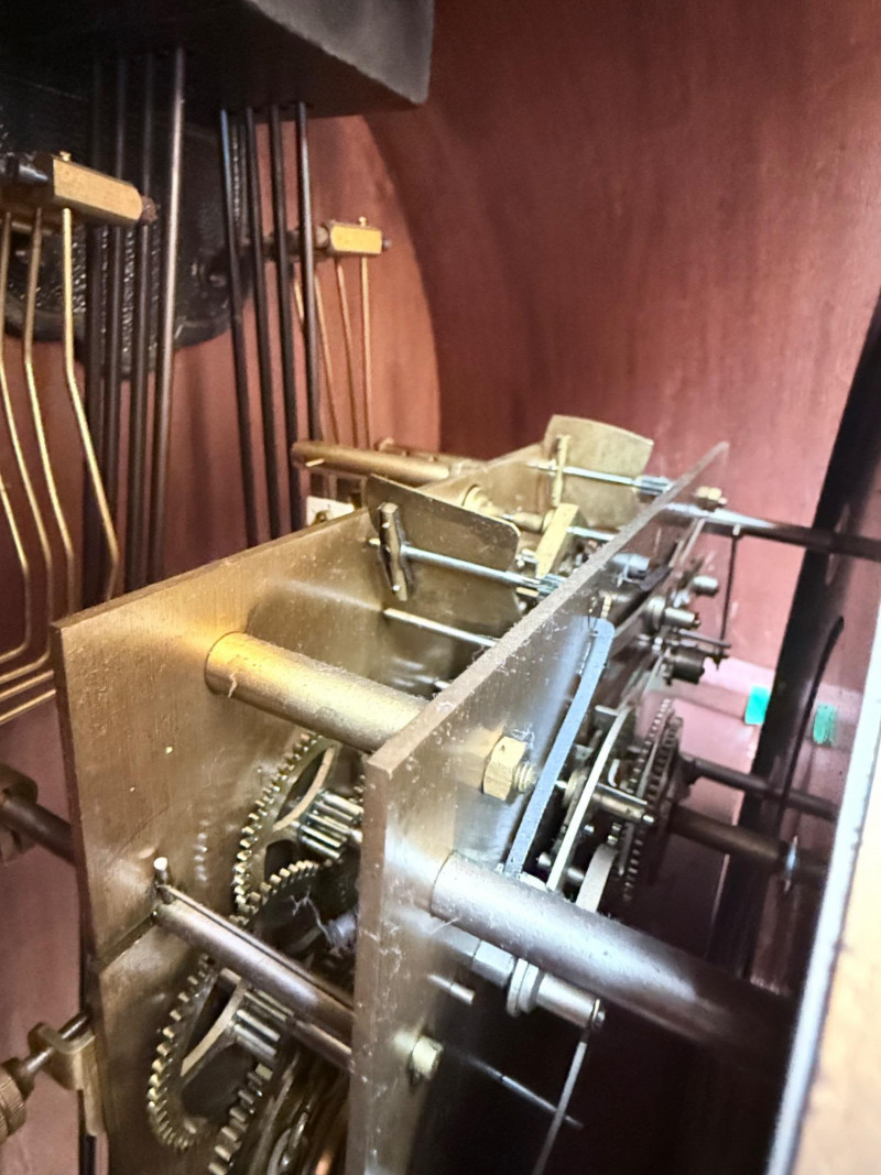 J. Brandmann Grandfather Clock, Berlin — 76" Tall Freestanding grandfather clock housed in a wooden case with glass-paneled door, carved scrollwork, and a floral relief panel. The arched bonnet features volute and pinecone carvings flanking a circular dial. The dial has stylized Arabic numerals and blued steel hands set on a brass-toned face. The clock operates with a weight-driven mechanical movement using two cylindrical brass weights and a large round pendulum suspended on chains. An interior plaque reads: “J. Brandmann, Uhren, Goldwaren, Juwelen, Berlin C, Münzstraße 26.” Dimensions (approx.): *This item is in a different location. It is located in Gig Harbor. You must pick up this item in Gig Harbor. You will coordinate with Chris 206-290-7918 if you win this bid.