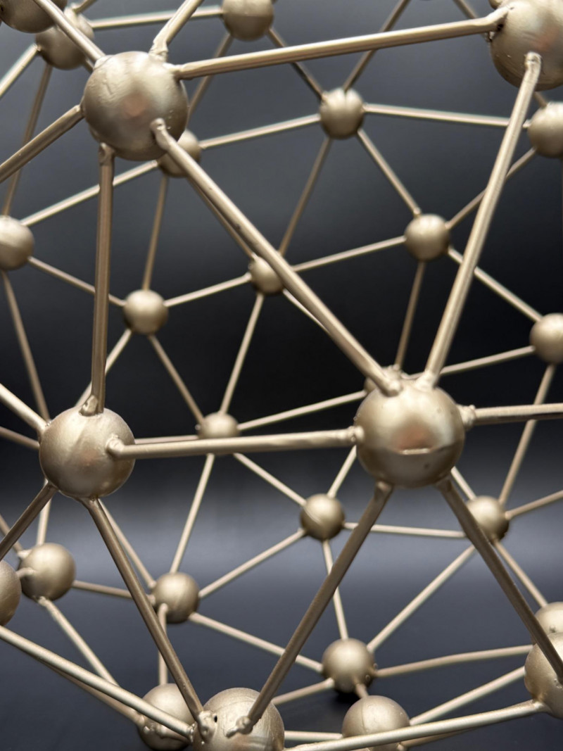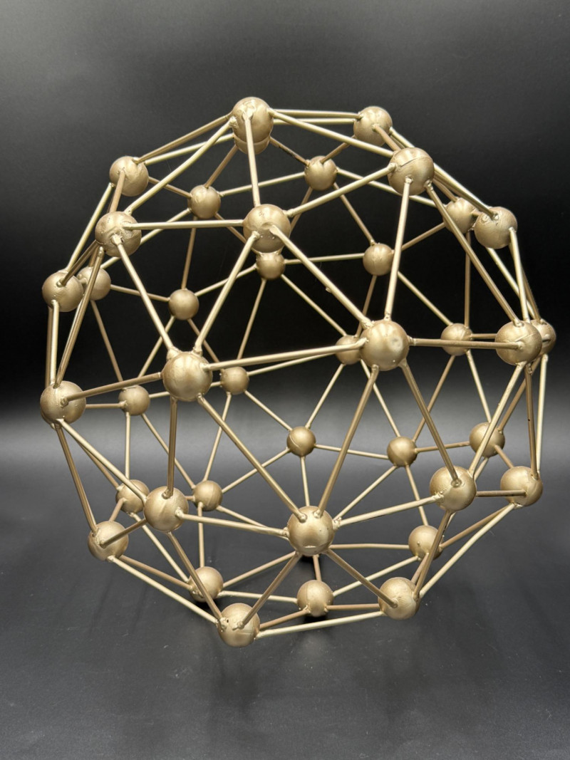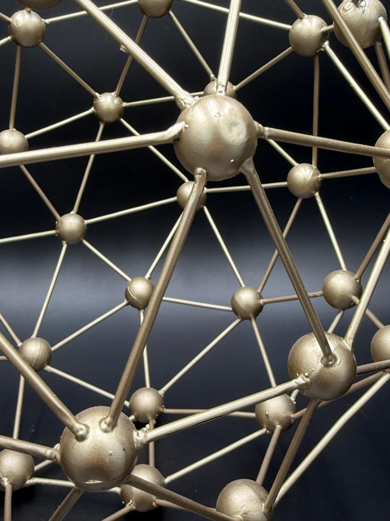 This eye-catching contemporary metal sculpture features an intricate openwork sphere constructed from interconnected rods and nodes, forming a complex geometric lattice. With its bold, architectural aesthetic, this piece makes a dramatic statement as modern art or sculptural décor.